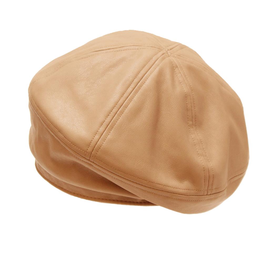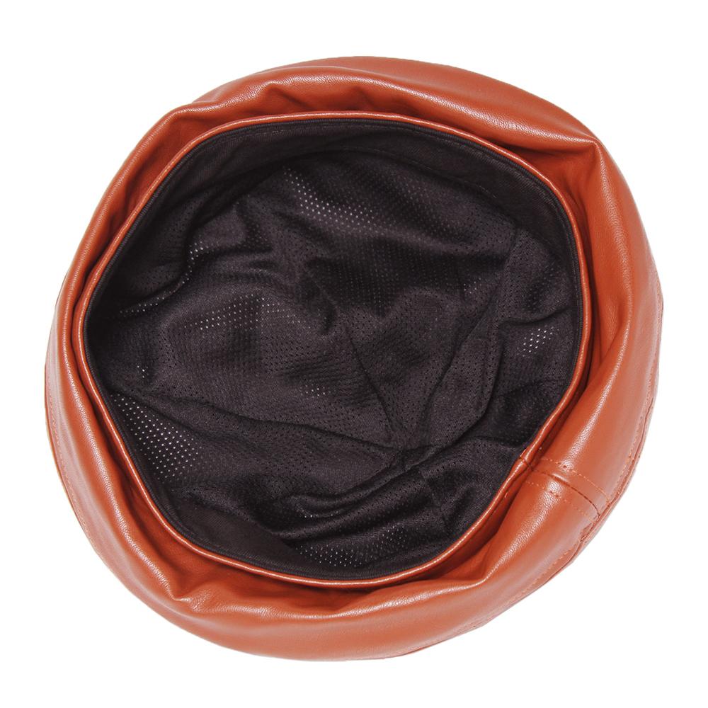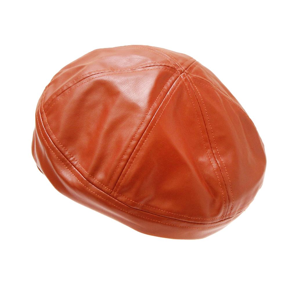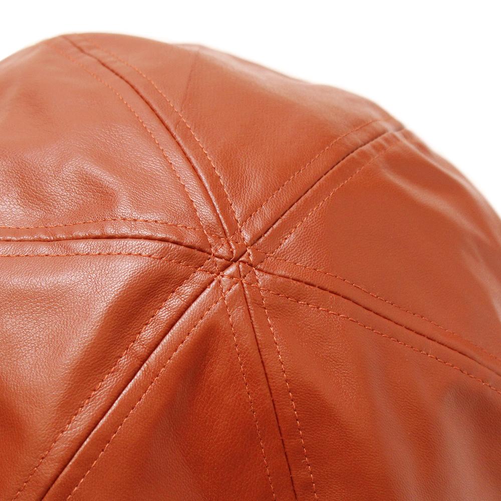 丸いシルエットのエコレザーを使用したベレー帽。重心を横にずらして被るのがおすすめ。男性も女性も使いやすい、コーデに馴染む秋冬ベレーです。内側にあるすべりの裏側には、サイズを調節して頂けるテープが付いていますのでご自分のサイズ感で被って頂けます。