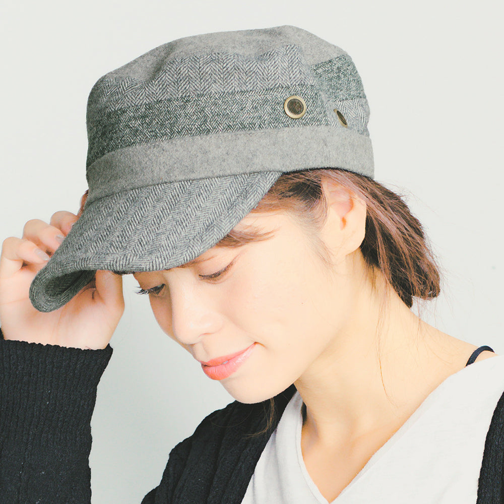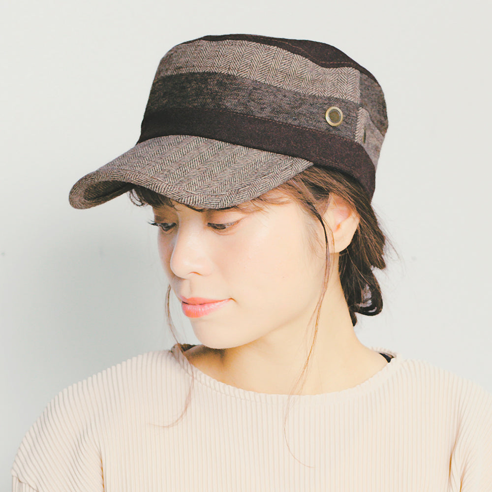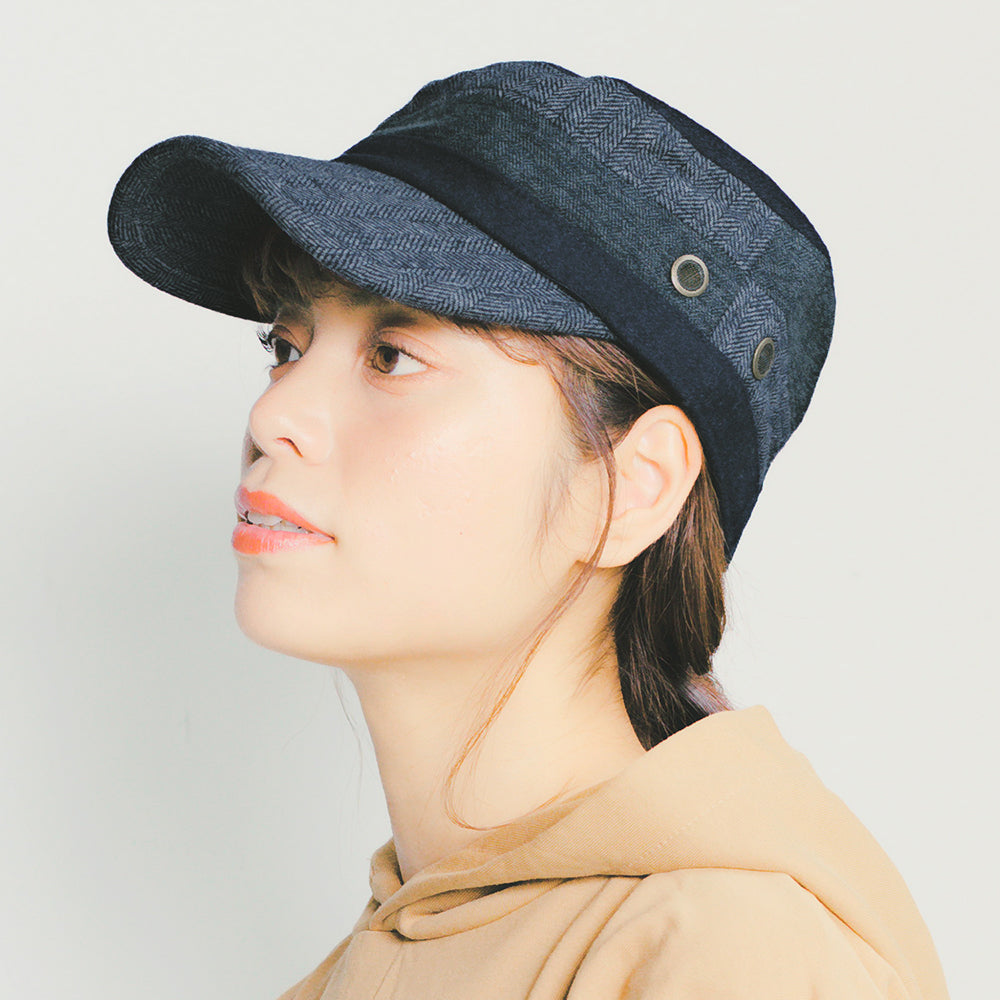 ヘリンボーン柄などの異素材を組み合わせた、おしゃれなワークキャップ。ウールの素材感が秋冬にぴったりの温かさを感じさせてくれます。シンプルなデザインなので、スタイルを選ばず合わせやすくサイドの通気性を意識したハトメがアクセントになっていて、さりげないこだわりを感じさせるおしゃれなデザインです。