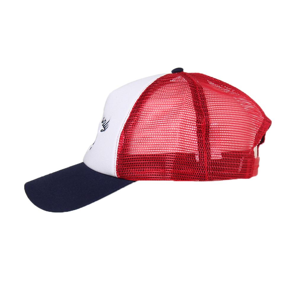 インパクトのあるフロントとつばのロゴ刺繍が印象的なメッシュキャップです。扱いやすいカラーに、ロゴ刺繍もワンカラーで統一されていますのでコーデを邪魔せずしっかり惹き立てます。フロント以外にはメッシュ素材を使用していますので、通気性に優れ爽やかで軽やかな被り心地です。しっかりした作りなので、型崩れしにくく安定して被ることができます。