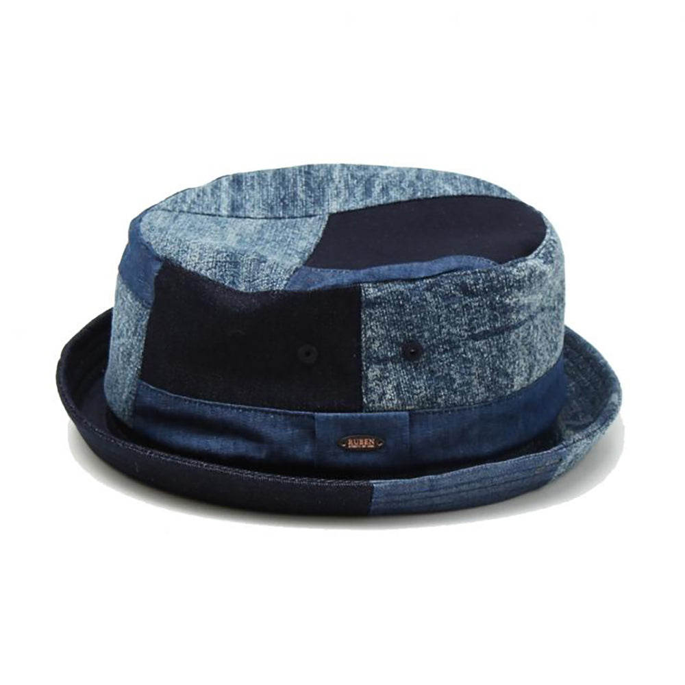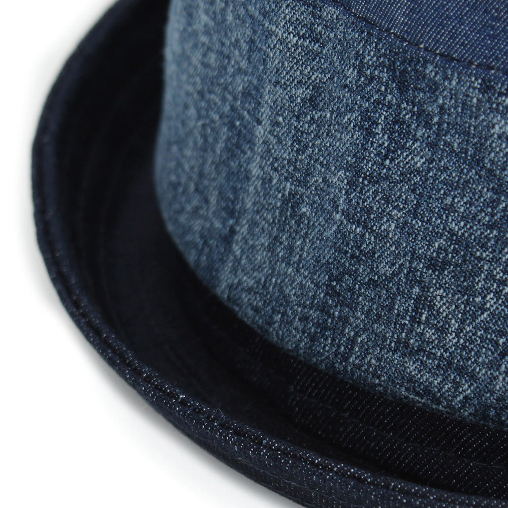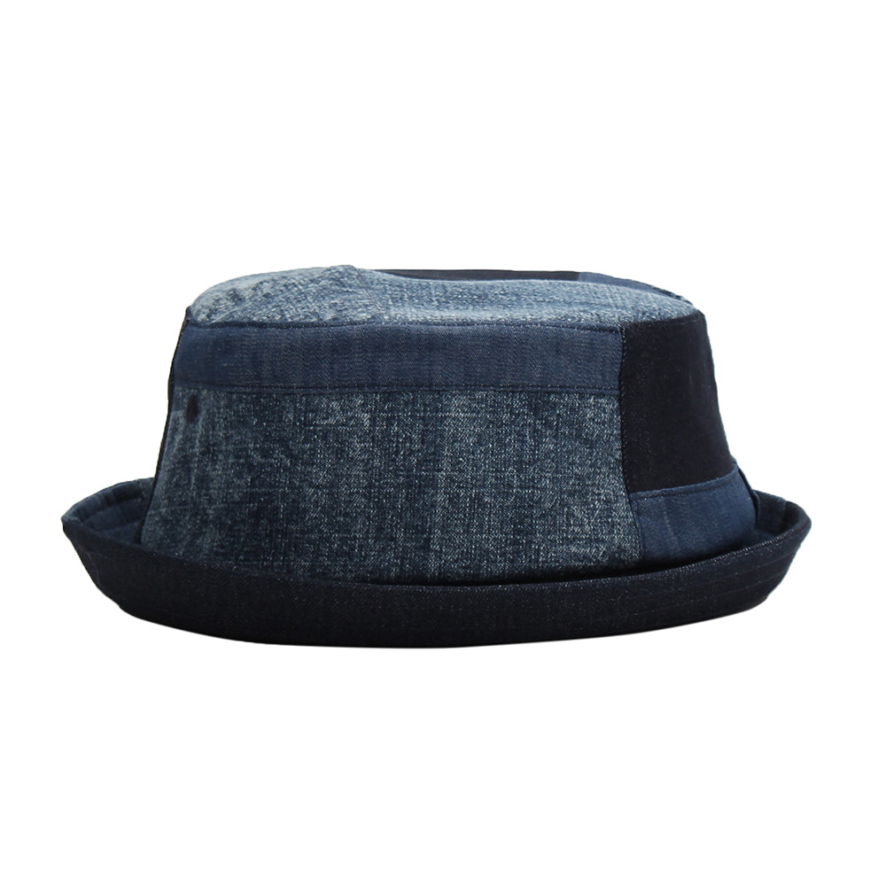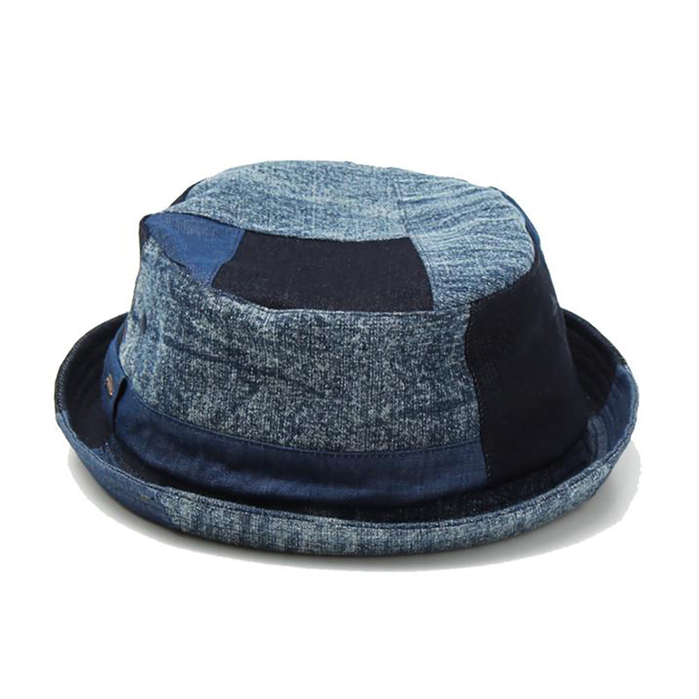 外側にはデニム素材のパッチワーク、内側には通気性に優れたメッシュ地を使用し、被り心地抜群のポークパイハットです。生地は柔らかく、くたくたとした素材感ながら、ツバがしっかりしているので被った時の安定感もバッチリです。