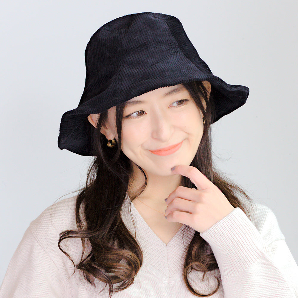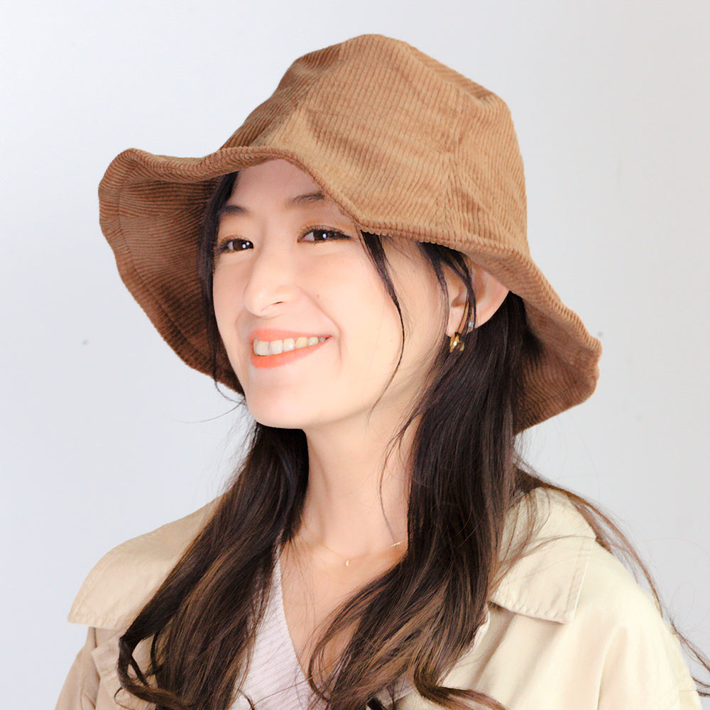 あたたかみのあるコーデュロイ素材がおしゃれなチューリップハットです。ひらひらと大きなつばがどこかレトロな印象で、存在感たっぷり。サッとかぶるだけで秋冬コーデの主役になってくれます。裏地を付けてあるので、とてもサラリとした被り心地。つば先にはワイヤーが入っていますので、お好みの形にしていただけます。