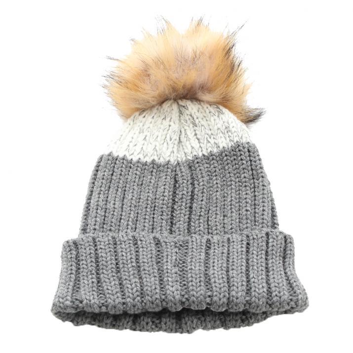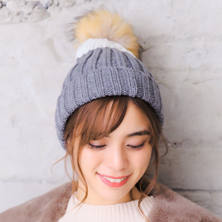 ふわふわニットのボリューム感にトップのファーボンボンが存在感抜群の秋冬ニット帽です。太糸でツートンにざっくり編みし、伸縮性に優れ、優しい被り心地に保温性も抜群!少しミックス感ある毛糸で、シンプルなカラーでもどこか熟れた雰囲気に。