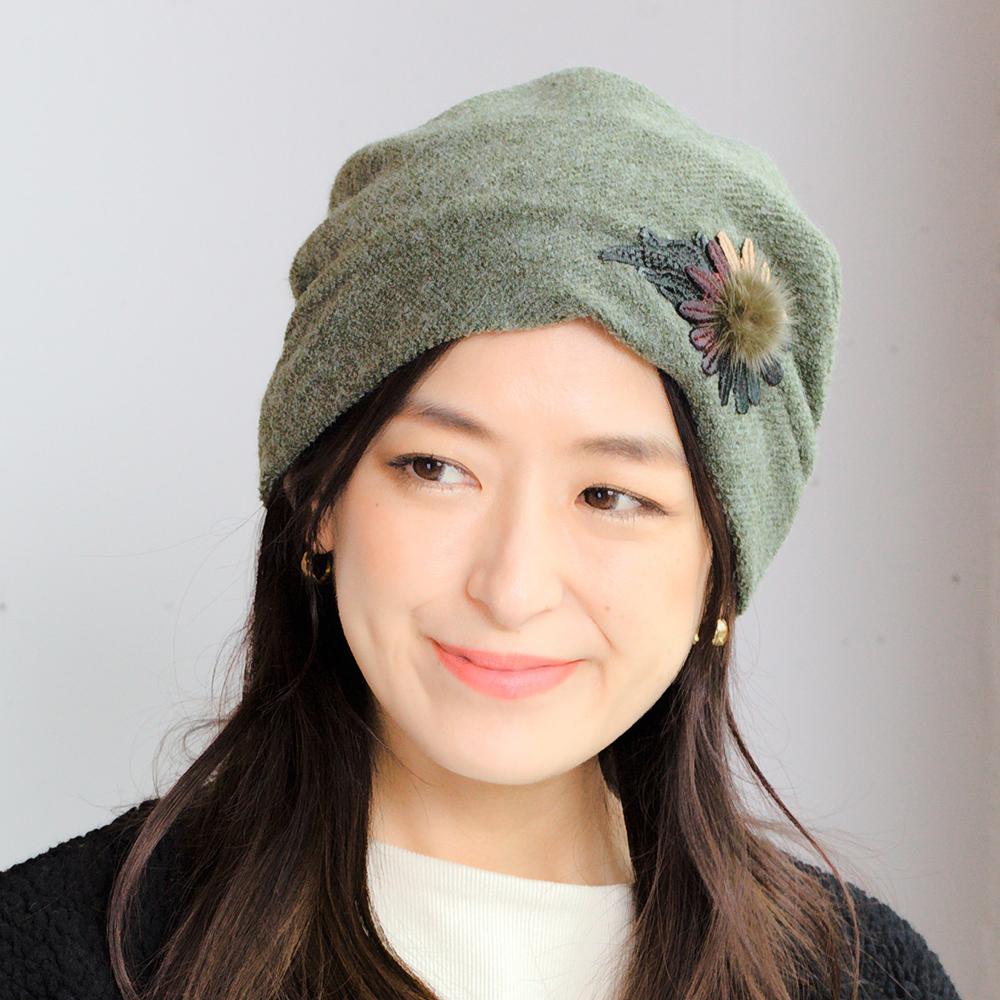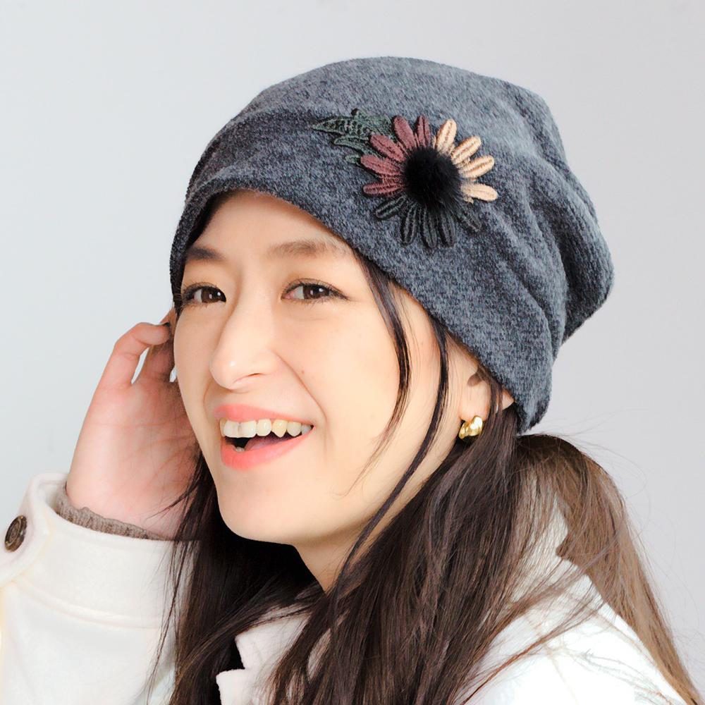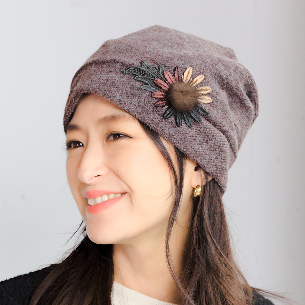 シンプルなデザインに、ワンポイントのタックと可愛い花の刺繍をあしらって。秋冬にぴったりのレディースニット帽です。温かみのあるフワフワした手触りのニット帽は、あったかな裏地も着けてあり、フードのように深くかぶれば防寒は完璧。ワンポイントの花刺繍は、中央にファーを着けて可愛らしい印象。女性らしいデザインとシックなカラーが秋冬に寄り添ってくれます。