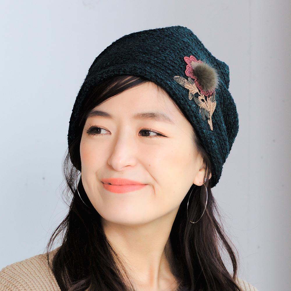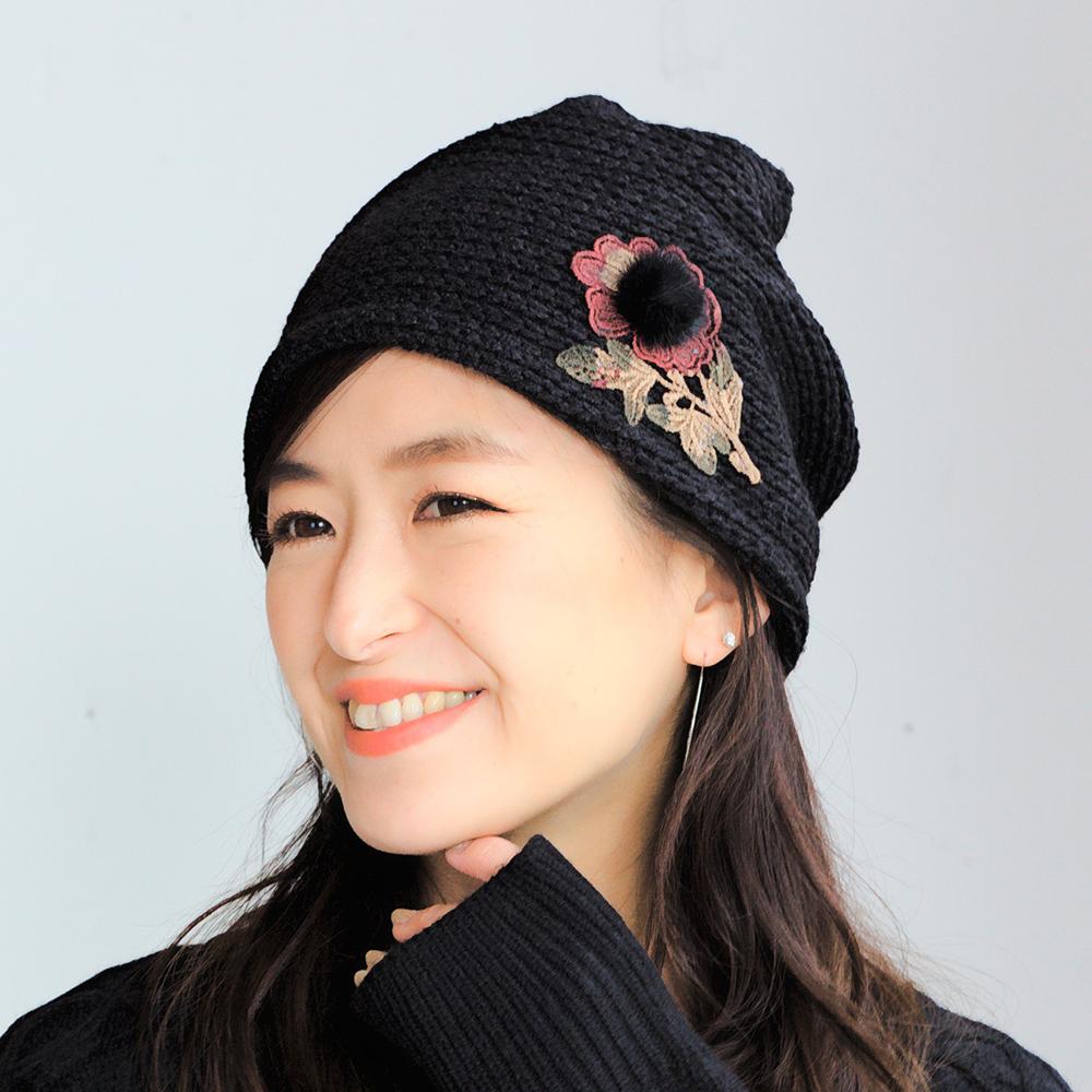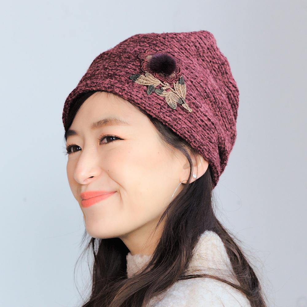 花モチーフが可愛いおしゃれで暖かなニット帽です。サイドに入れたお花の刺繍と、シルエットを綺麗に見せるバックの折り重ねがポイント。帽子の後ろを軽く折り重ねてまとめることで、誰でもニット帽を綺麗に被ることができます。内側には暖かな裏地を付けているので、秋冬の防寒にもぴったりです。