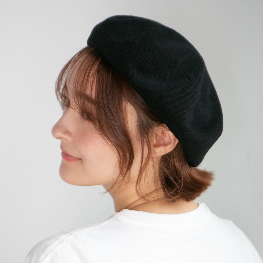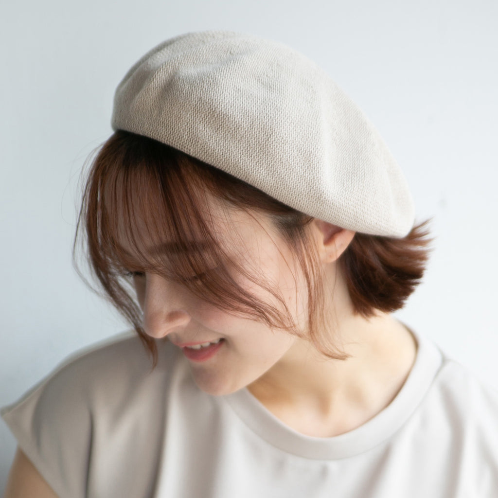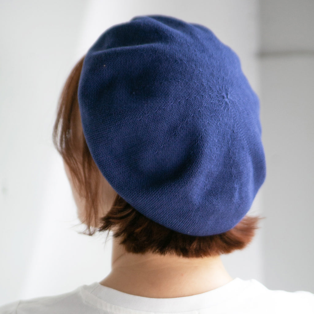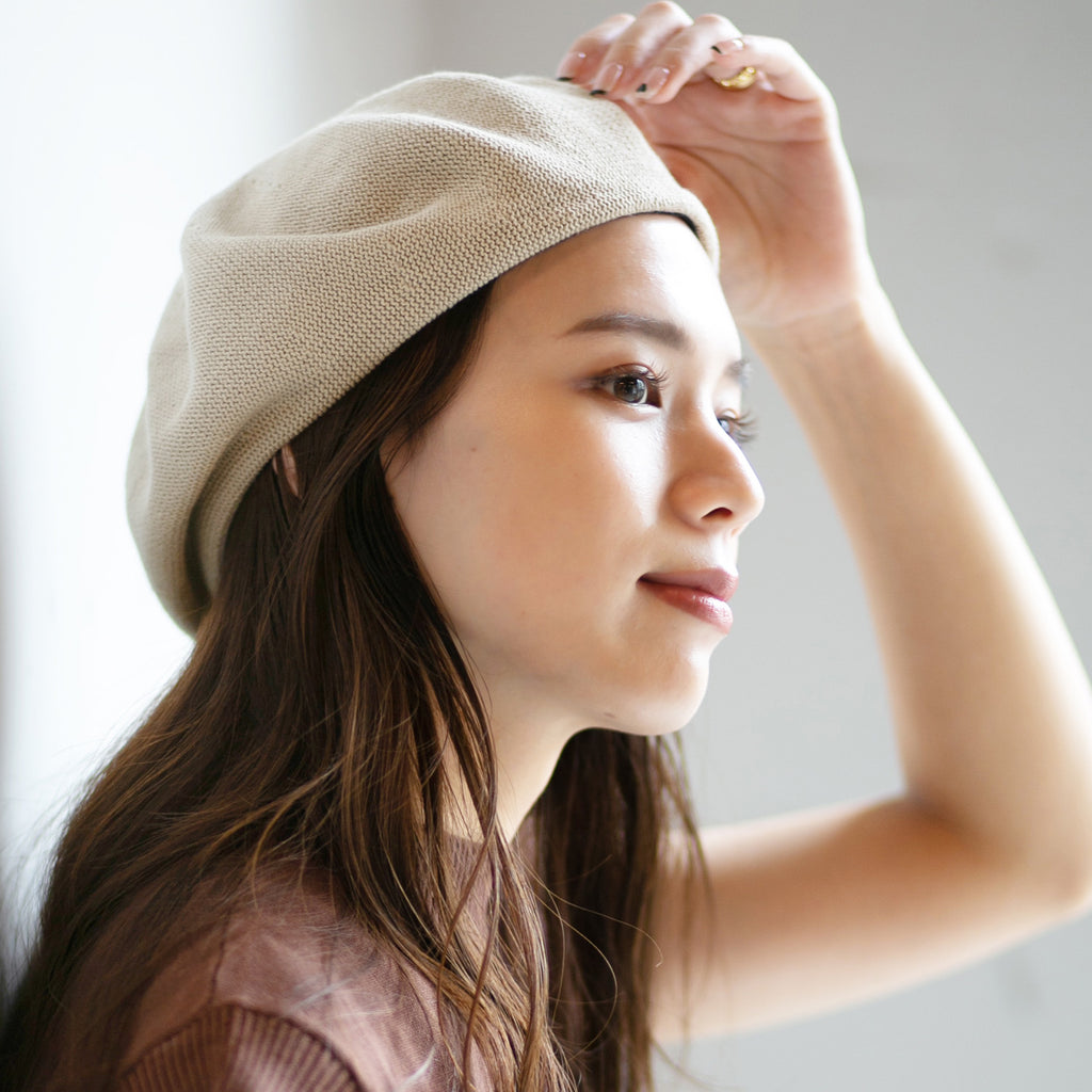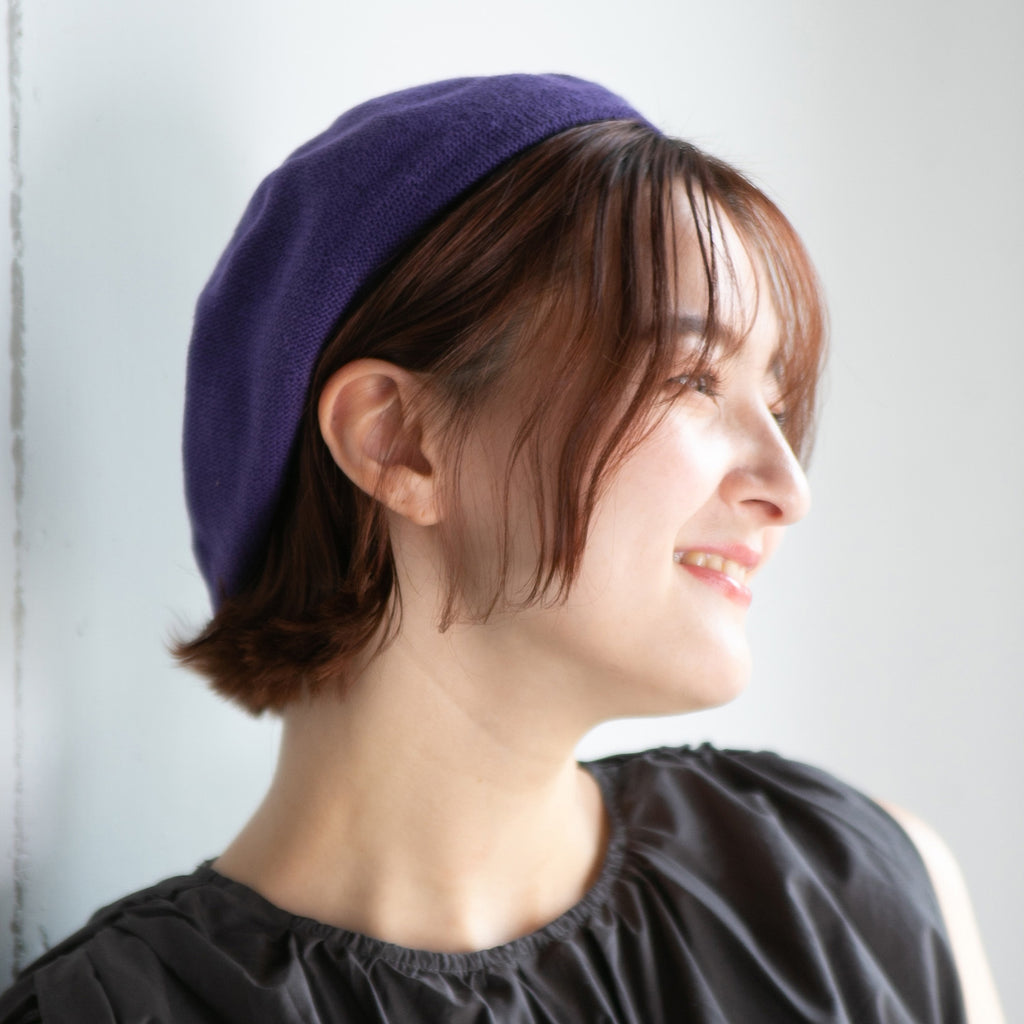 コットンニットの柔らかベレー帽です。丁度良い柔らかさで形がセットしやすく、色違いで揃えたくなる被り心地です。
