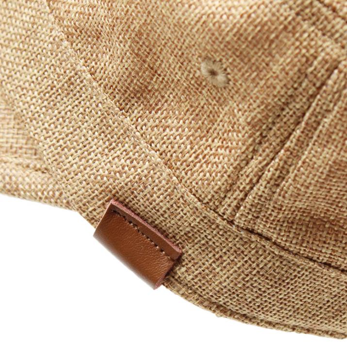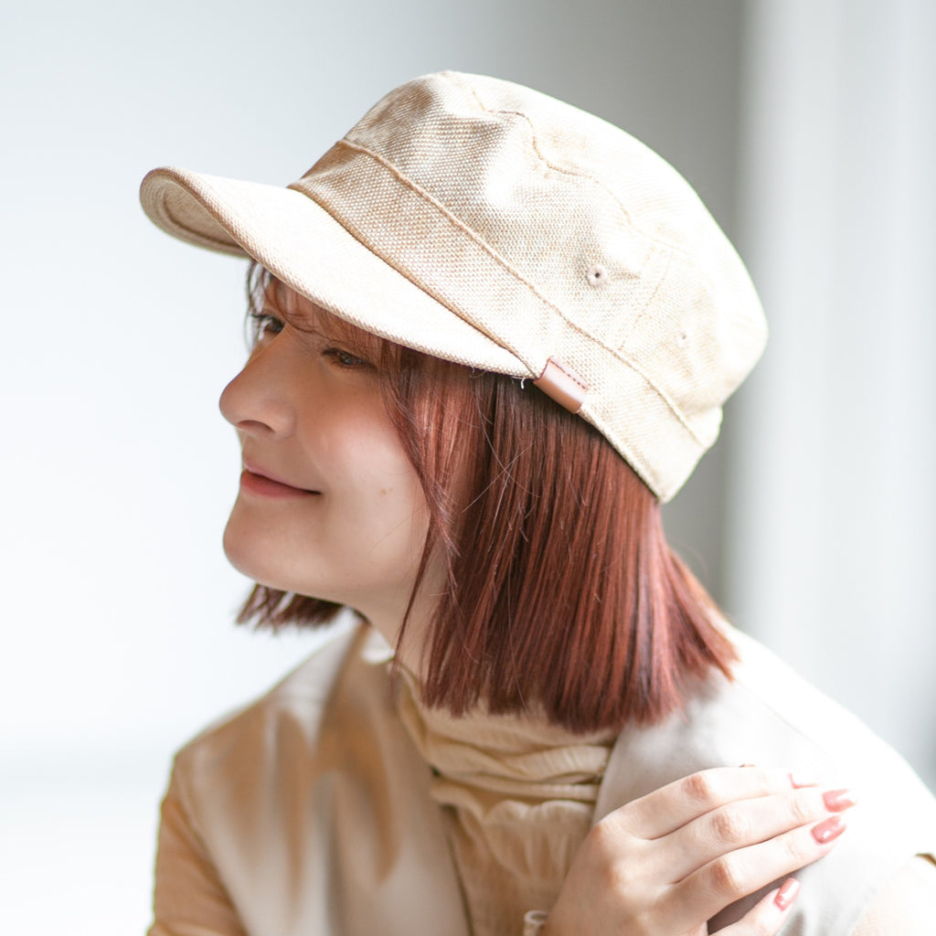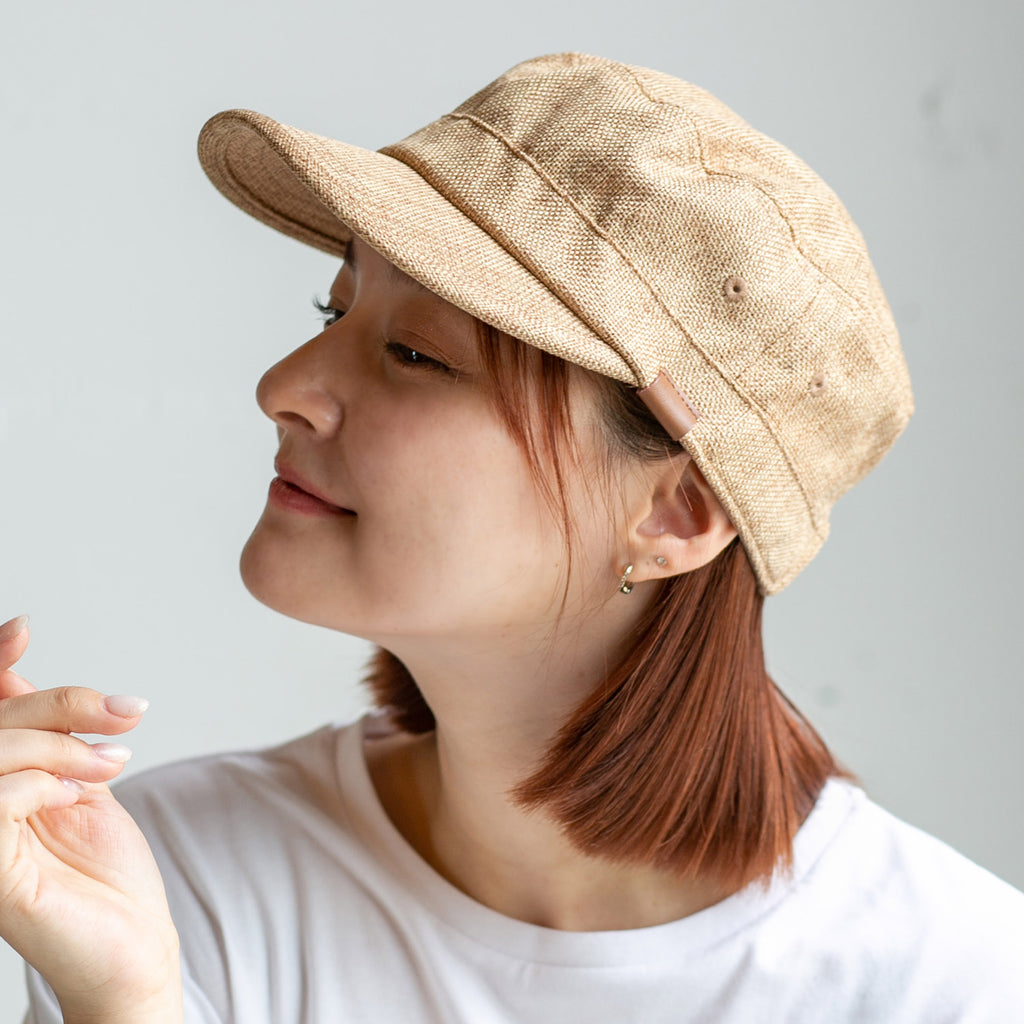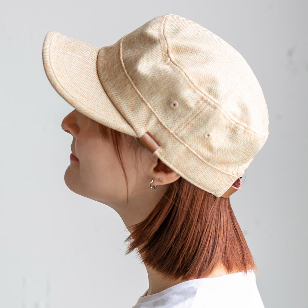 ポリジュートの中が透けてみえるため、涼しい印象のワークキャップです。皮のワンポイントがアクセントでカジュアル過ぎないので、幅広い年齢でお使い頂いています。男性はもちろん、女性にもとても人気です。キャップよりも浅く被れるのでヘヤーアレンジをよくする方も被りやすく、よりおしゃれに見えます。髪の長い方は後ろを編んだりして可愛くアレンジして被った際に、後ろの調節が皮とゴールドでおしゃれ感が引き立ちます。親子でお揃いにできるので、お子様も喜んで被ってくれます。
