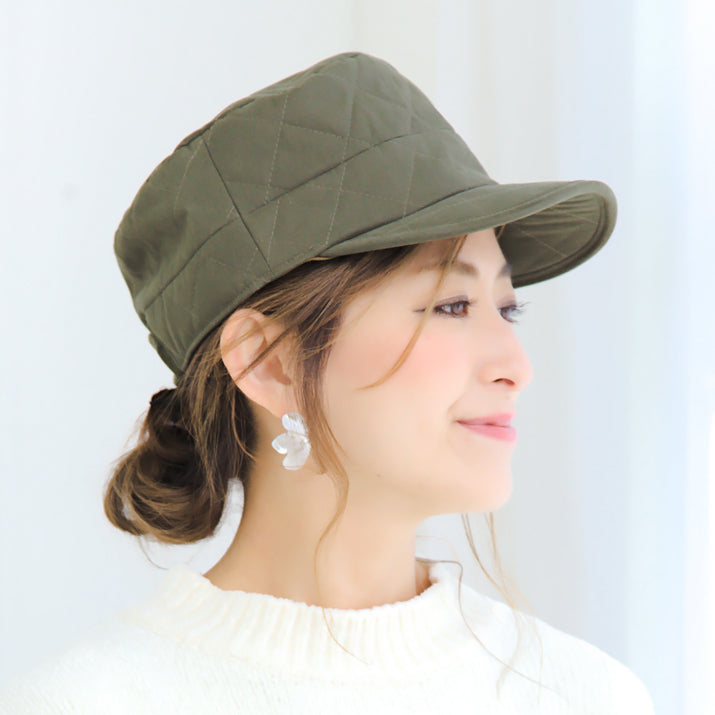 コットン混の柔らかい生地にキルティング加工を施し、秋冬の装いにピッタリなデザインに仕上げました。マットな質感に近い上品な光沢を放つデザインは、落ち着いた大人カジュアルなスタイルにも合わせやすい。後ろ部分がリブ素材になっていますので締め付け感がなく、安定感のある被り心地です。シンプルなワンカラーにキルティングデザインがコーデのポイントになる、おしゃれなワークキャップです。
