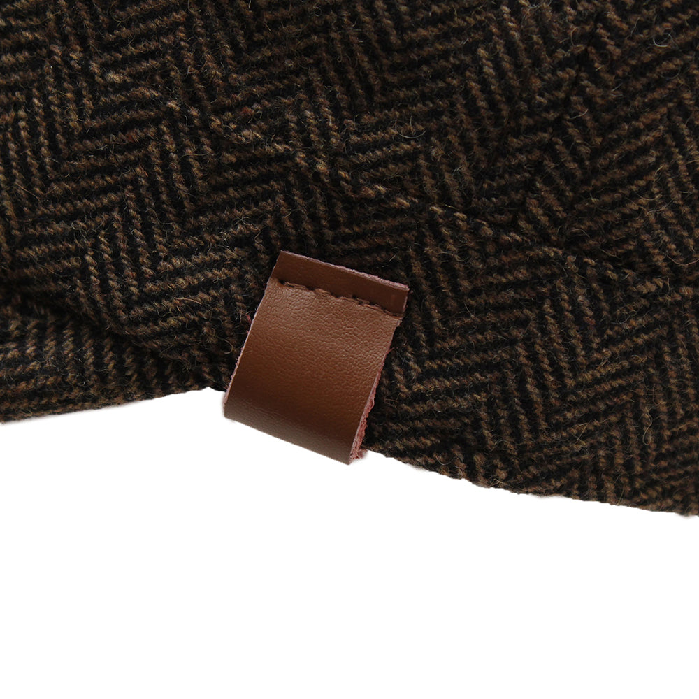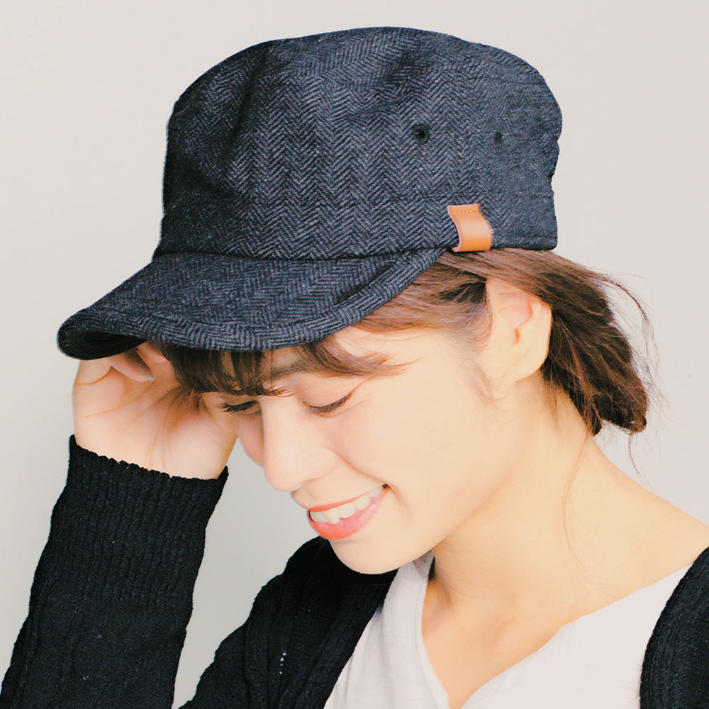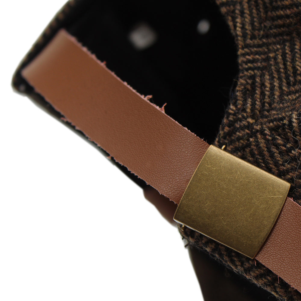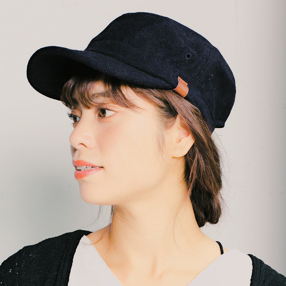 秋冬に活躍してくれる、温かみのあるヘリンボーン柄のワークキャップです。サイズ調節部分はゴールドの金具と皮ベルトでオシャレなおすすめアイテムです。