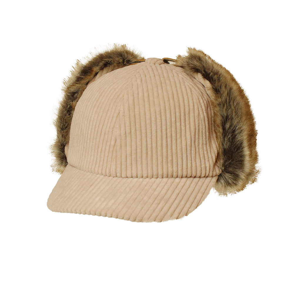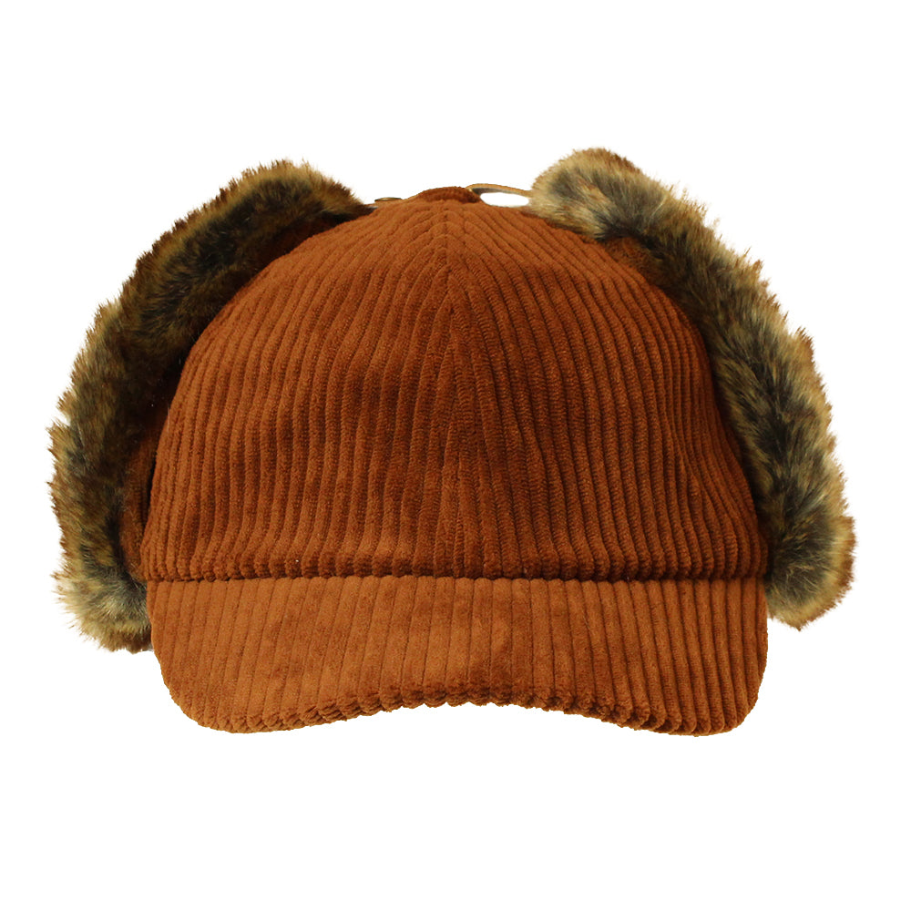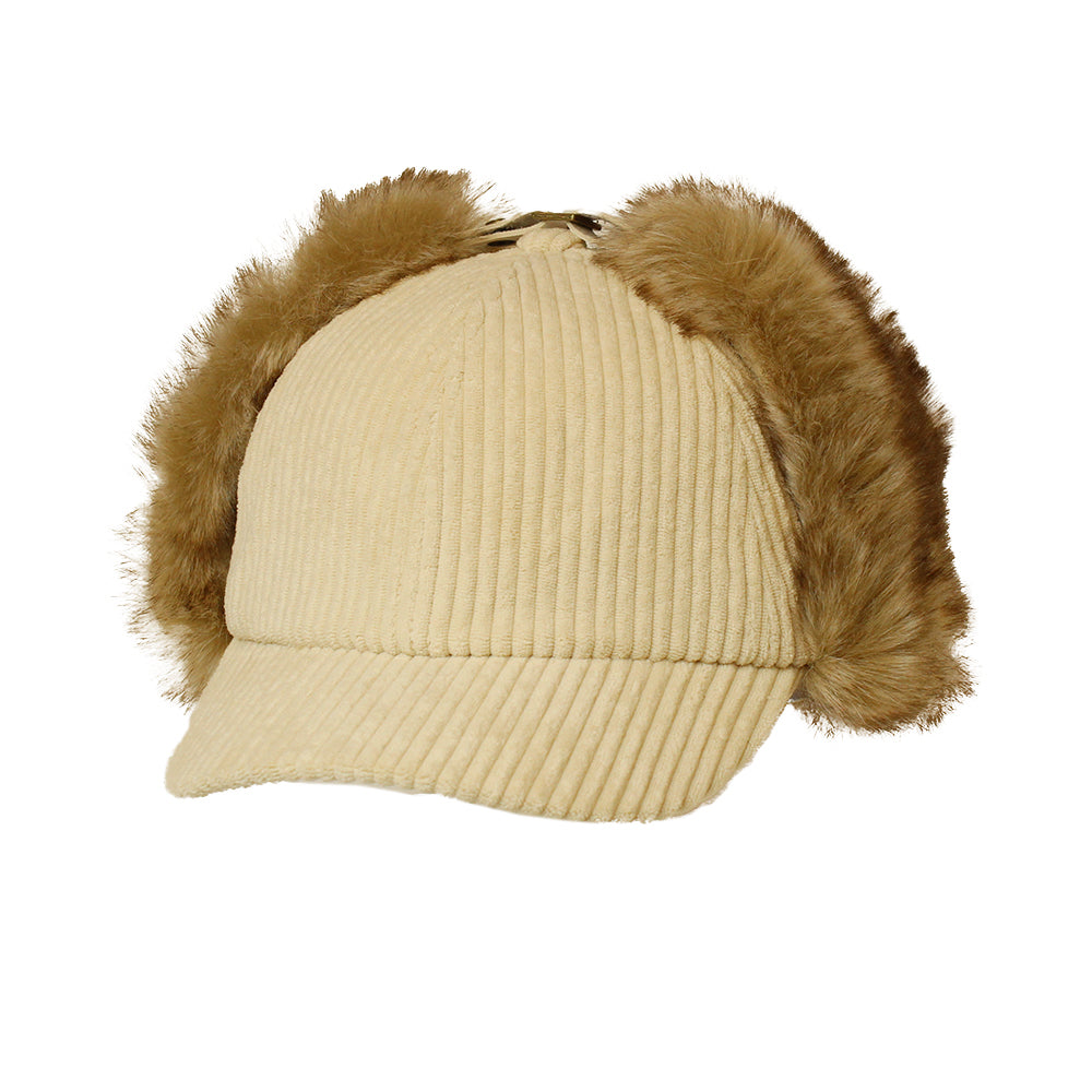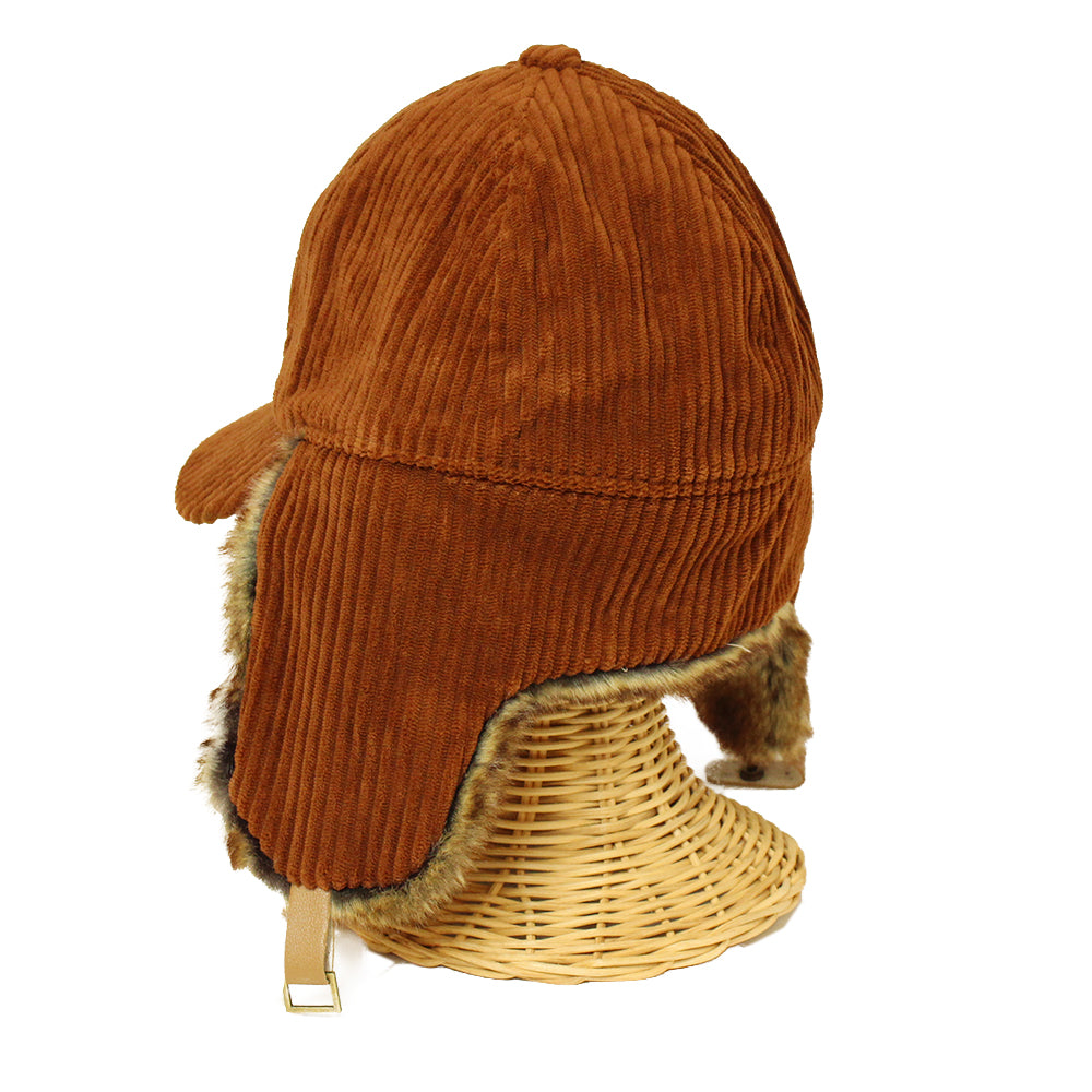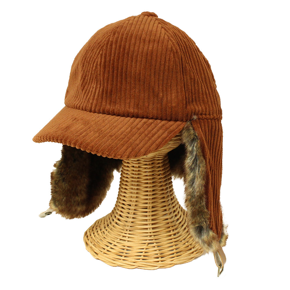 エコファーを使ったパイロットキャップ風の耳あて付きキャップです。少し太幅のコーデュロイ素材を使用し、存在感もありながら合わせやすいデザイン。一点投入でおしゃれ上級者なコーデが完成します!耳部分を留めるフェイクレザーのベルトデザインも、カジュアルスタイルの可愛いアクセントに。内側にあるすべりの裏側には、サイズを調節して頂けるテープが付いていますのでご自分のサイズ感で被って頂けます。