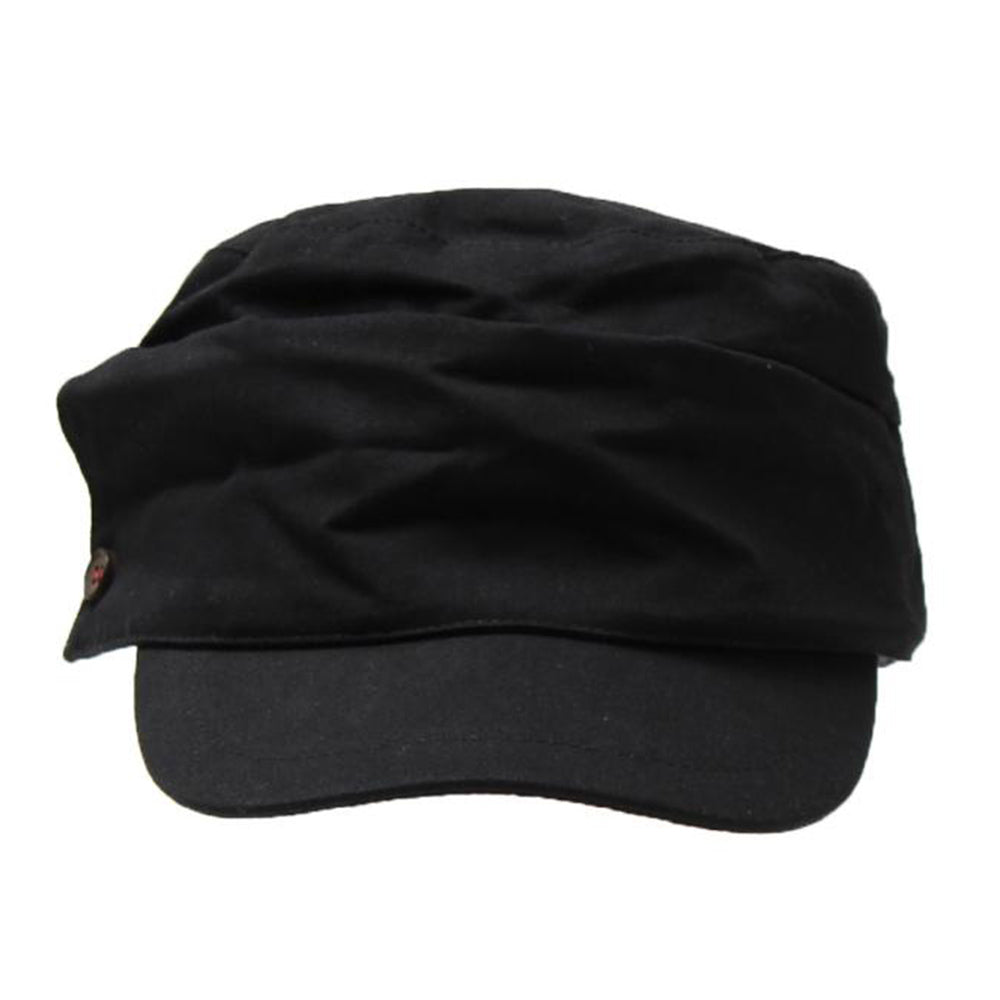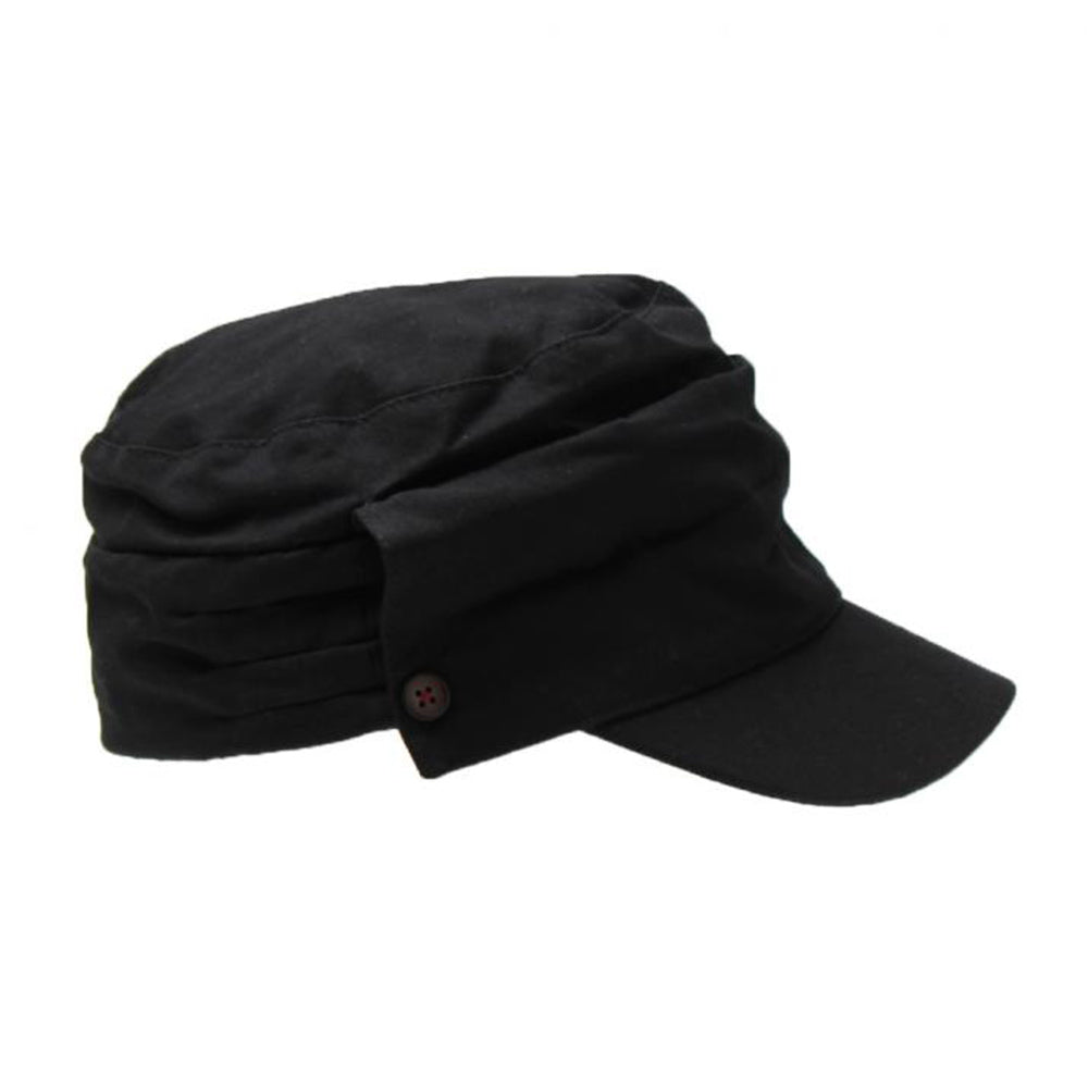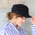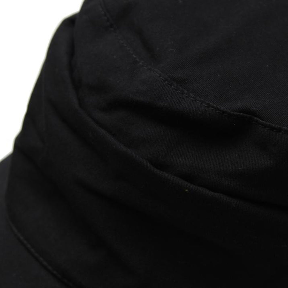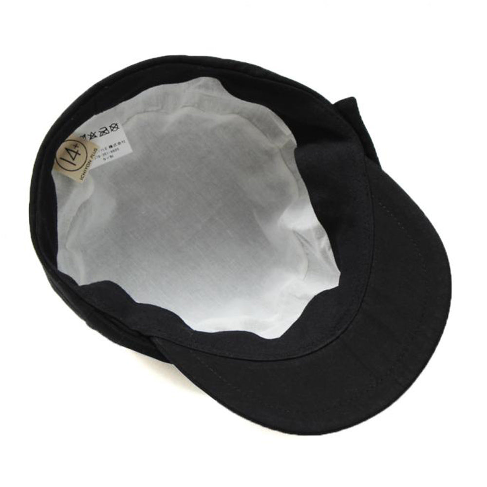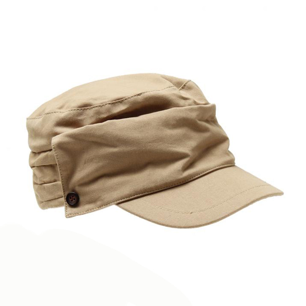 細部にまでディティールにこだわったマリンキャスケット。フロントを折り返して釦で留めたようなデザインとタックのデザインがシンプルなワンカラーの見た目にこだわりを感じさせるデザインです。コットン100%の柔らか素材で、とても優しい被り心地です。