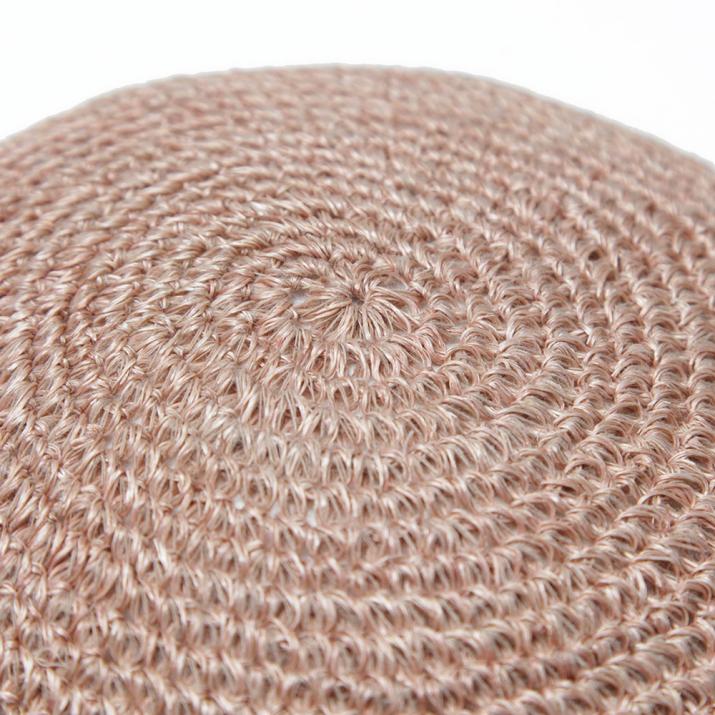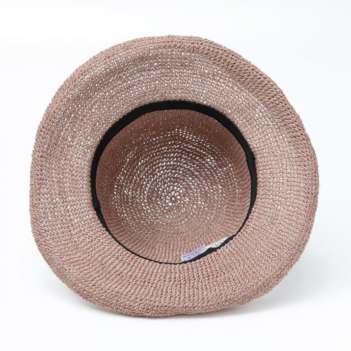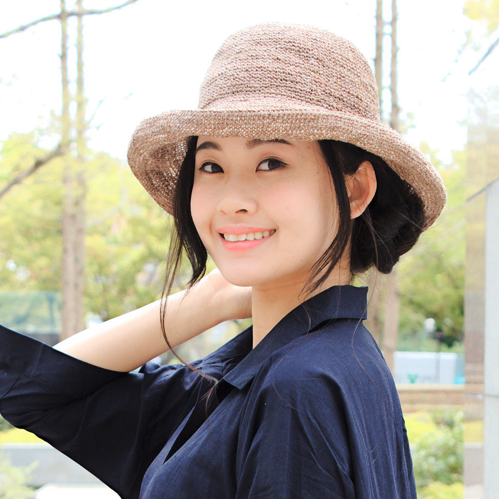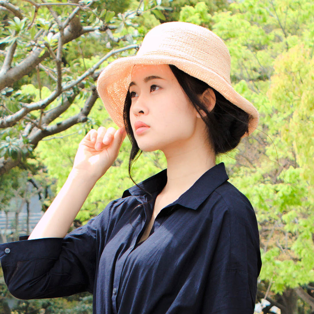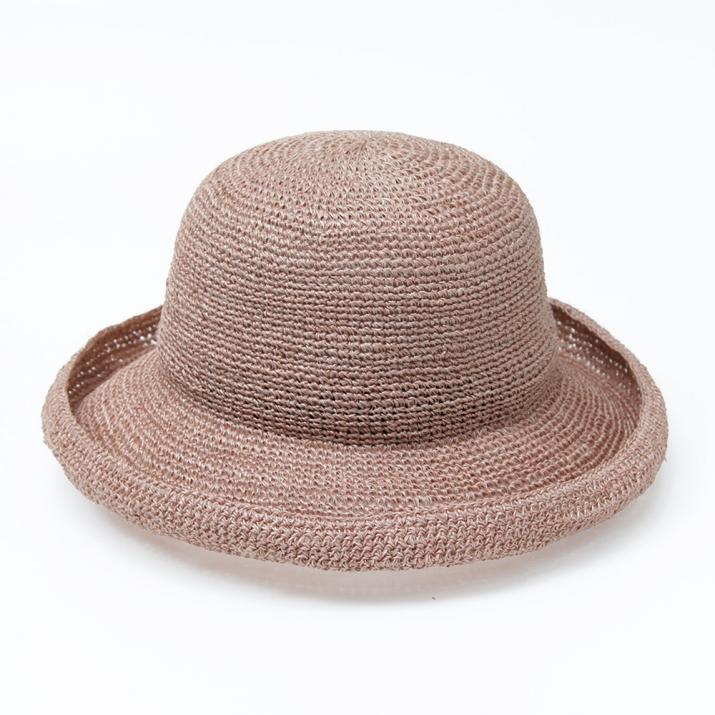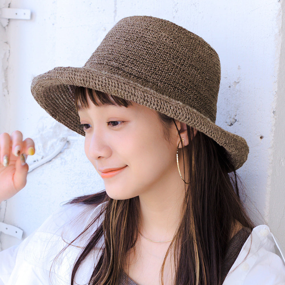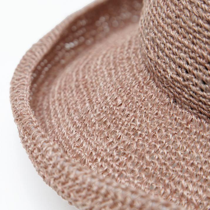 麻ならではのナチュラルな素材感は残しつつ、サーモ糸と一緒に編み上げることにより程よい光沢とニュアンス調の絶妙な色味を作り上げた、他にないとても上品なカラーです。風通しがよくナチュラルな気品は、手編みだからこそ表現できるもの。細かくて繊細なラインを手作業で丁寧に作っておりますので、一日に生産出来るのはわずか数個。つば広デザインでUVケアもバッチリな14+オリジナルの特別なハットです。