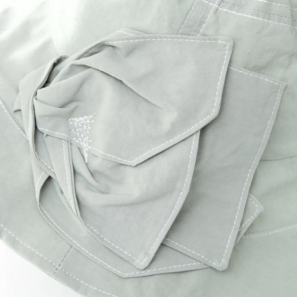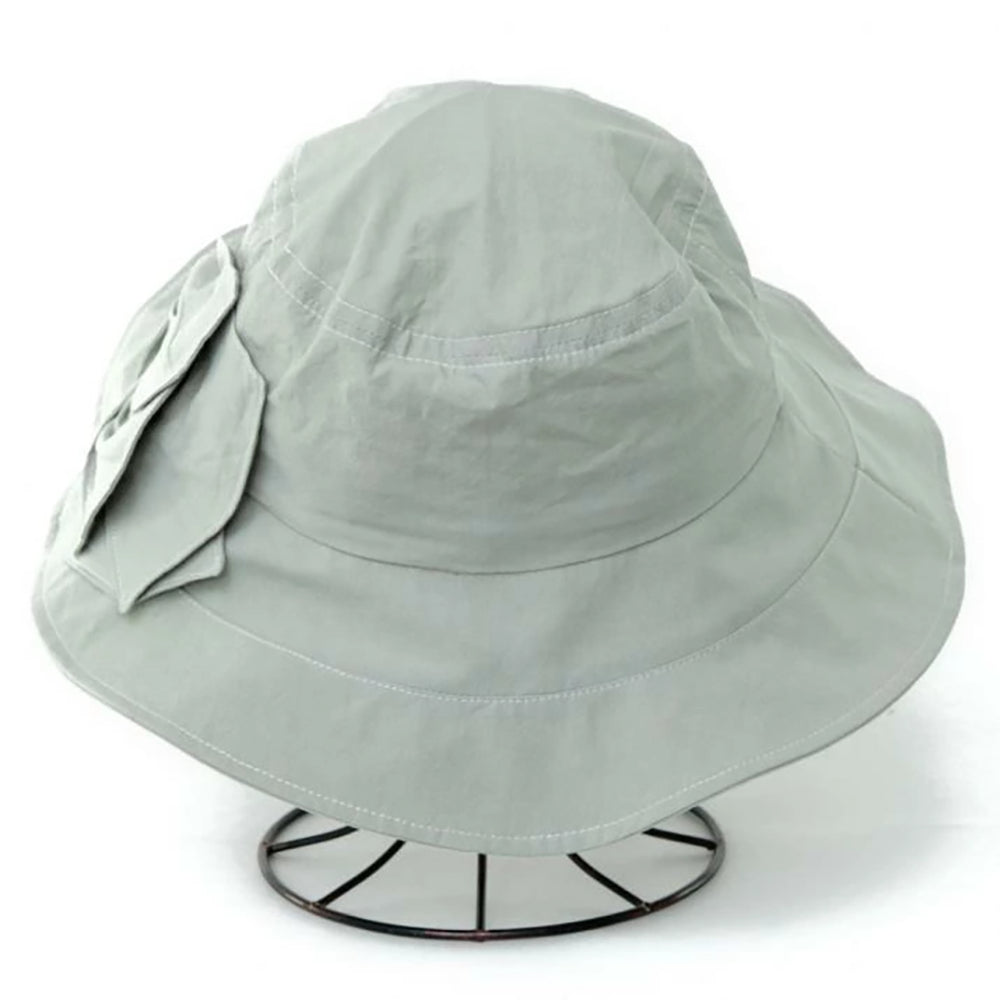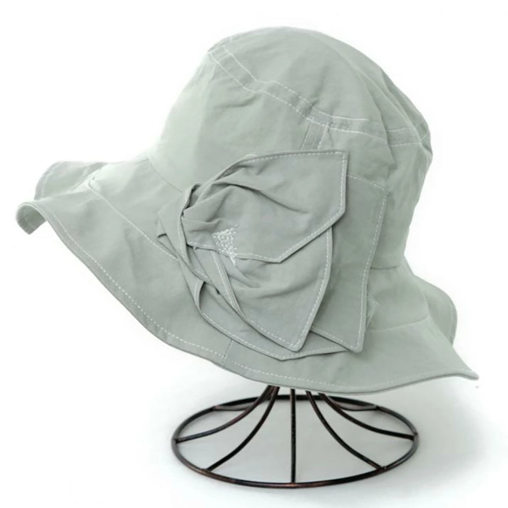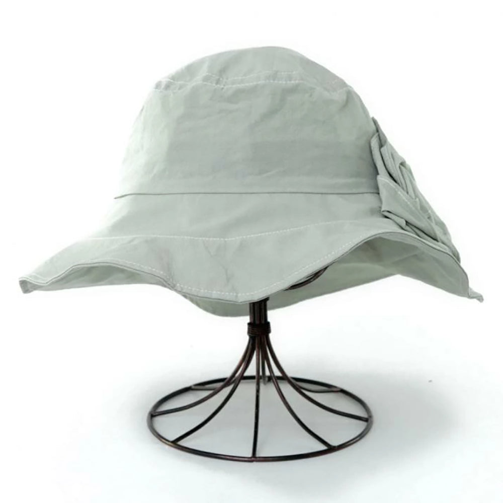 サイドのボリュームあるお花モチーフが華やかなつば広ハット。広がったつばデザインが日除け効果もバッチリ。コットン100%の柔らか素材を使用していますので、被り心地も優しくコンパクトに折りたたんでの持ち運びにも便利です。サイズ調節も可能なので、ぶかぶかせずフィット感があります。