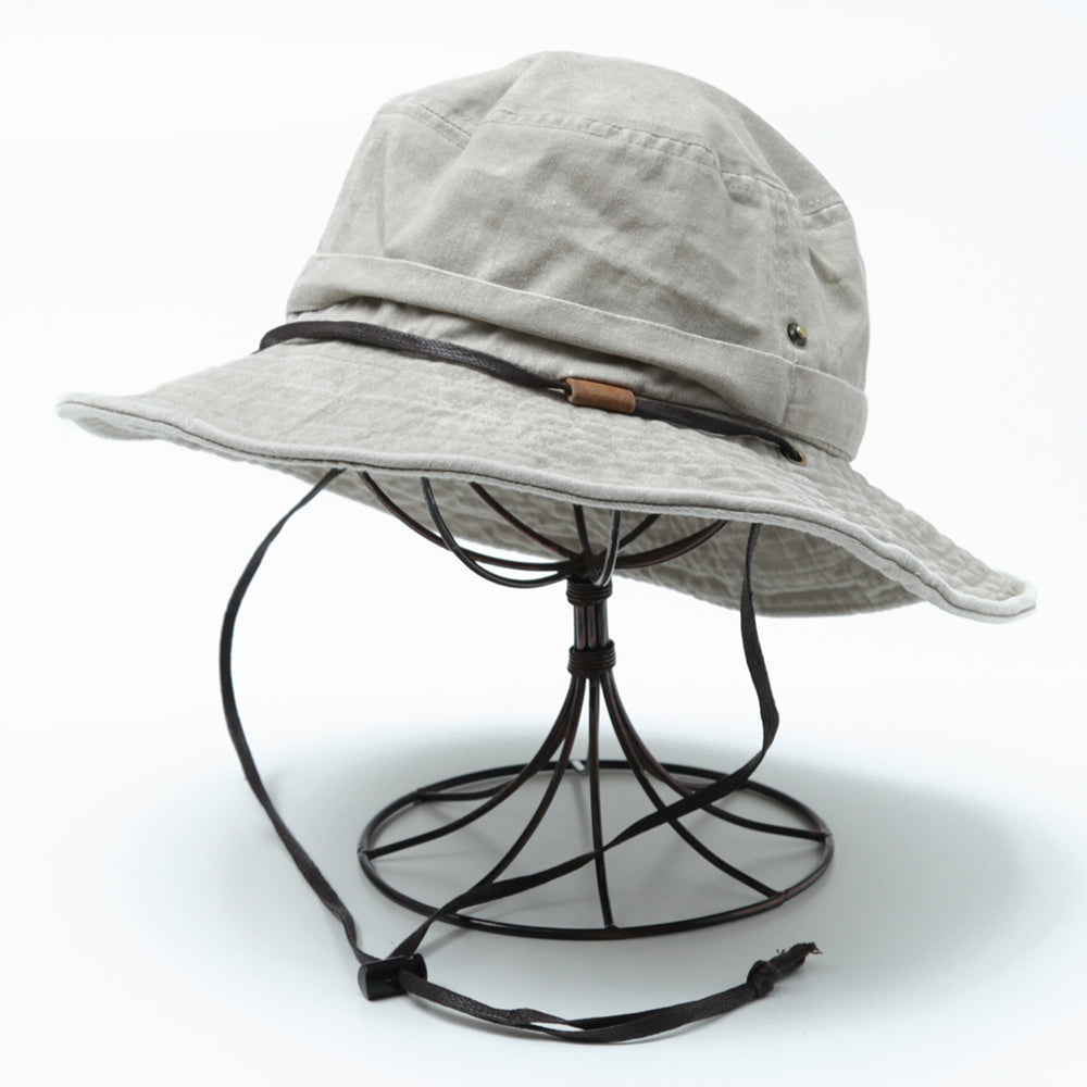 アウトドアに最適なお洒落なサファリハット。裏地は付けず軽い被り心地。折りたためばとってもコンパクトで、レジャーの邪魔になりません。コットン100%のウォッシュ加工を施したお洒落なデザイン。テンガロンハットにもなり、2通りのデザインが楽しめます。夏フェスや登山などアウトドアのお出かけにオススメできるハットです。