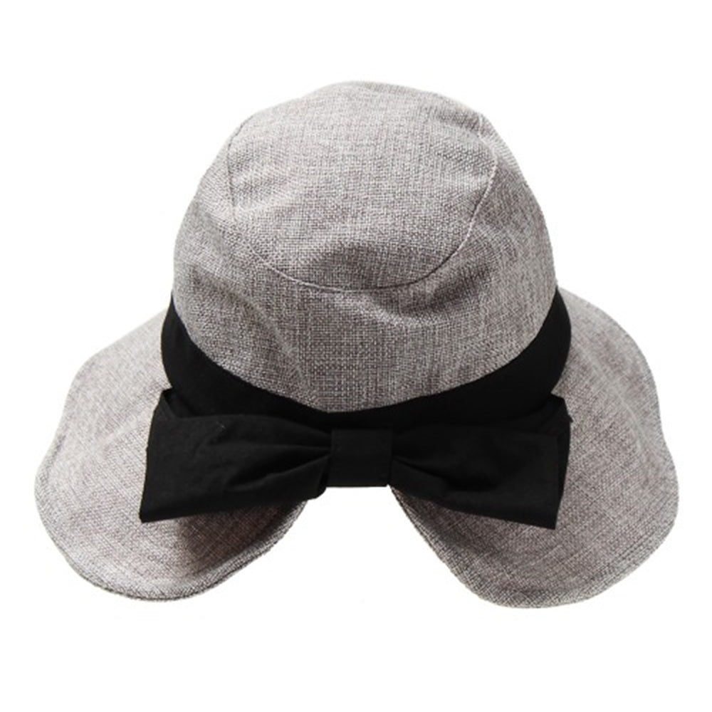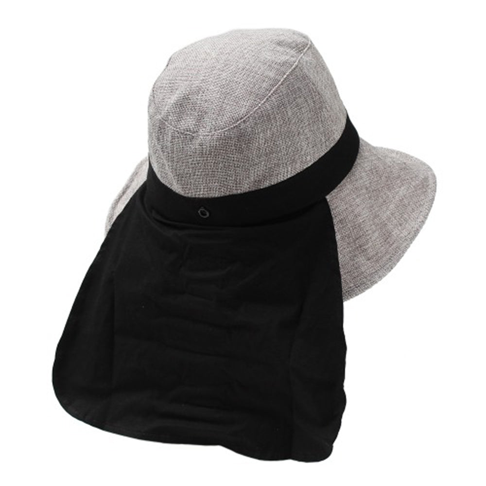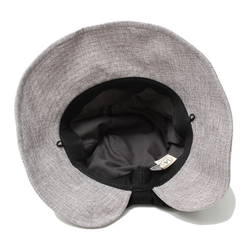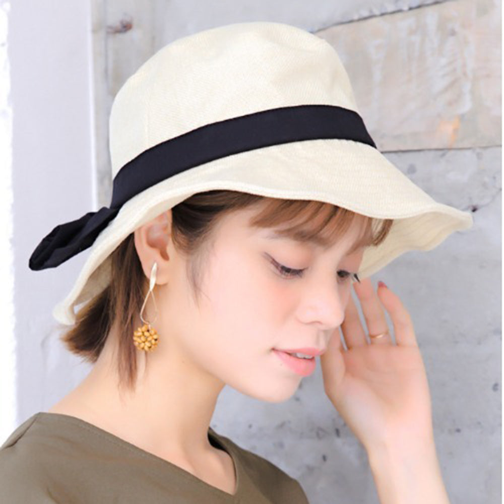 ポリジュート素材の軽やかなUVハットです。後ろのリボンは釦で留めた仕様になっていて、釦を外すと首の後ろを覆ってくれるマントが出てきます!釦を留めればまたリボンモチーフに♪日に焼けたくない方必見の大人可愛い機能的ハットです。