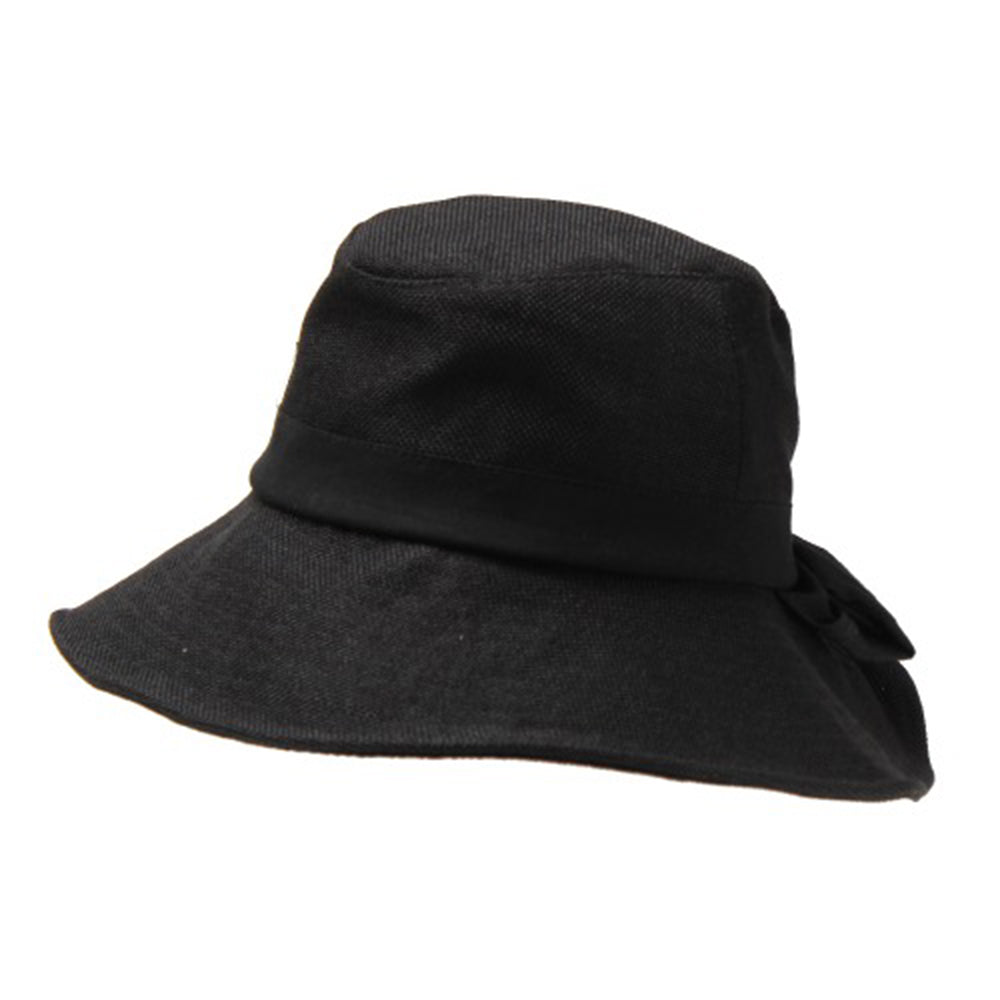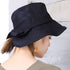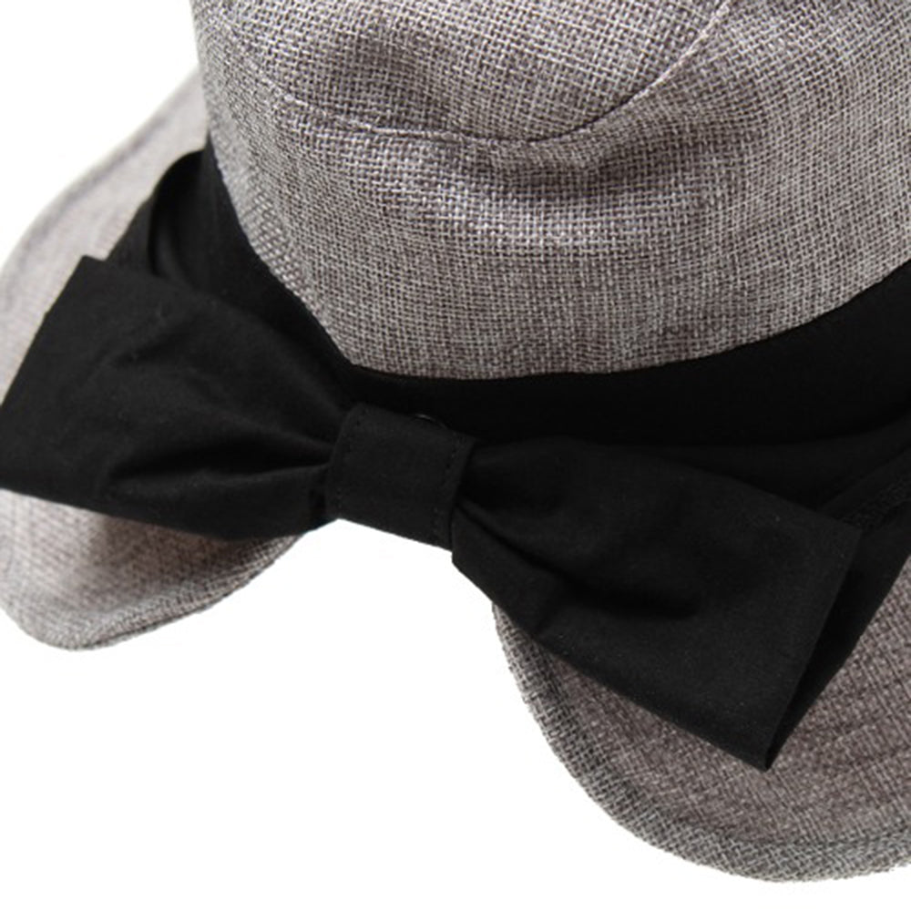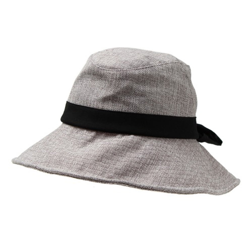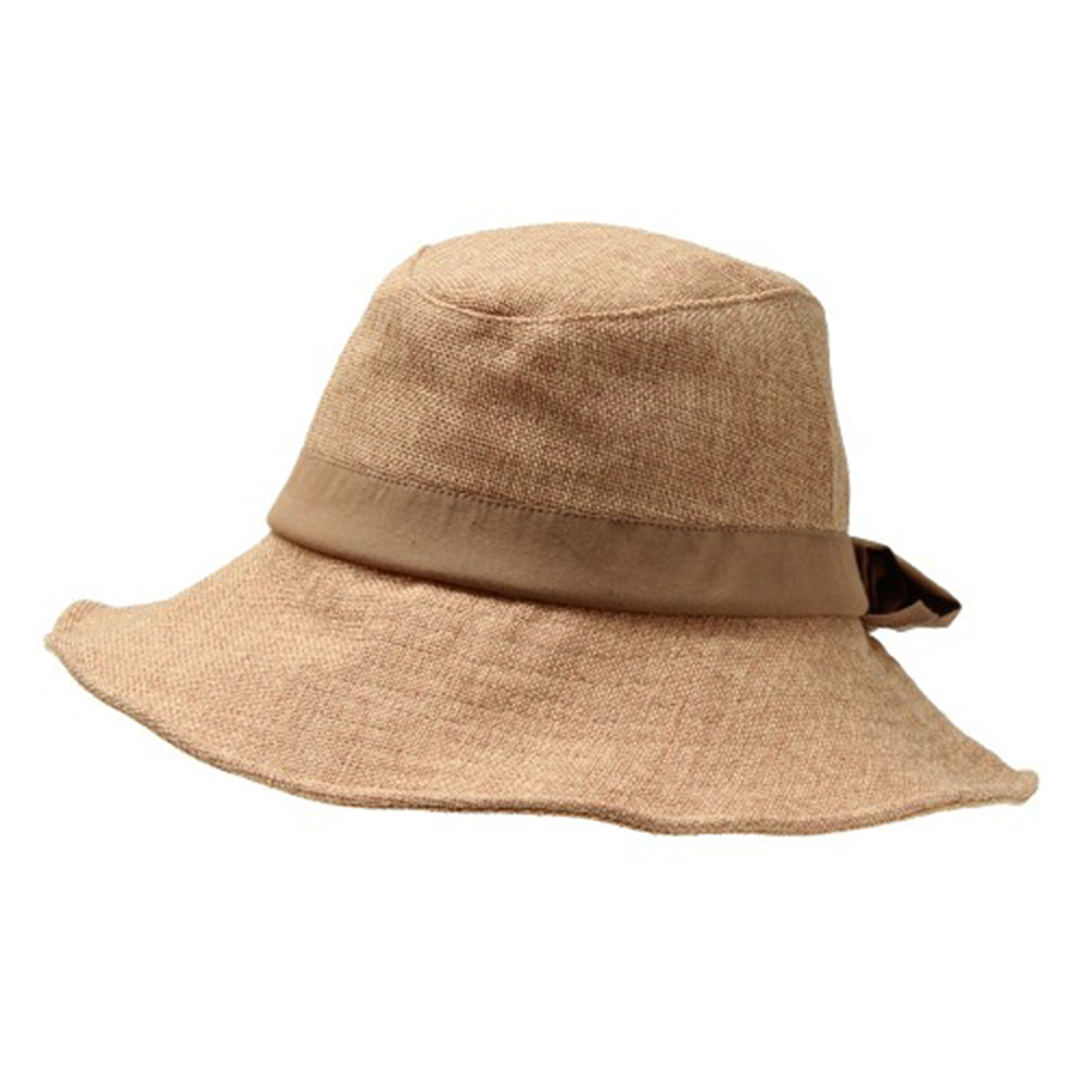 ポリジュート素材の軽やかなUVハットです。後ろのリボンは釦で留めた仕様になっていて、釦を外すと首の後ろを覆ってくれるマントが出てきます!釦を留めればまたリボンモチーフに♪日に焼けたくない方必見の大人可愛い機能的ハットです。