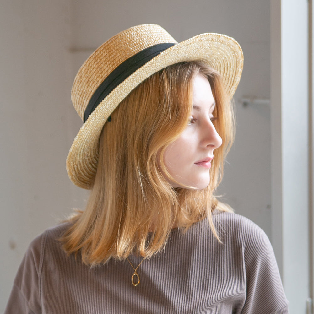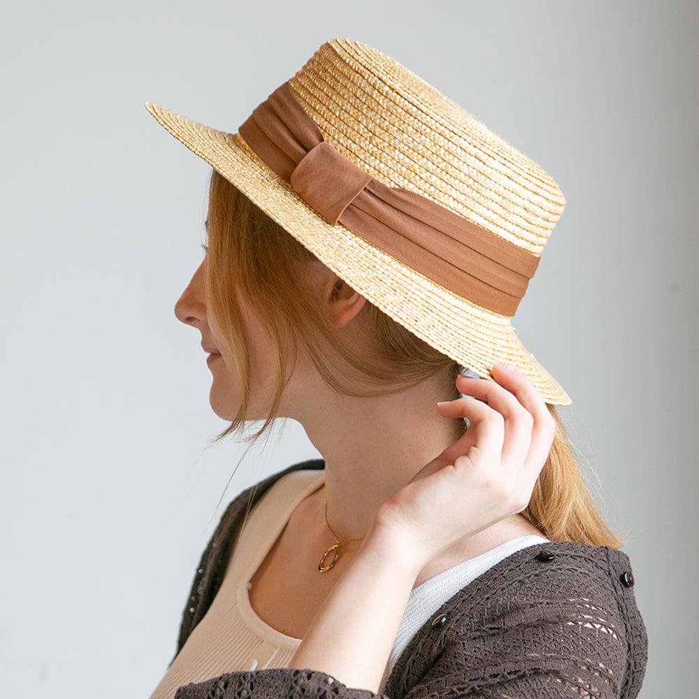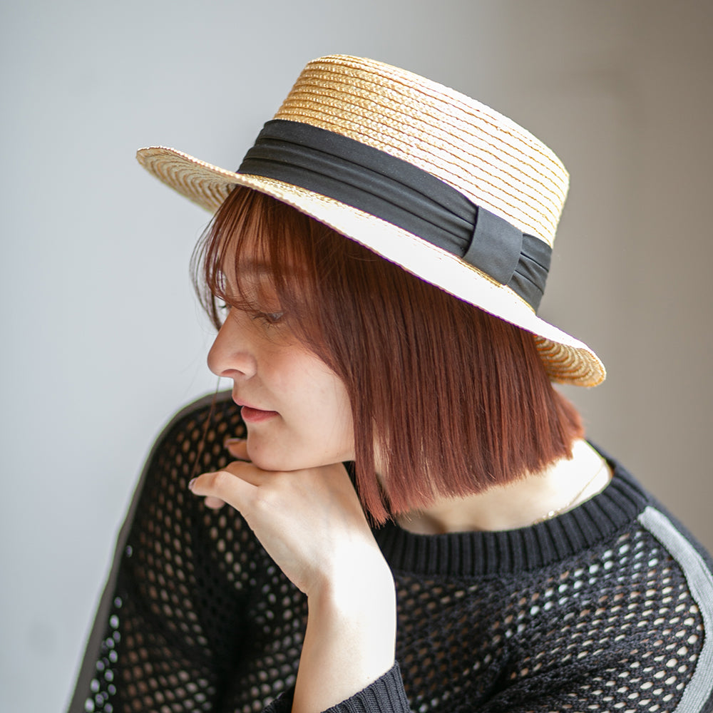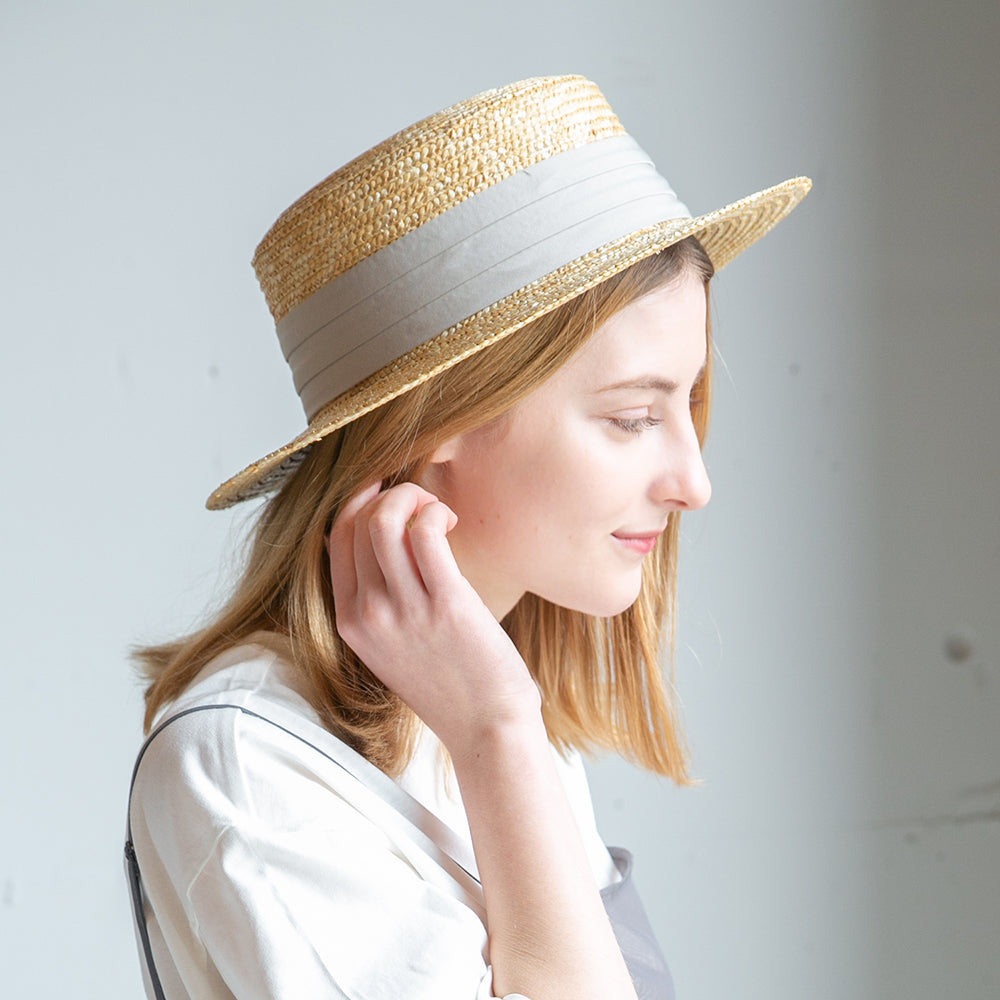 爽やかな麦素材のブレード編みとコットン混のタックリボンが大人可愛いデザイン。