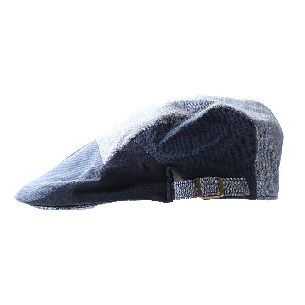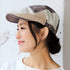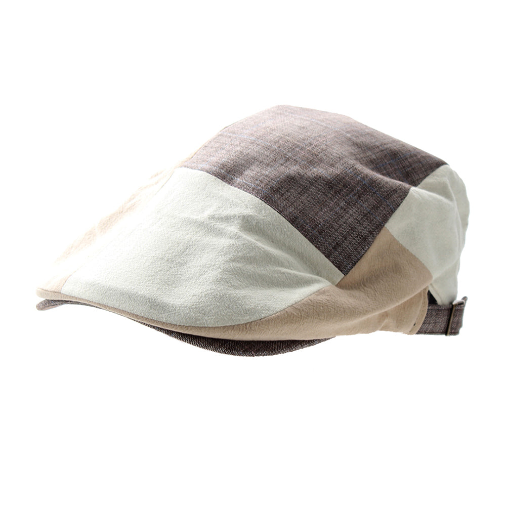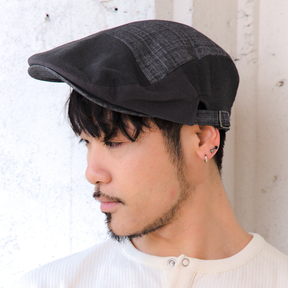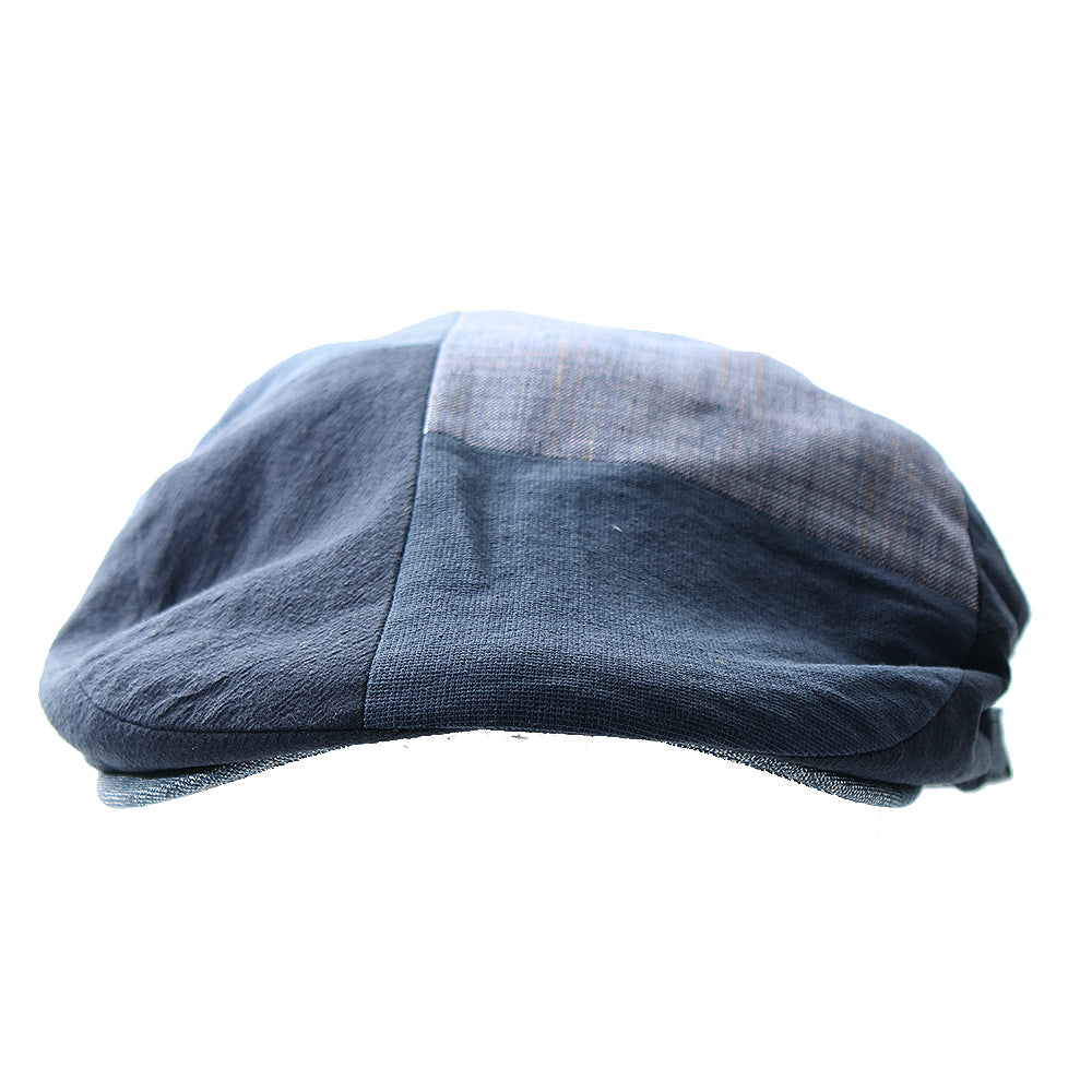 インディゴ調のおしゃれな生地を縫い合わたパッチワークハンチングです。落ち着いた色合いで統一した、大人なデザインに仕上げました。サイドのベルトで若干のサイズ調節も可能。