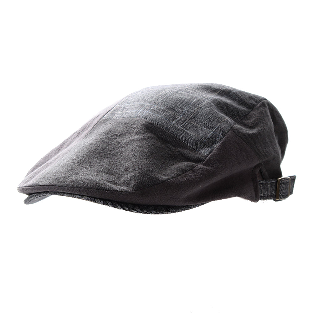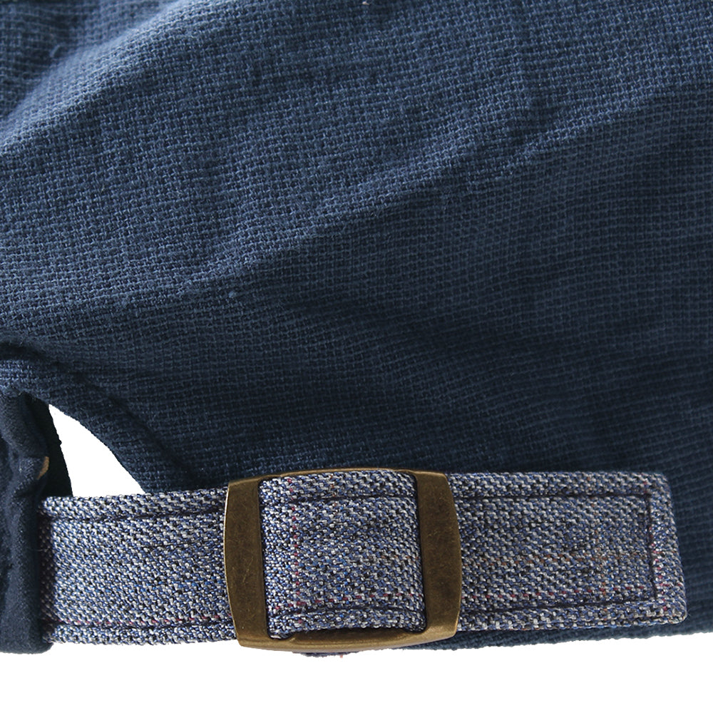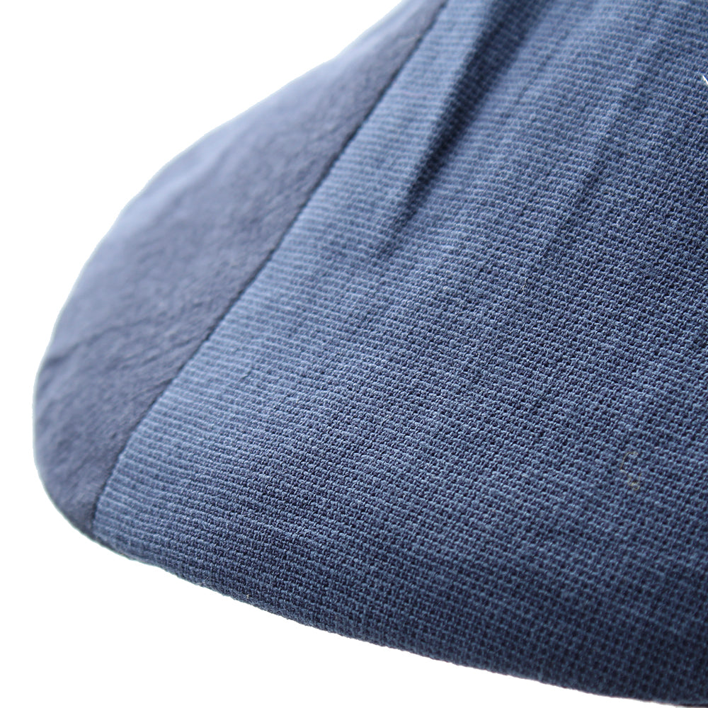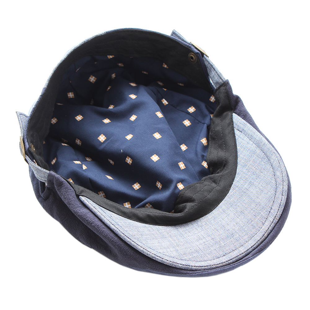 インディゴ調のおしゃれな生地を縫い合わたパッチワークハンチングです。落ち着いた色合いで統一した、大人なデザインに仕上げました。サイドのベルトで若干のサイズ調節も可能。