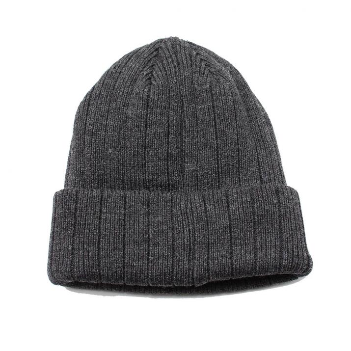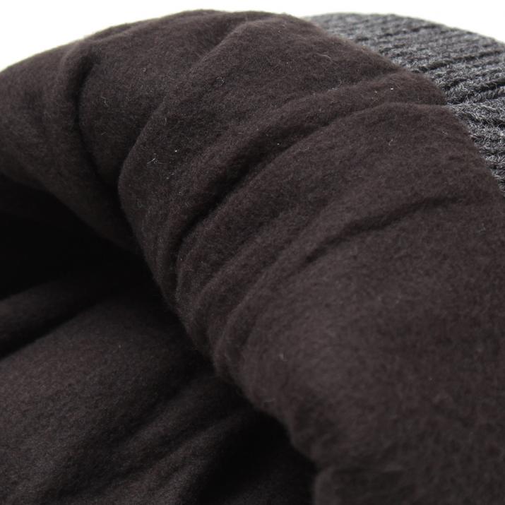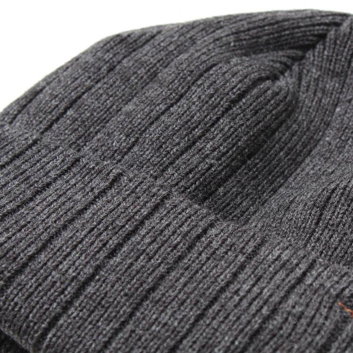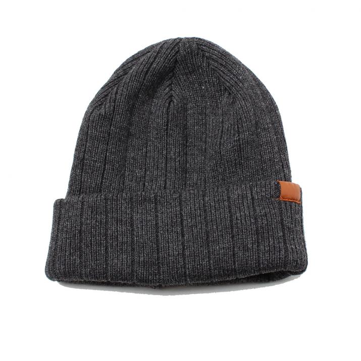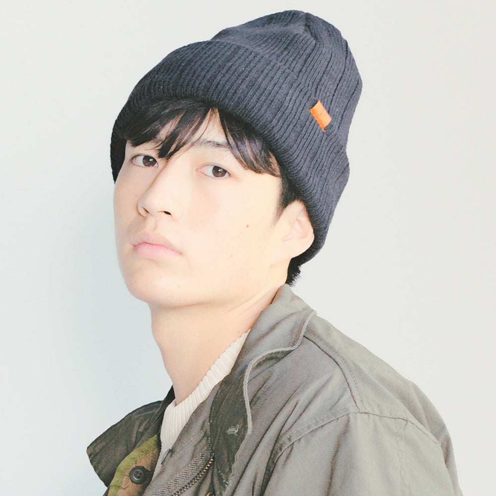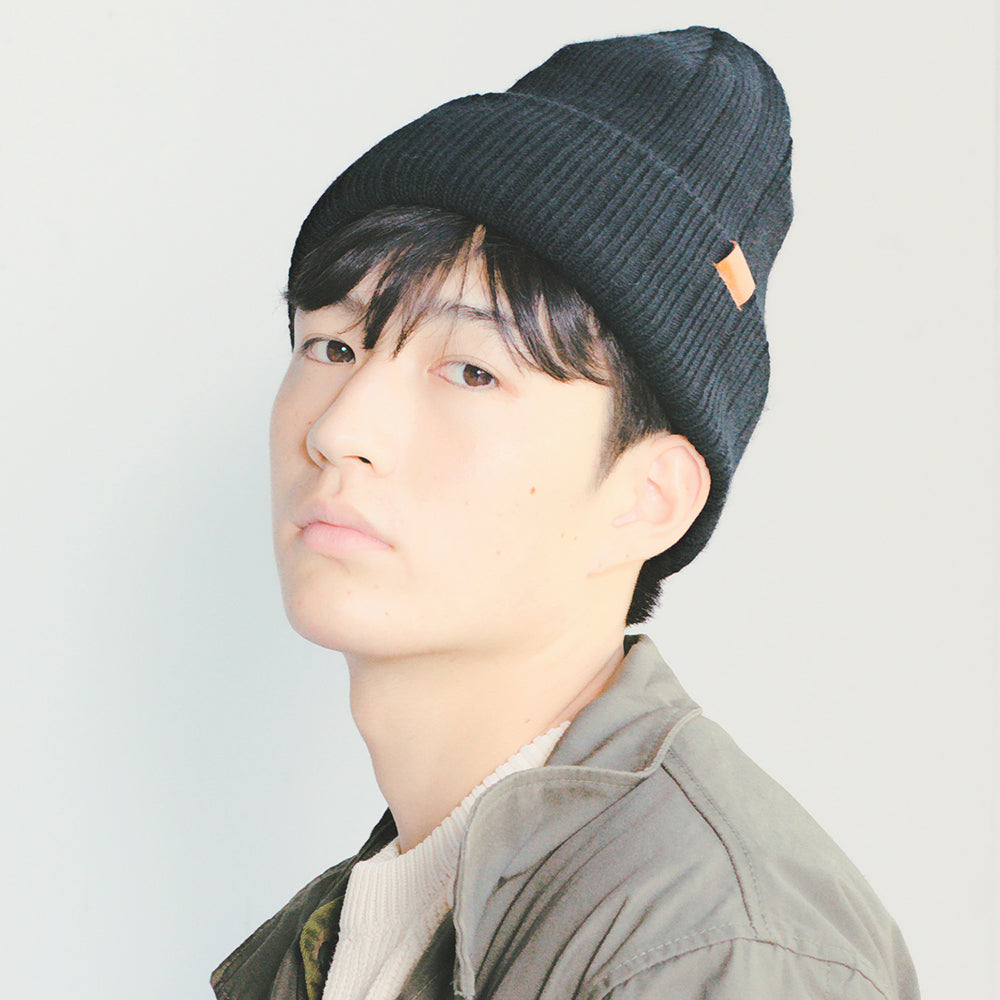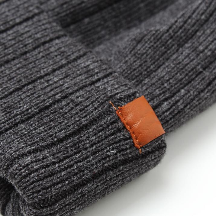 裏をフリース生地にしたダブルニットで風を通さず温かい、冬のニット帽です。しっかりした太目のリブ編みで上品な印象もあり、サイドの革パッチが大人のカジュアルをさりげなく演出。