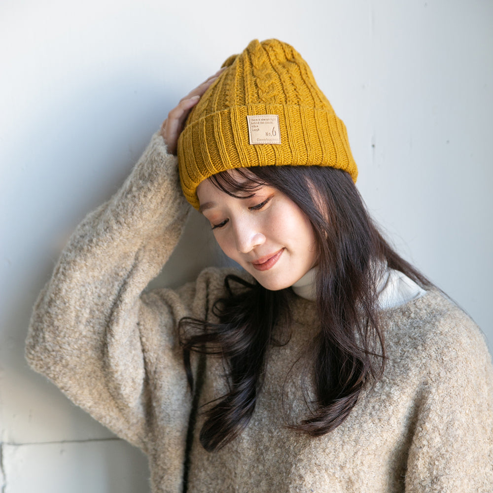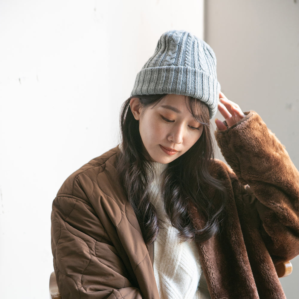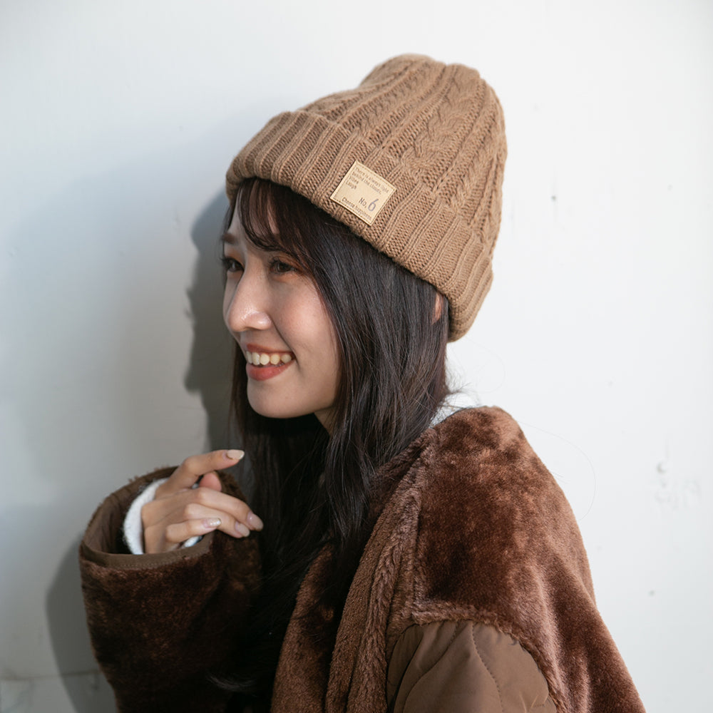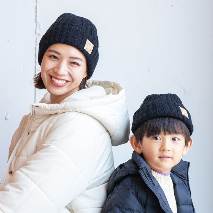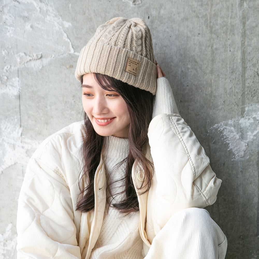 ざっくりしたケーブル編みのニット生地がとっても可愛い!親子でおそろいコーデが出来ちゃう冬の頼れるニット帽です。折返し部分に着けたナチュラルなワッペンがとってもキュート。暗い色が多くなりがちな秋冬のスタイルのポイントになってくれます。裏地は毛足の短い起毛生地で、とても温か。深く被れば防寒も完璧です。キッズ用も同じデザインと色をそろえています。◆親子ペアアイテム(ペア商品コード:kkni0109)