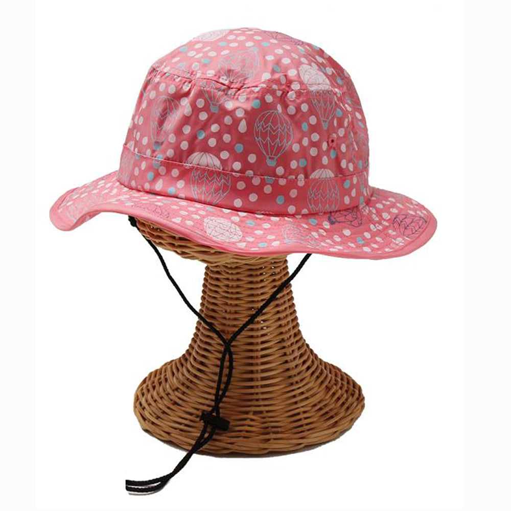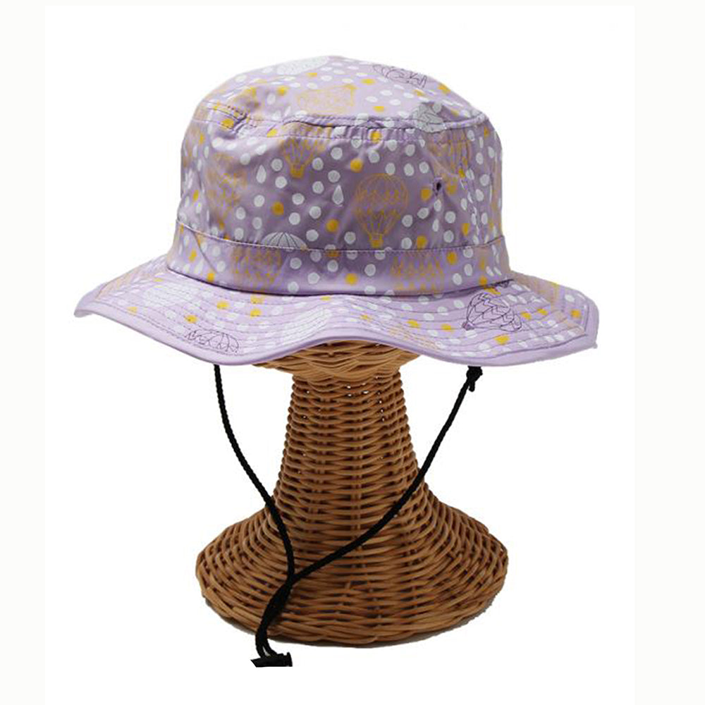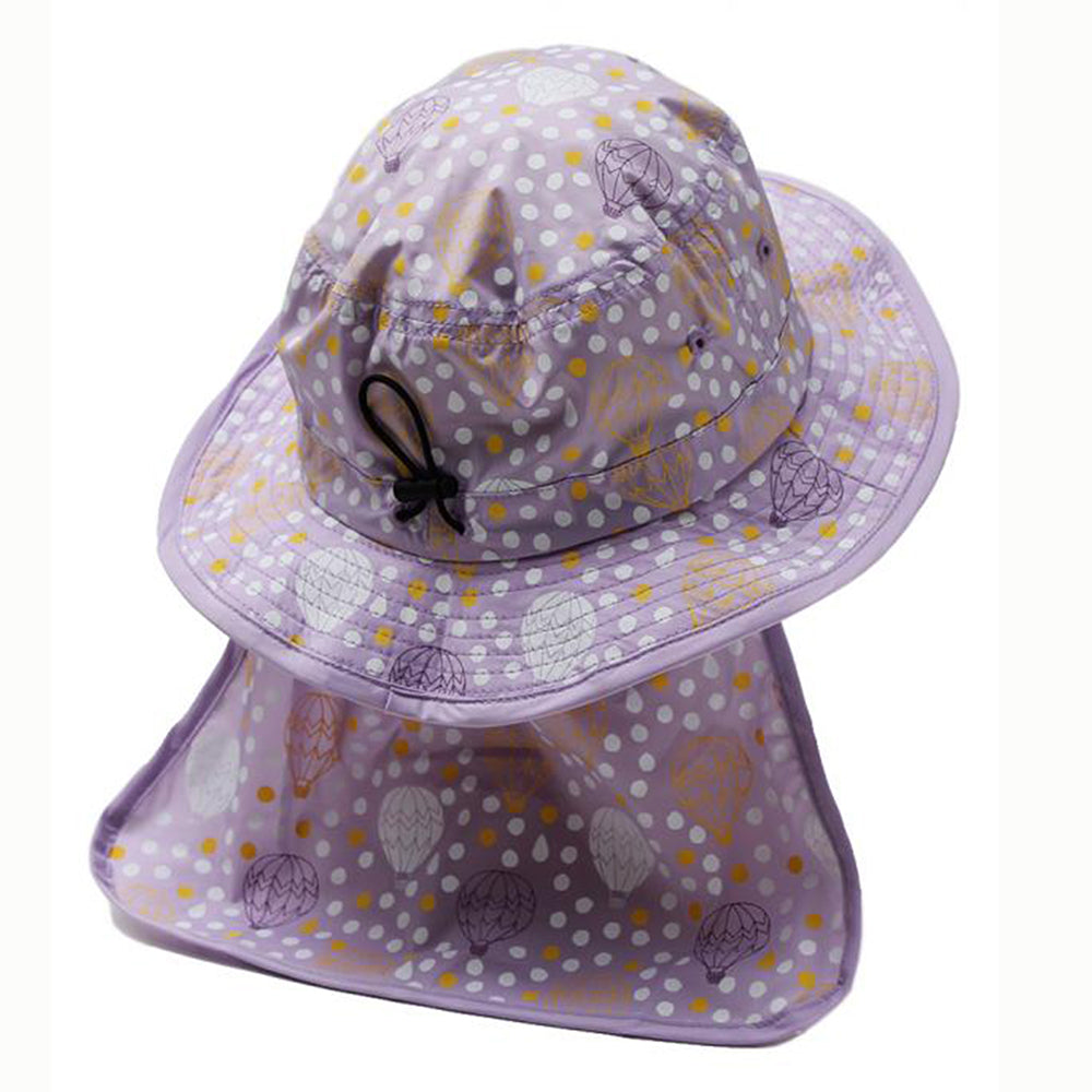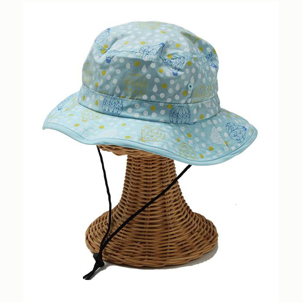 気球と水玉のプリントがとってもキュートなキッズ用サファリハットです。撥水加工を施しておりますので、汚れにくく手洗いもOK!日除け防止のマントが内蔵されていますので、日除け効果もバッチリです。柔らかい素材感でコンパクトに折りたたんでの持ち運びにも便利!