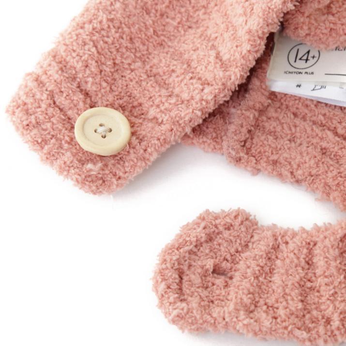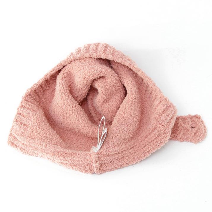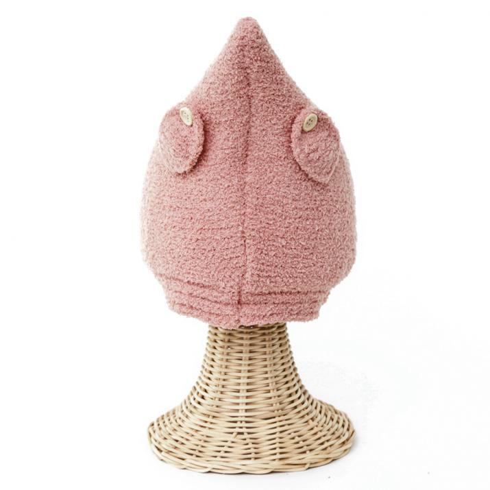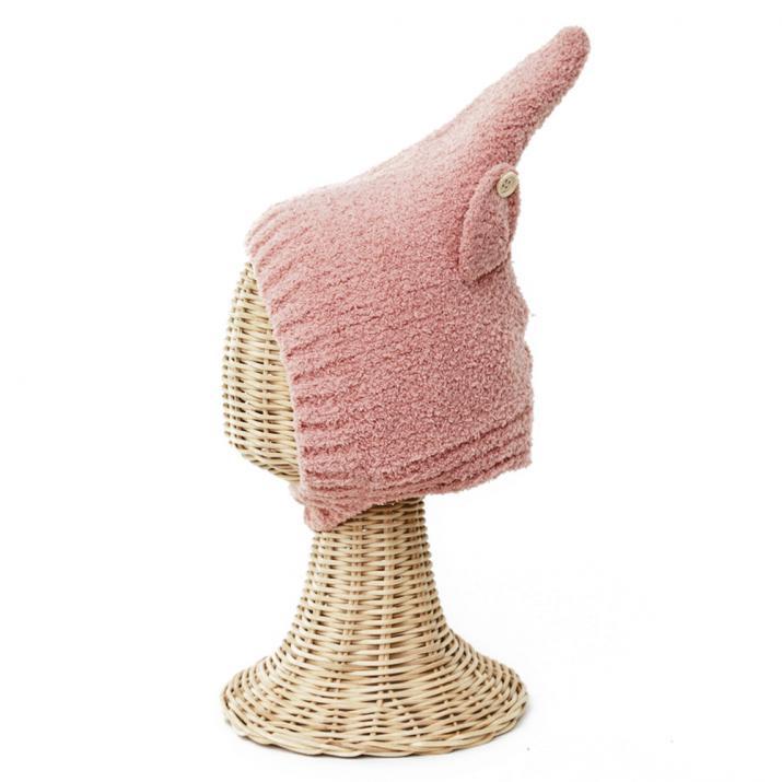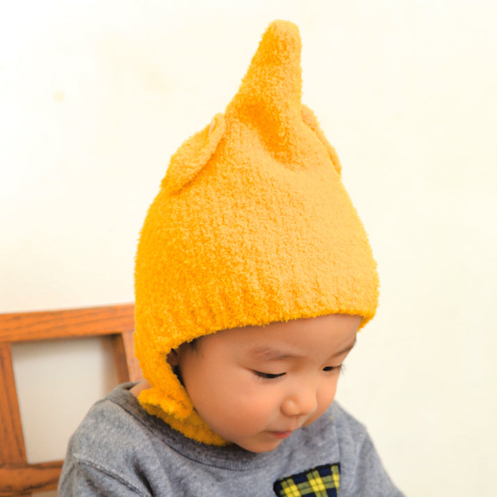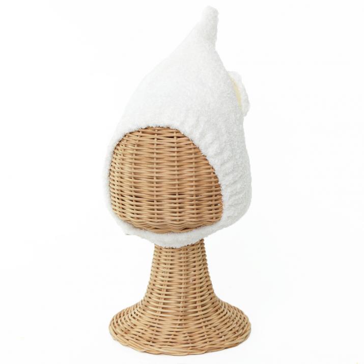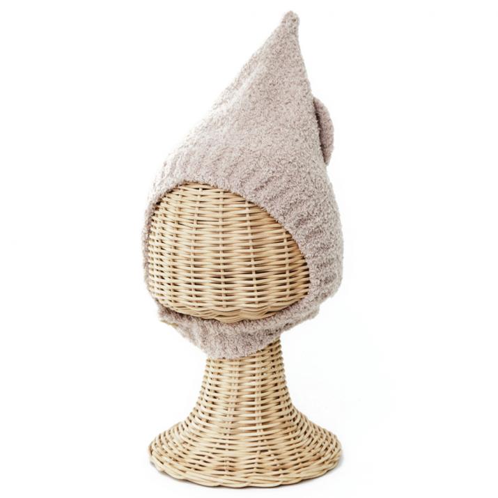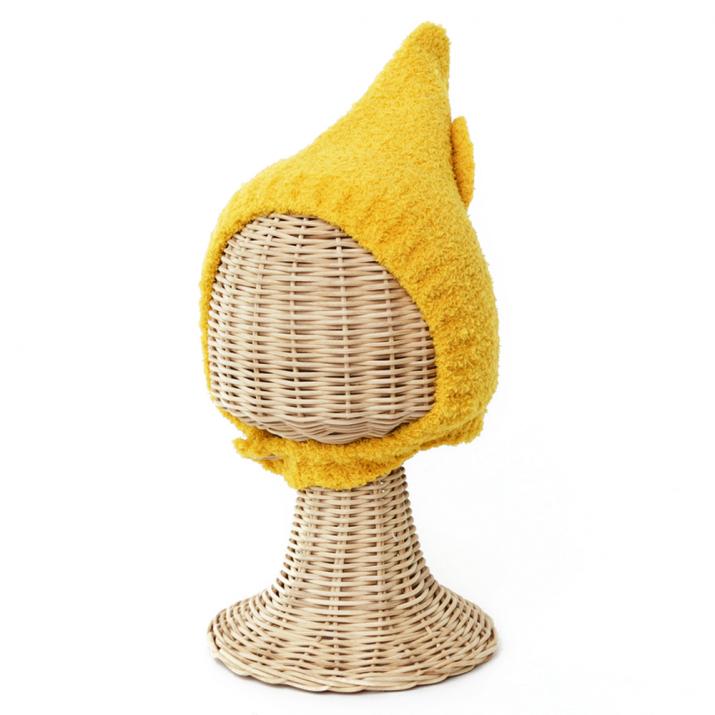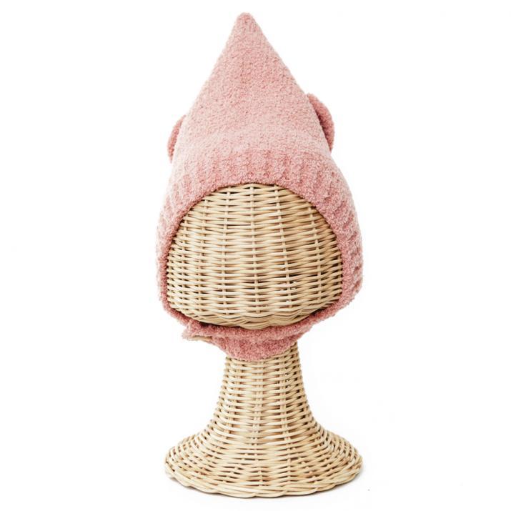 小人風のデザインが愛くるしいキッズ用のニット帽です。あご部分で留めることも可能なので、冬の外出時の防寒にも安心です。