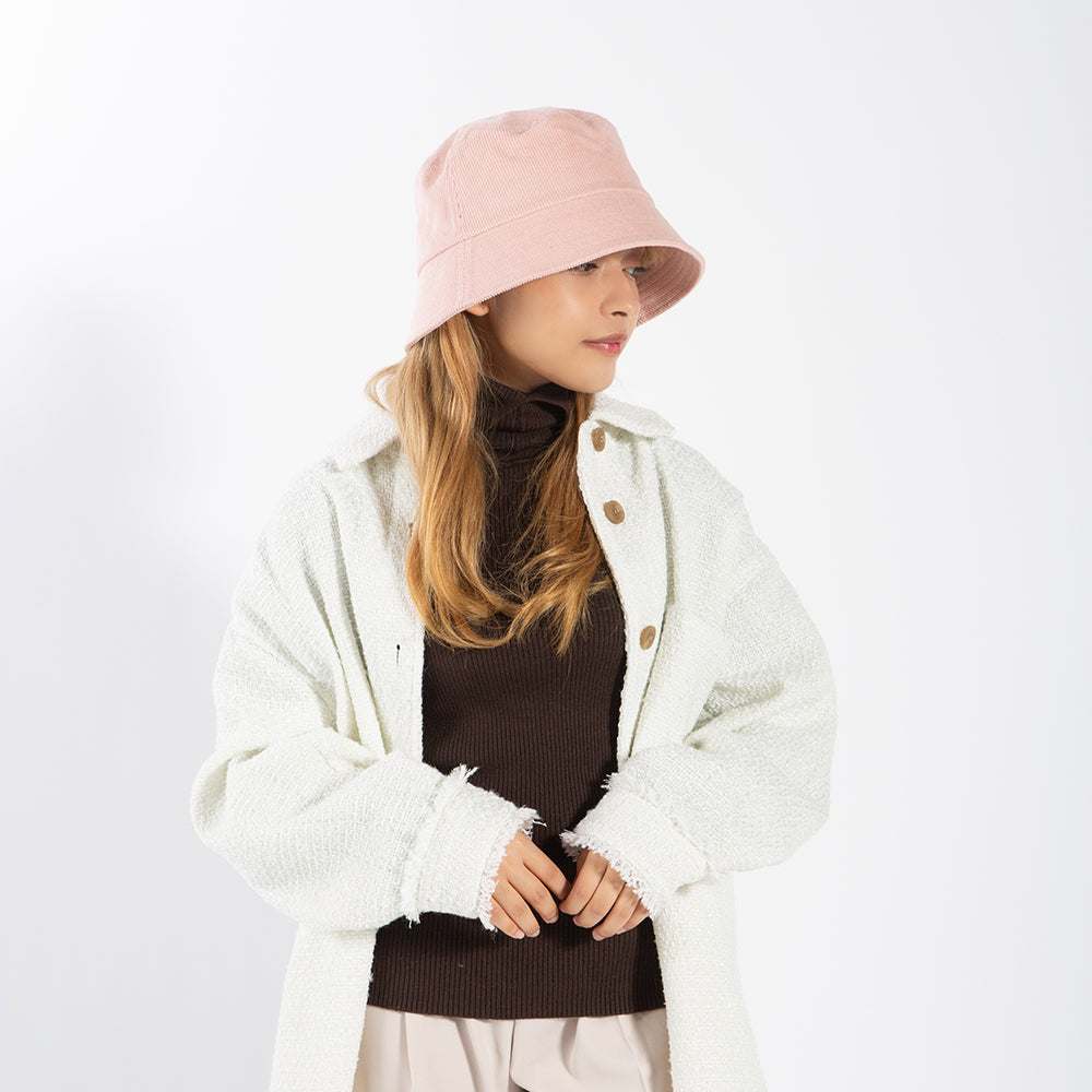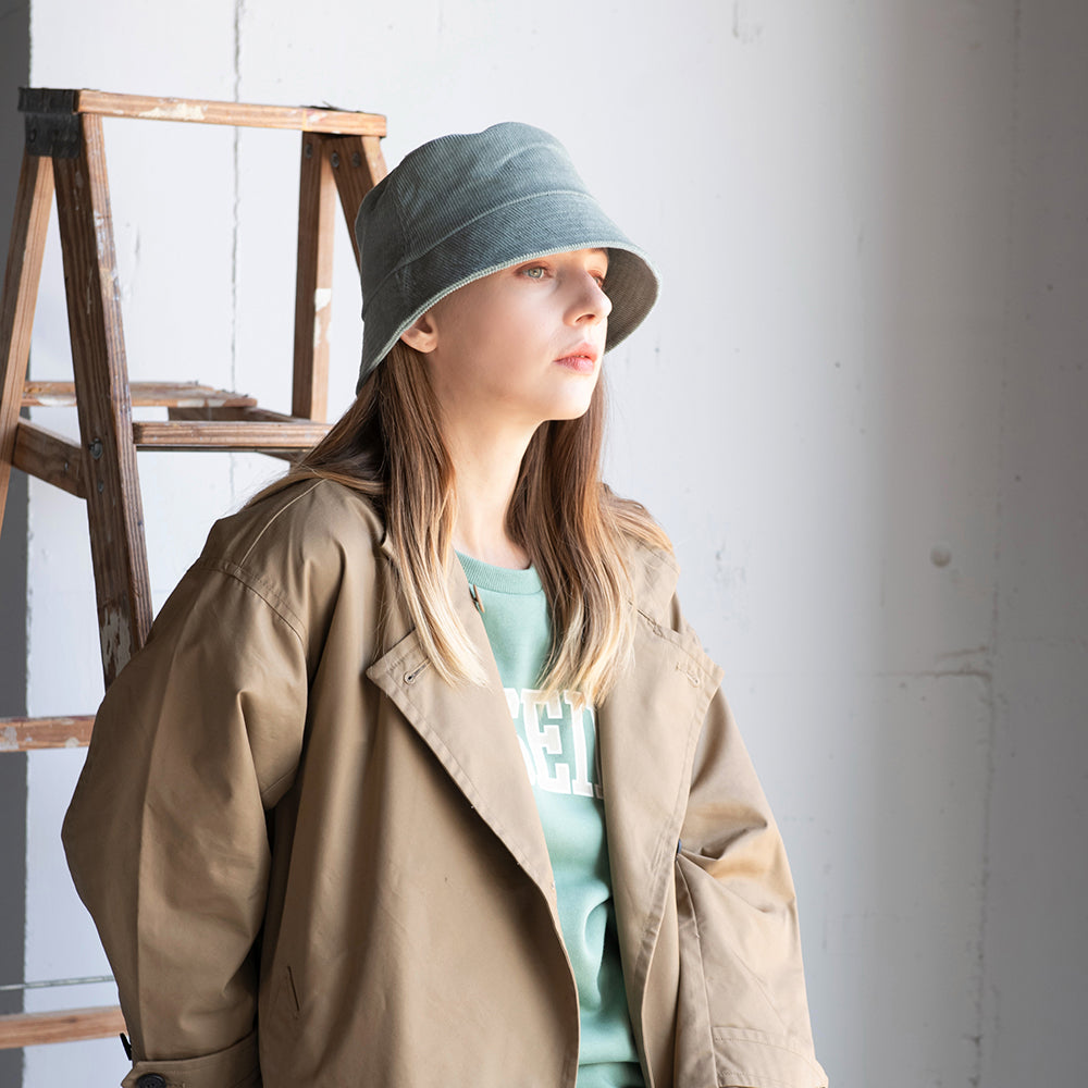 ダウンブリムデザインが今っぽいバケットハット。程よくハリのあるコーデュロイ素材で、どこか高級感も感じられます。