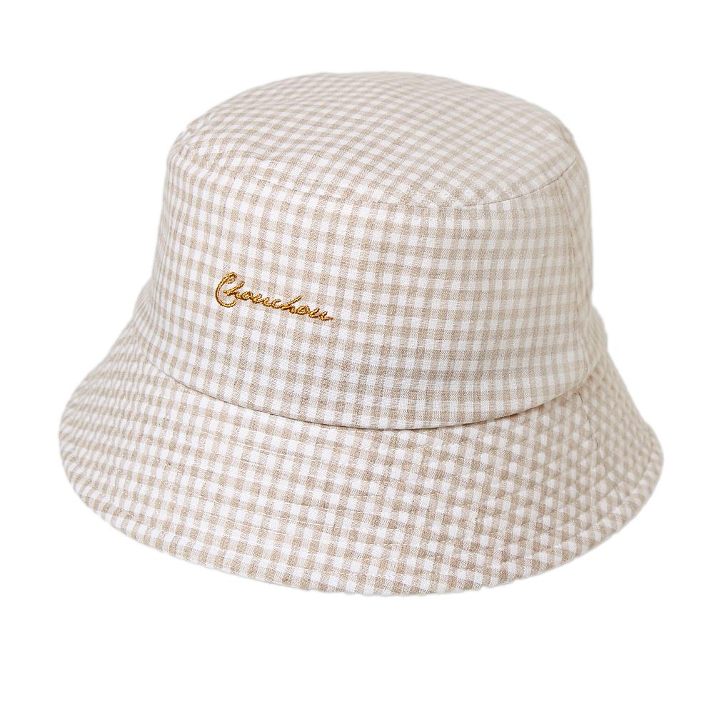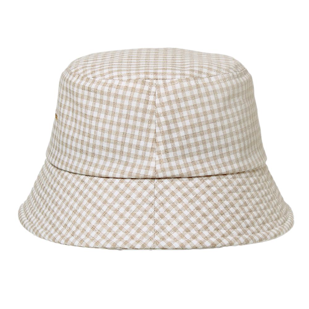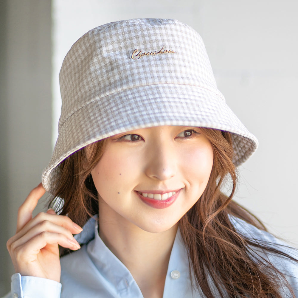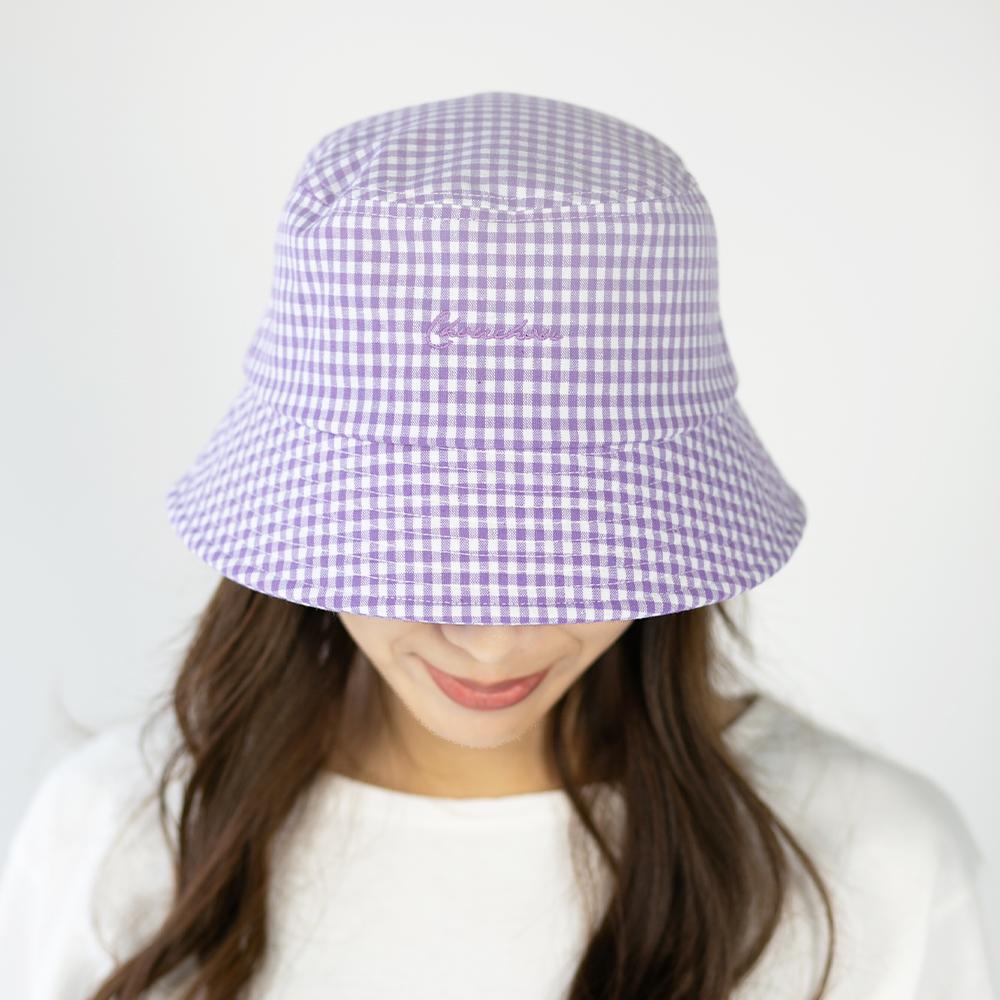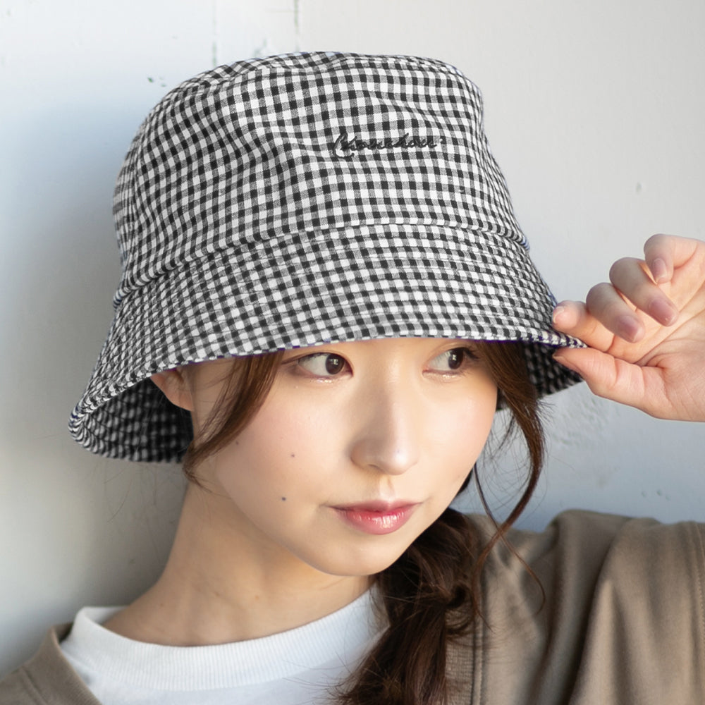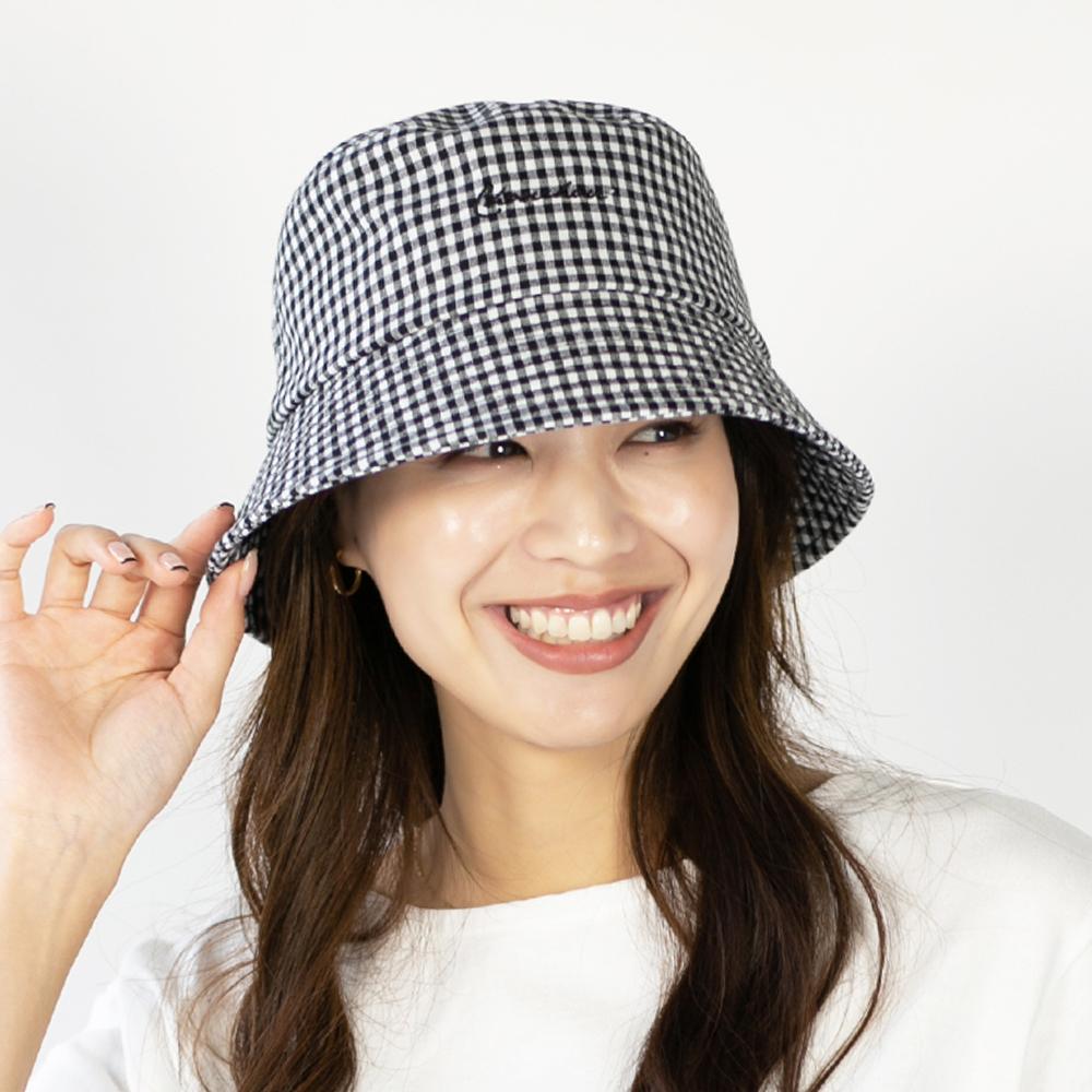 春夏らしいギンガムチェックデザインが可愛いバケットハット。筆記体のロゴ刺繍もさり気ないポイントに◎普段のスタイルのアクセントになるアイテムです。内側にあるすべりの裏側には、サイズを調節して頂けるテープが付いていますのでご自分のサイズ感で被って頂けます。