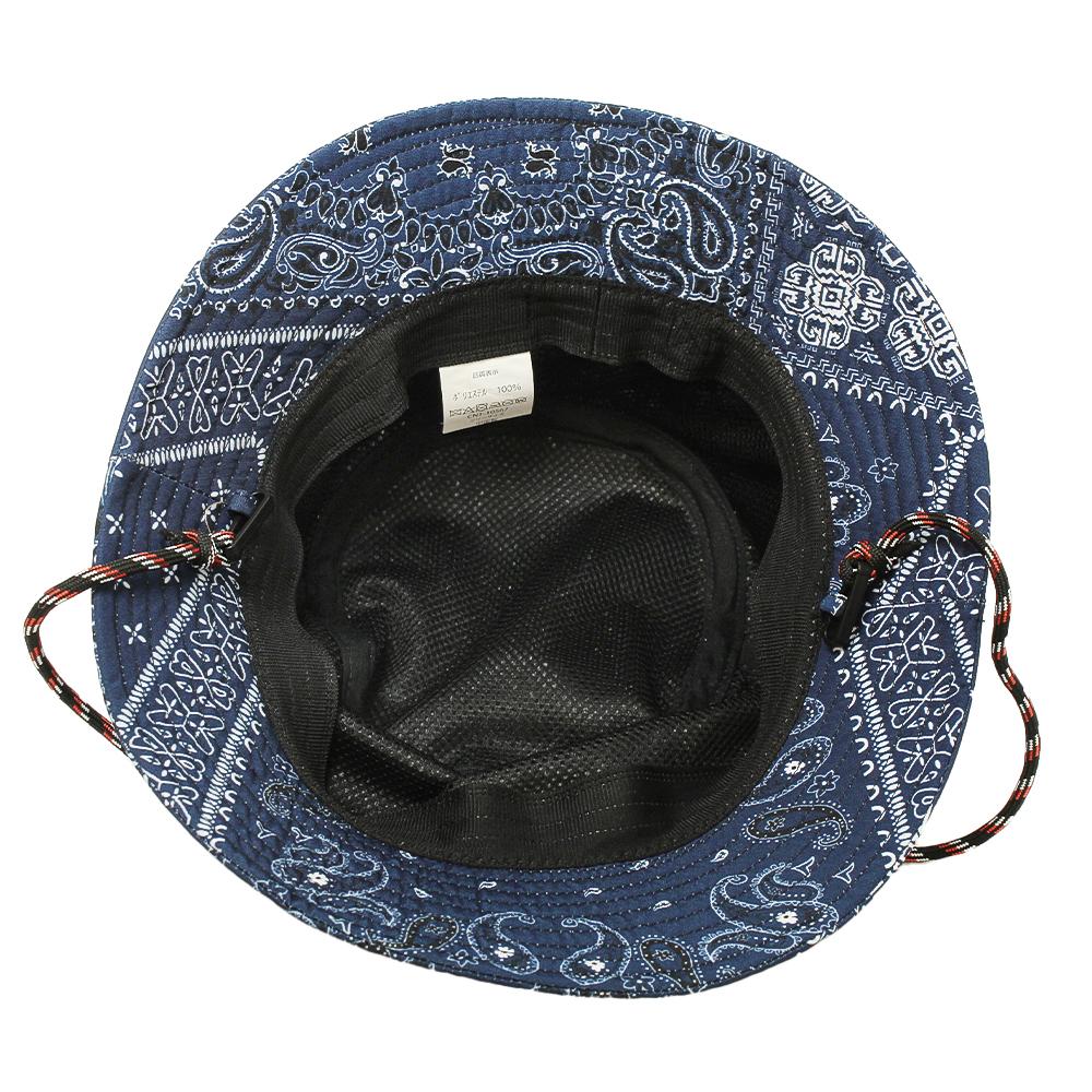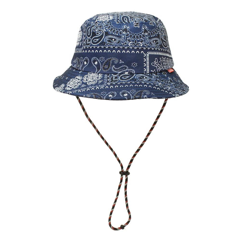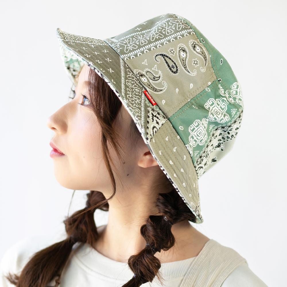 お洒落なペイズリー柄の撥水バケットハット。さり気ないサイドタグがアクセントに。