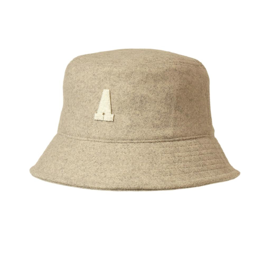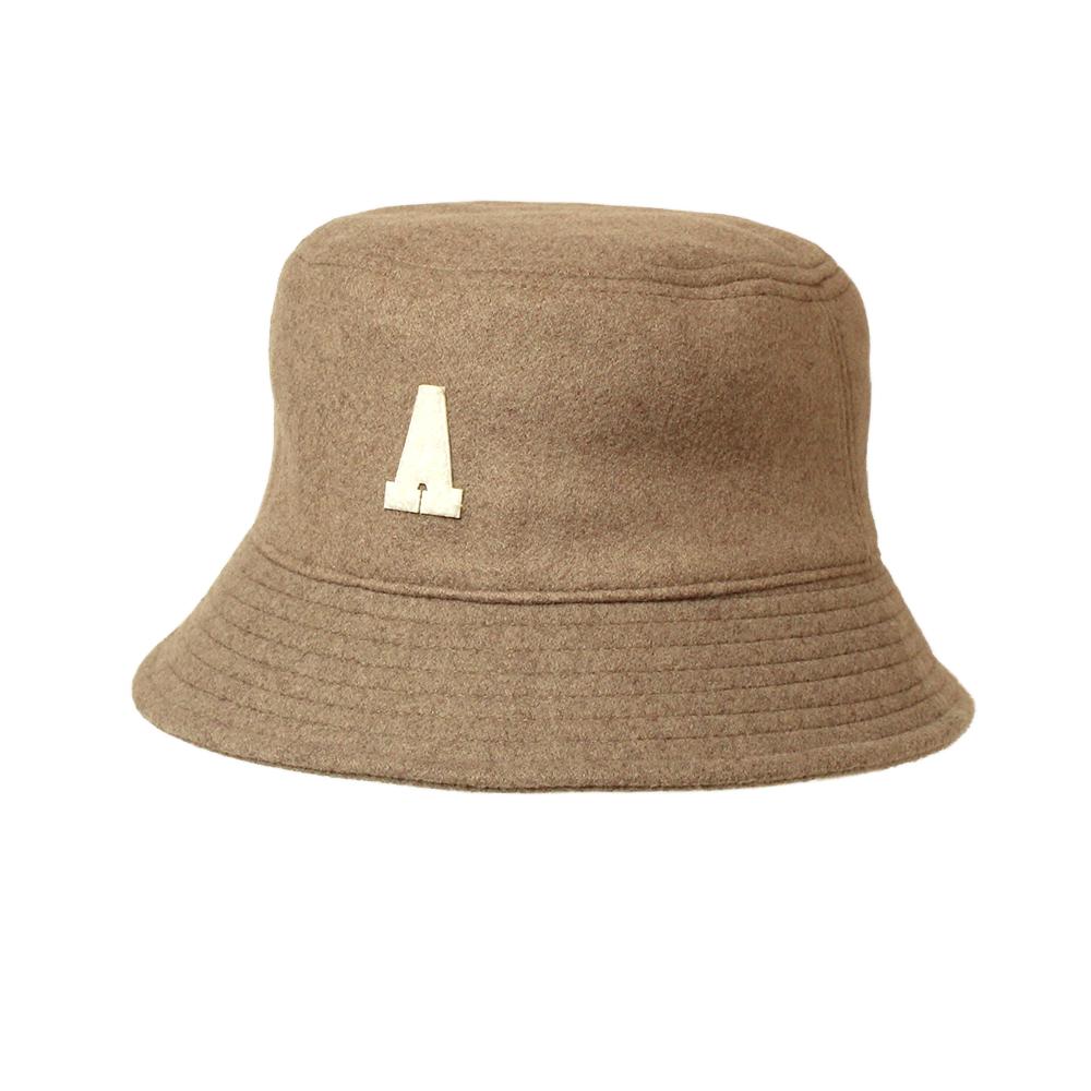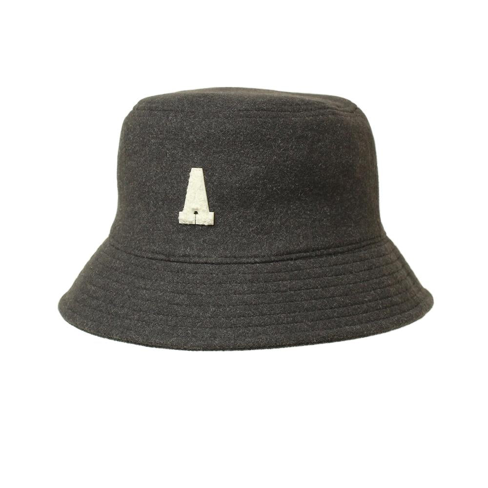 白色のアルファベット「A」ロゴがワンポイントのメルトンバケットハットです。さらさらとなめらかな肌触りの気持ちいい質感です。しわになりにくいので、折りたたんで持ち運びいただけます。内側にあるすべりの裏側には、サイズを調節して頂けるテープが付いていますので ご自分のサイズ感で被って頂けます。