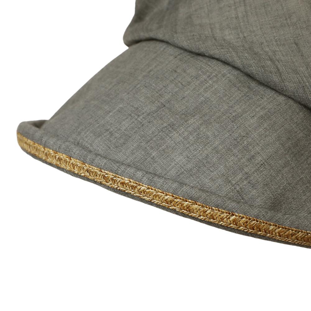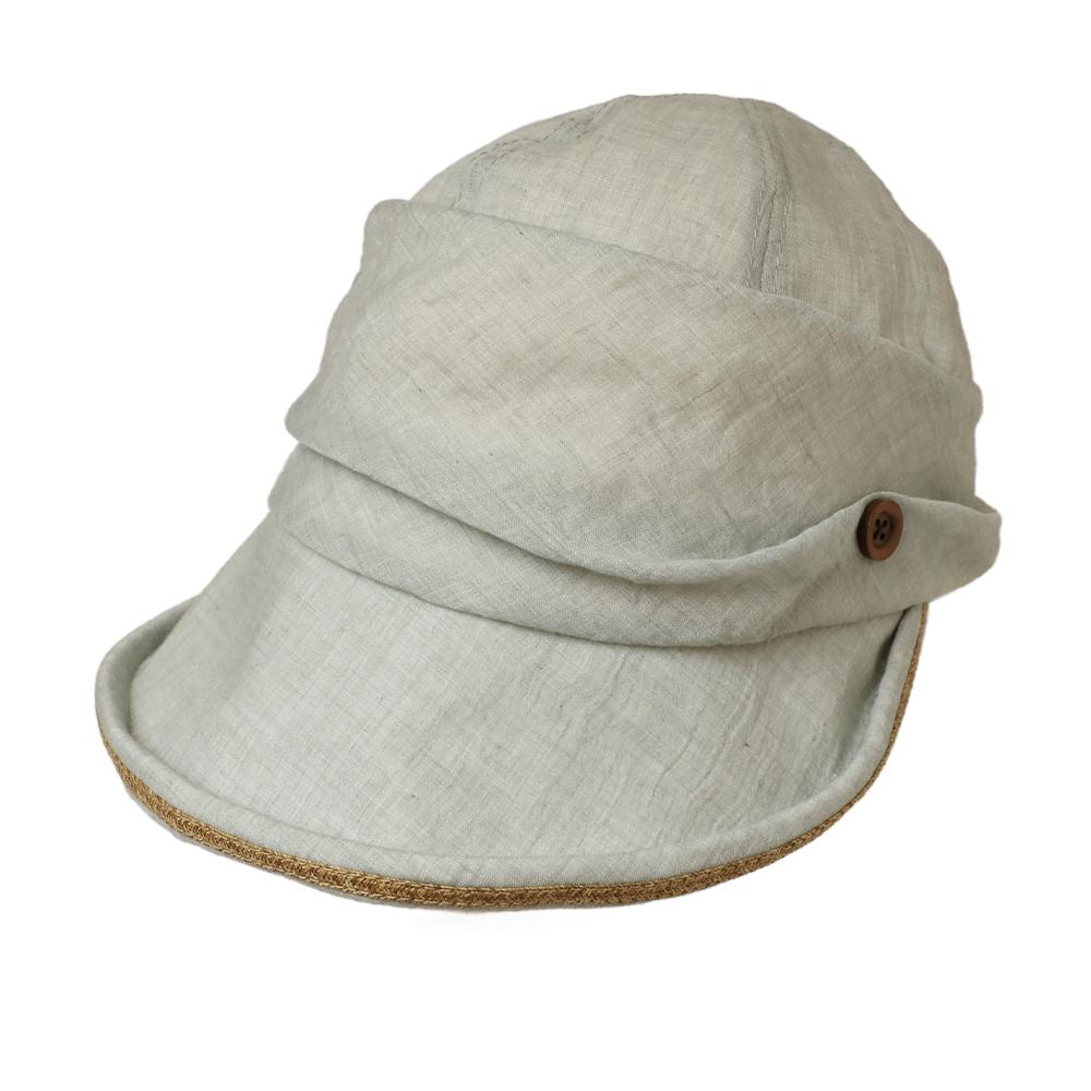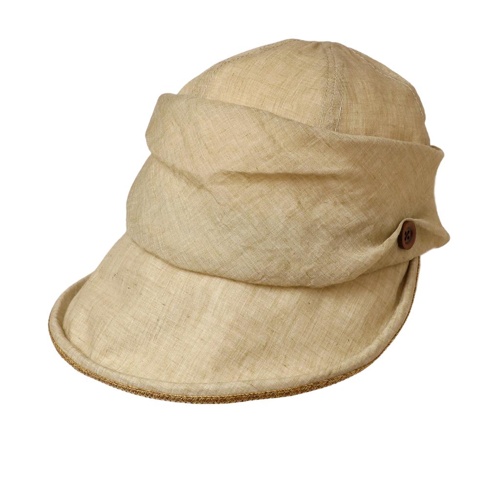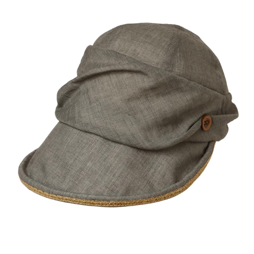 日差しの気になる季節に最適なジョッキーキャスケットです。くるんと丸まったツバ先とタックの入ったふっくらデザインがポイント!ツバ先に施されたブレード素材のラインや、サイドのボタンも可愛いアクセントに。内側にあるすべりの裏側には、サイズを調節して頂けるテープが付いていますので ご自分のサイズ感で被って頂けます。