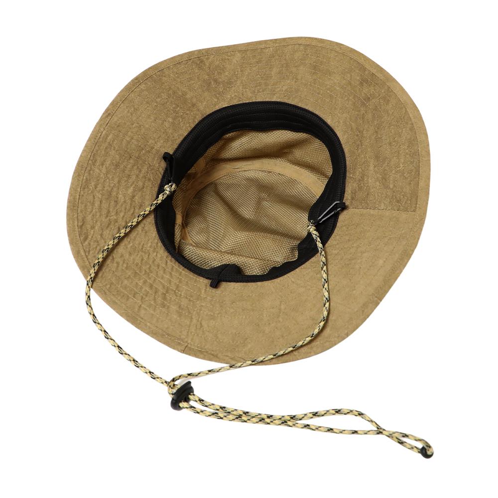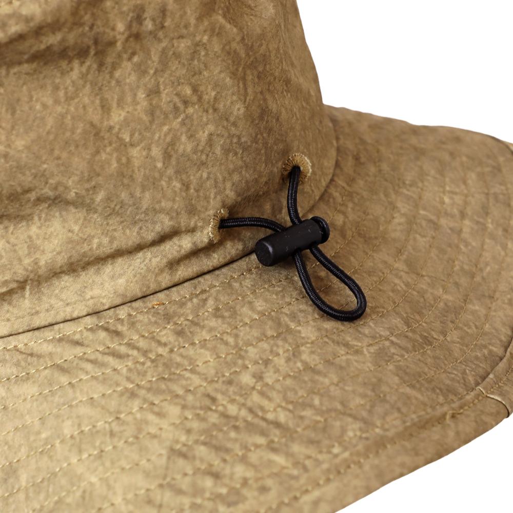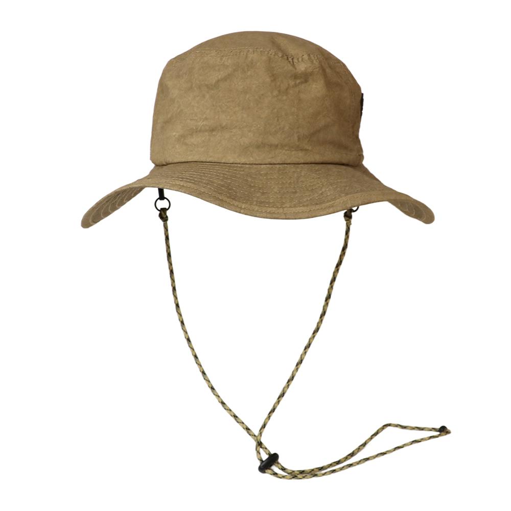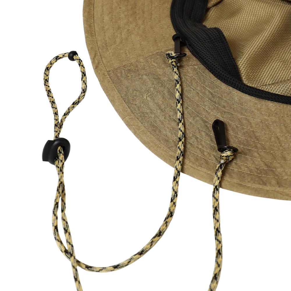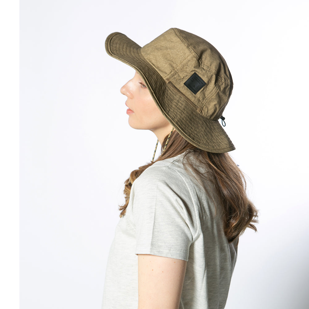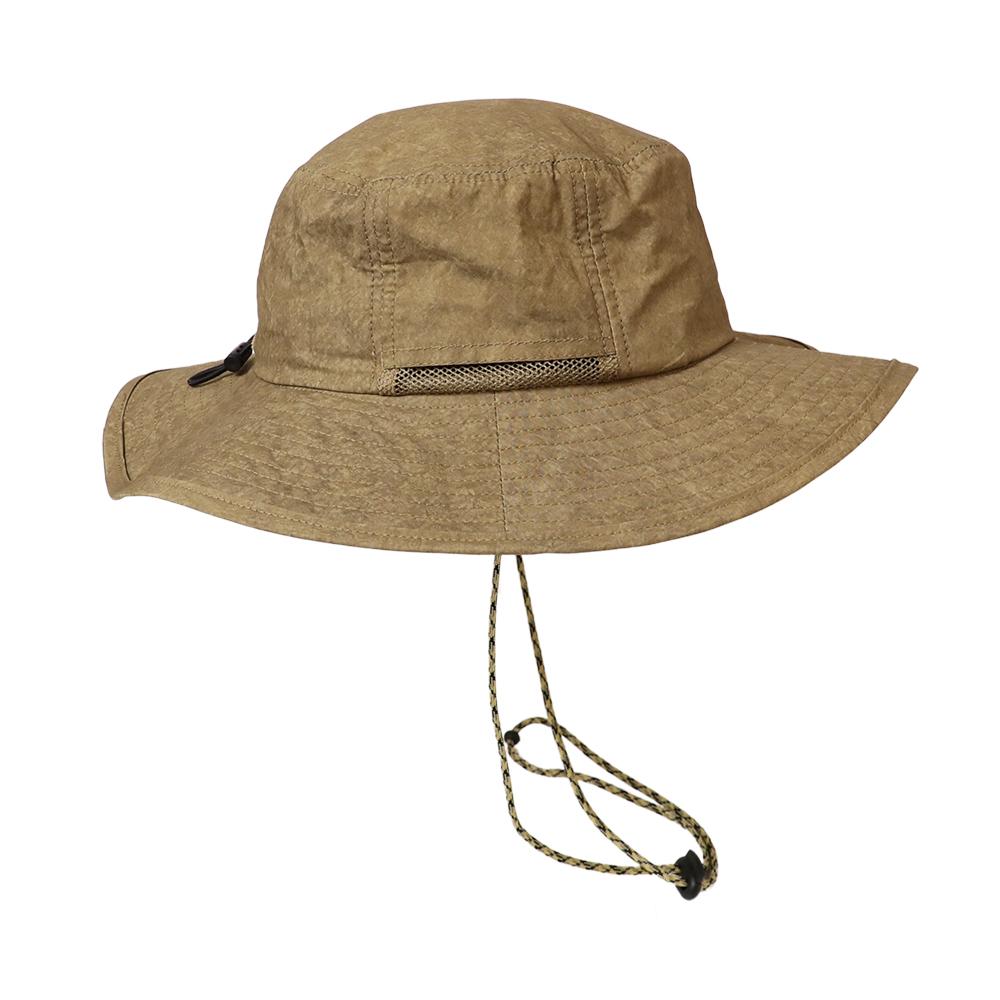 撥水加工を施した機能性に優れたアドベンチャーハットです。裏地のメッシュ素材と通気口で、爽やかな被り心地。あご紐が取り外せるのも嬉しいポイント。柔らかい素材感でコンパクトに折りたたんでの持ち運びにも便利です。後ろのつまみで多少のサイズ調節ができ、さらに手洗いも可能なので、いつでも清潔に保って頂けます。