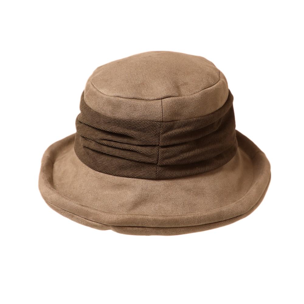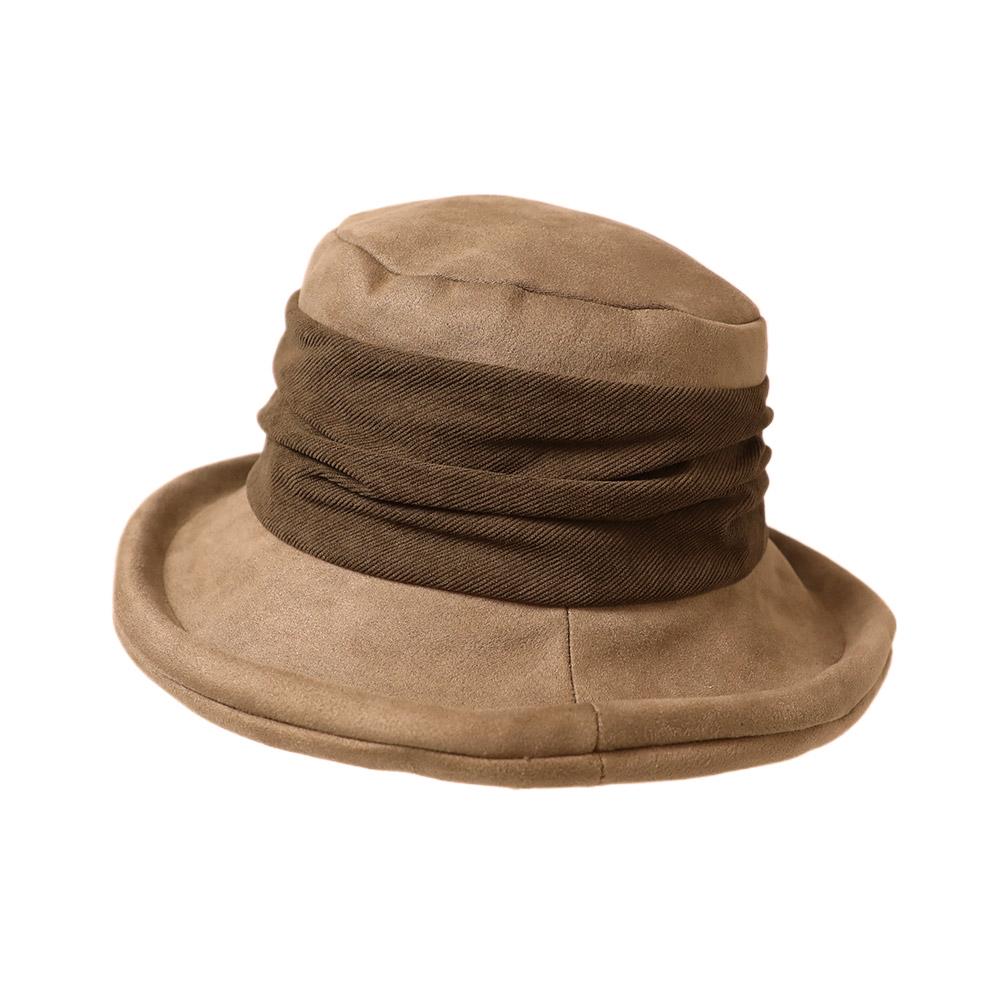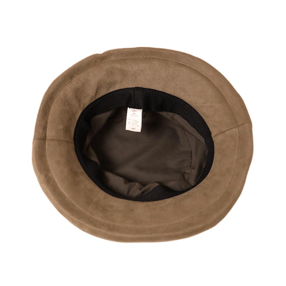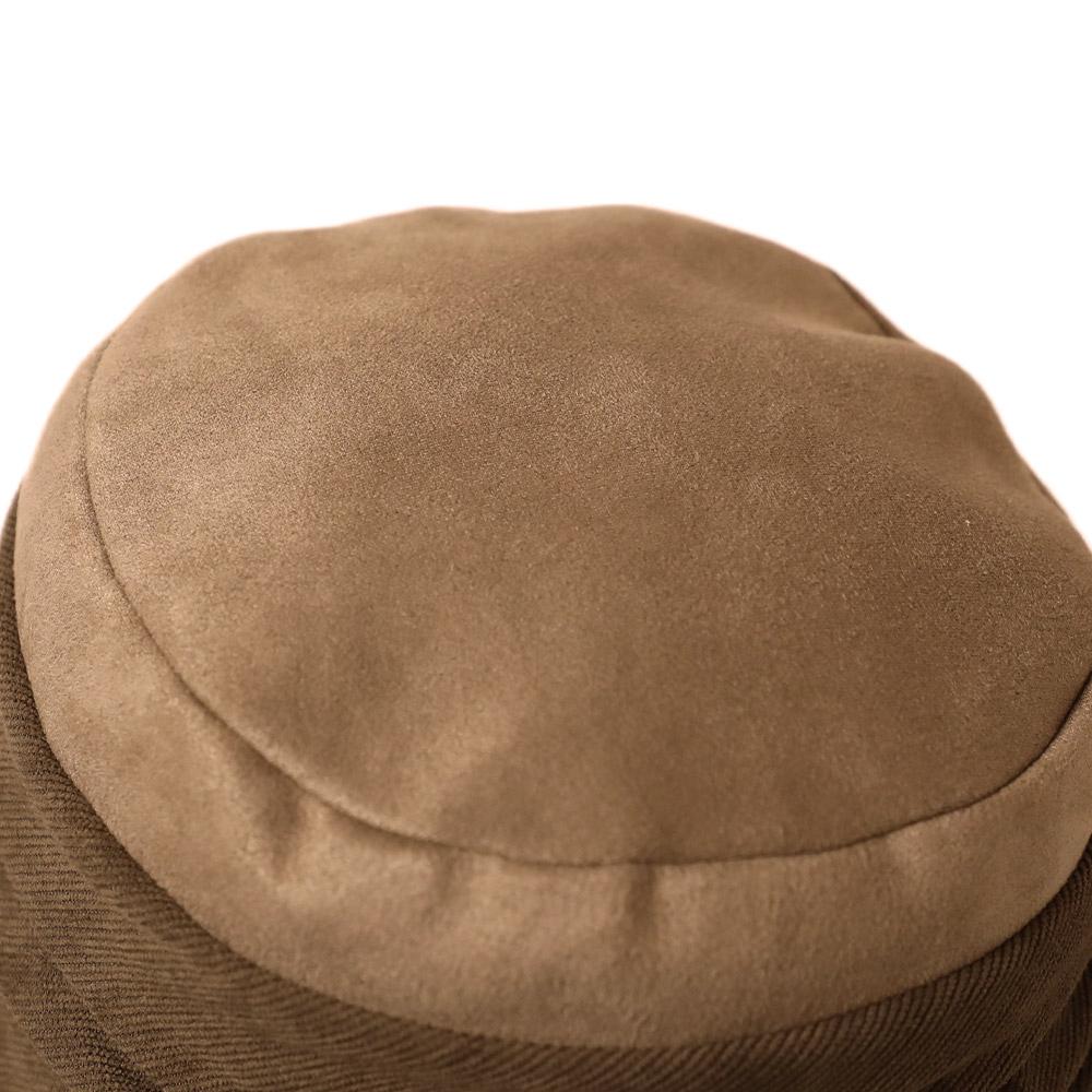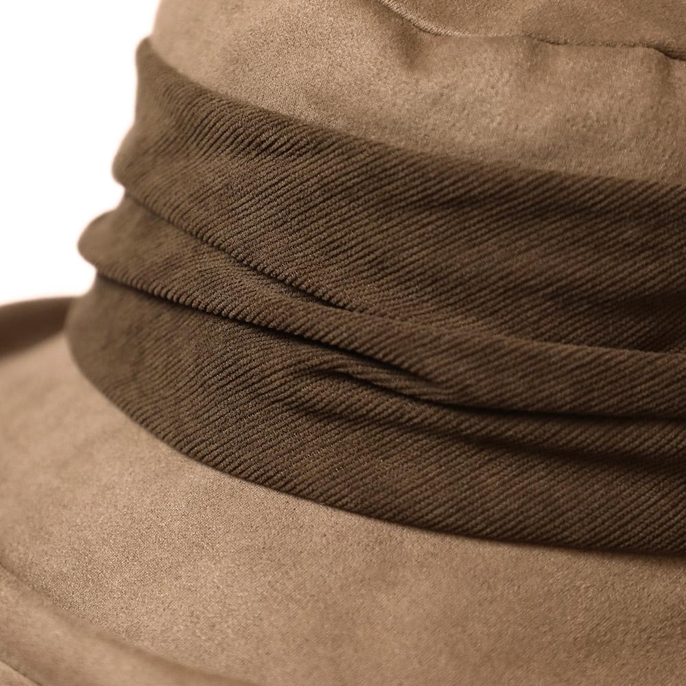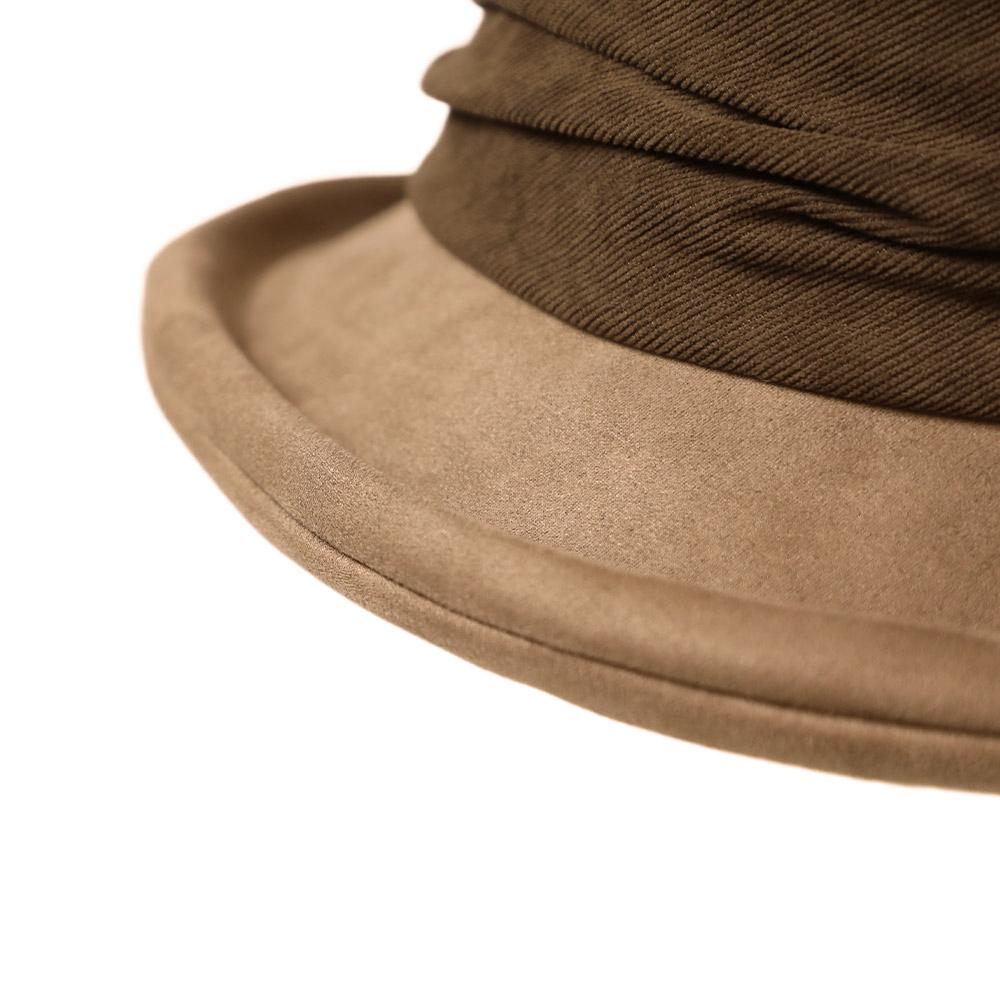 キレイめなスエードライクで出来ているハットですが同色コーデュロイのギャザーが程よくアクセントになってます。◎内側にあるすべりの裏側には、サイズを調節して頂けるテープが付いていますので ご自分のサイズ感で被って頂けます。