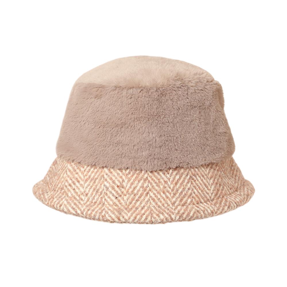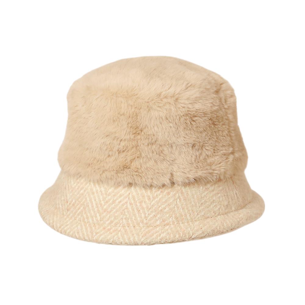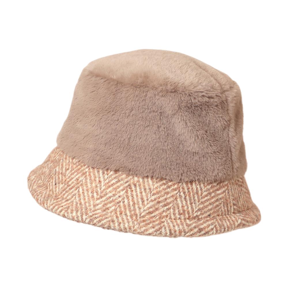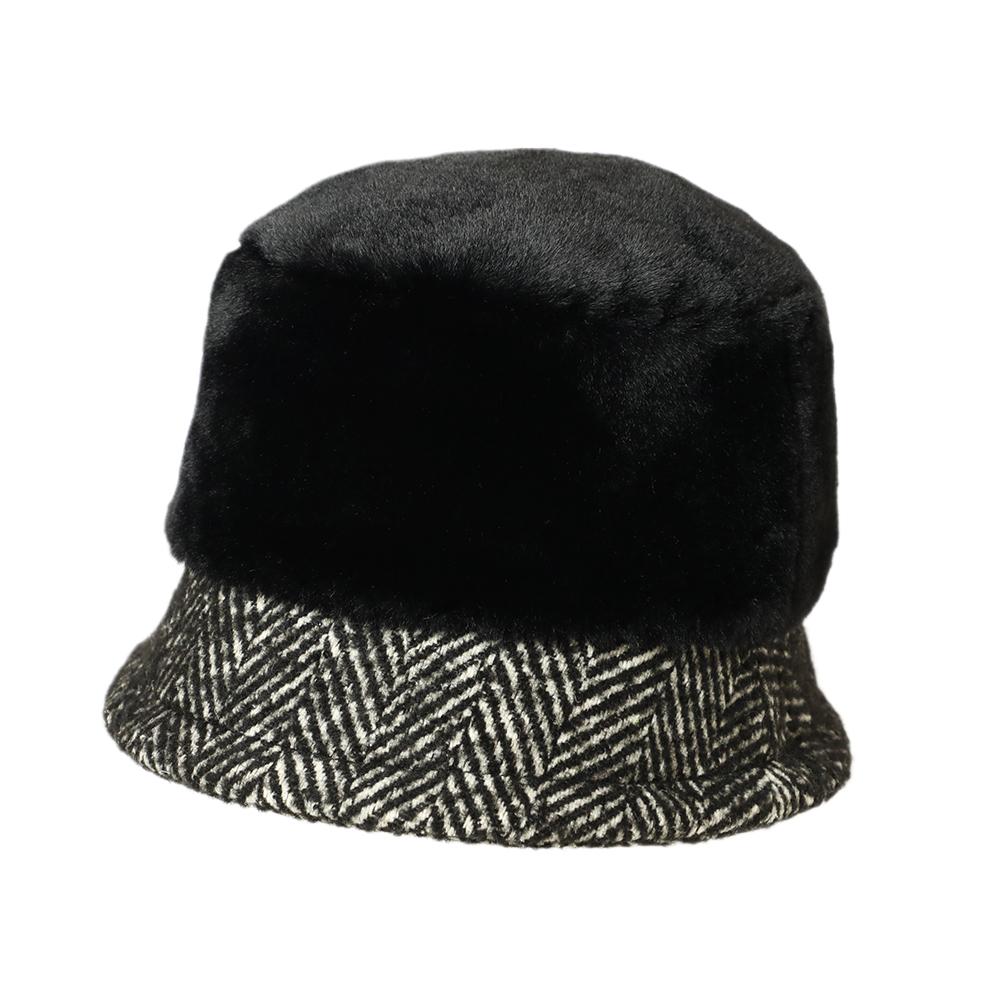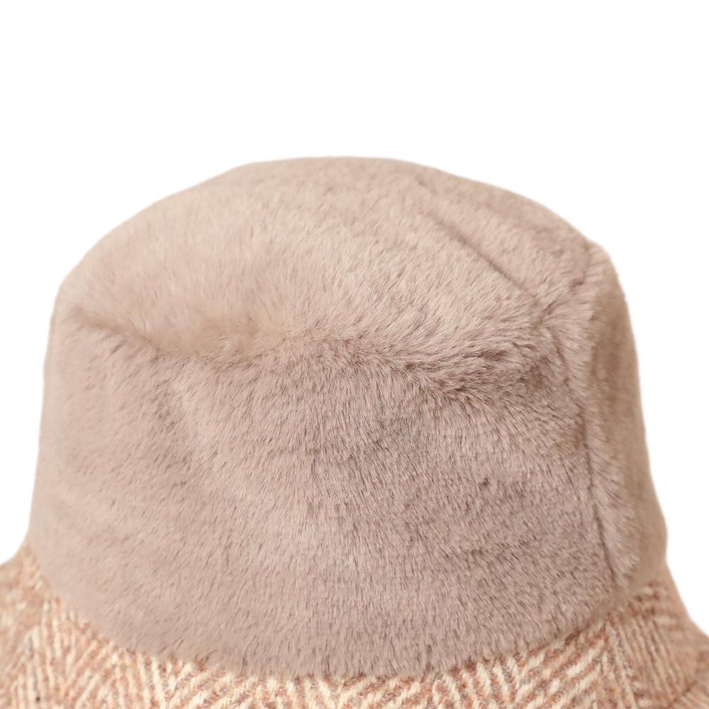 エコファーとヘリンボーン柄の組合せバケットハットです。全体的に柔らかい生地感で頭に馴染む被り心地です。手洗いできるのも嬉しいポイントです。◎内側にあるすべりの裏側には、サイズを調節して頂けるテープが付いていますので ご自分のサイズ感で被って頂けます。