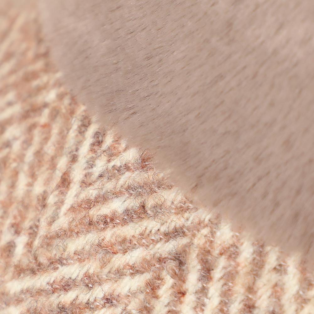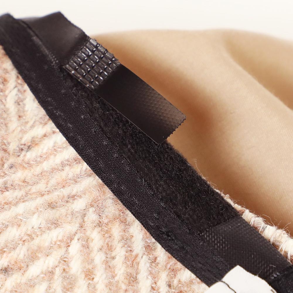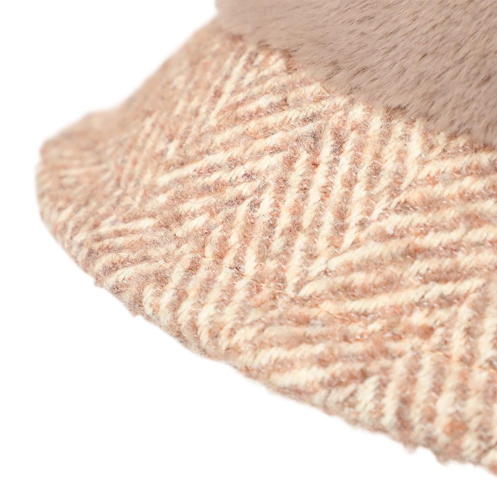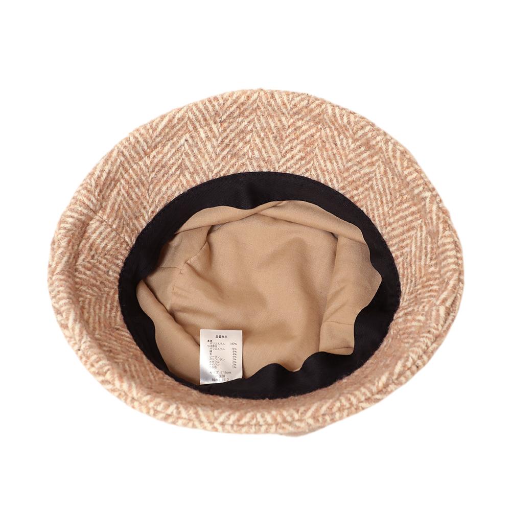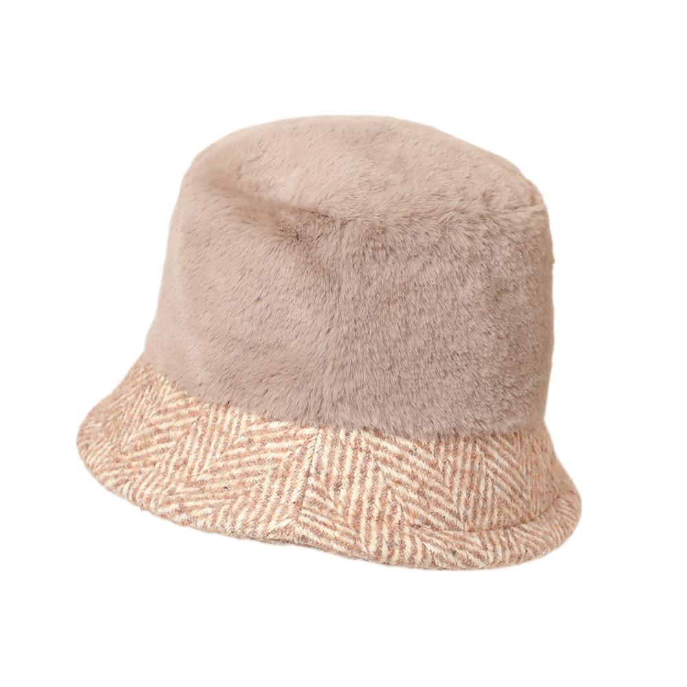 エコファーとヘリンボーン柄の組合せバケットハットです。全体的に柔らかい生地感で頭に馴染む被り心地です。手洗いできるのも嬉しいポイントです。◎内側にあるすべりの裏側には、サイズを調節して頂けるテープが付いていますので ご自分のサイズ感で被って頂けます。