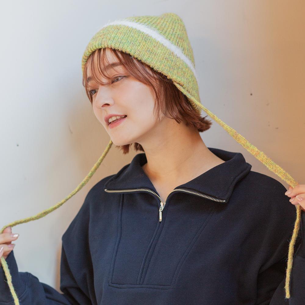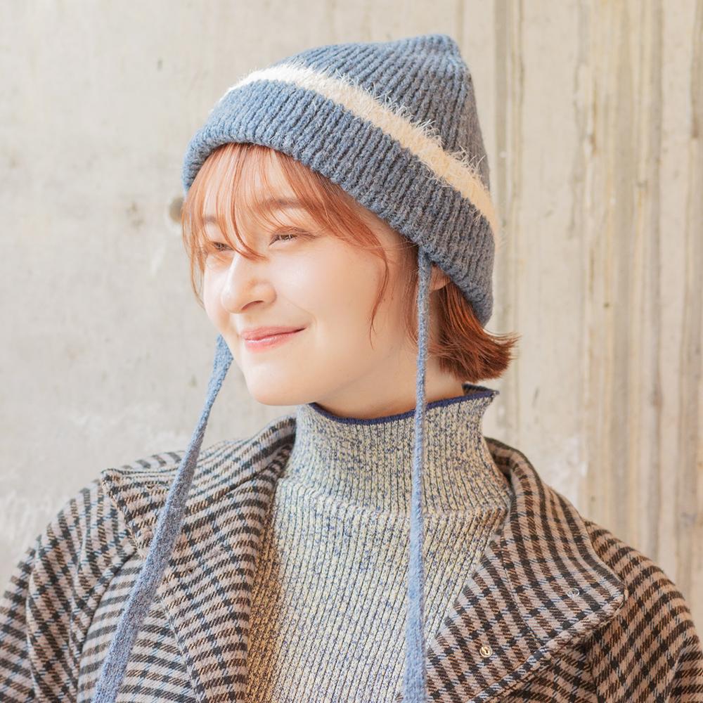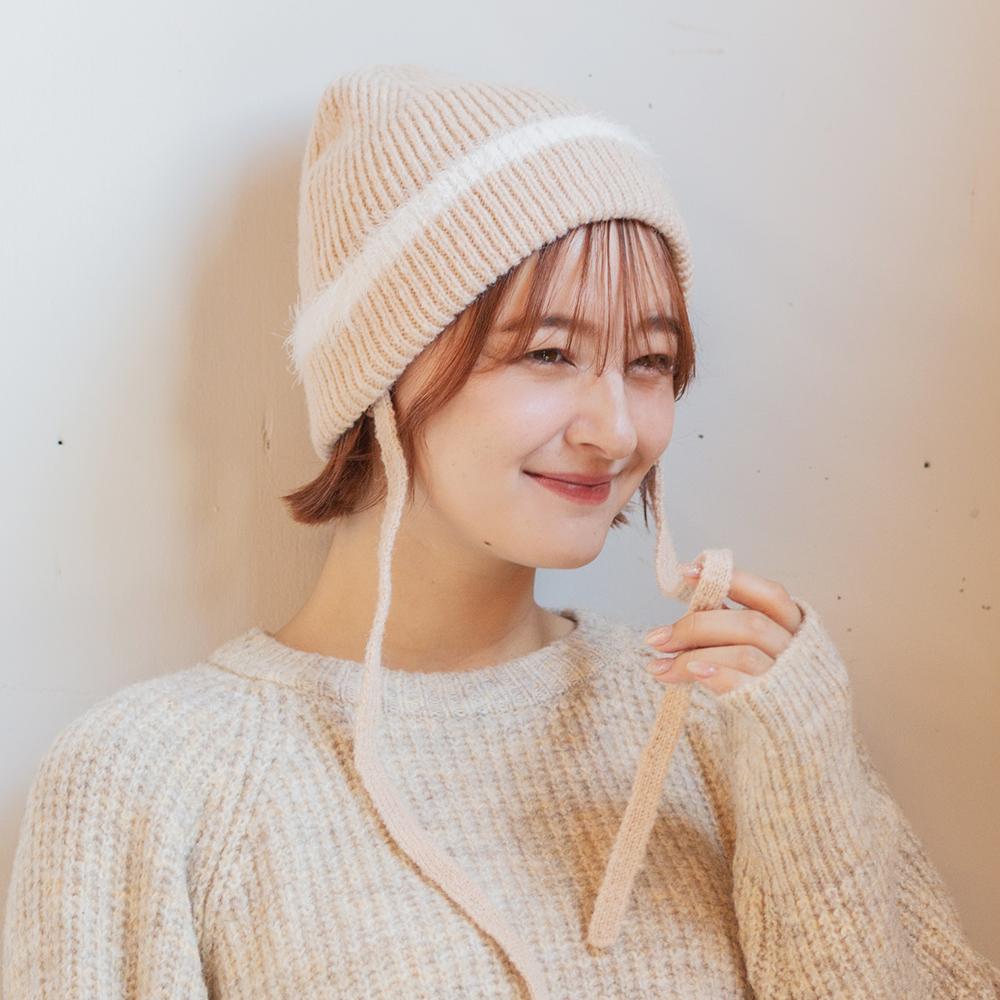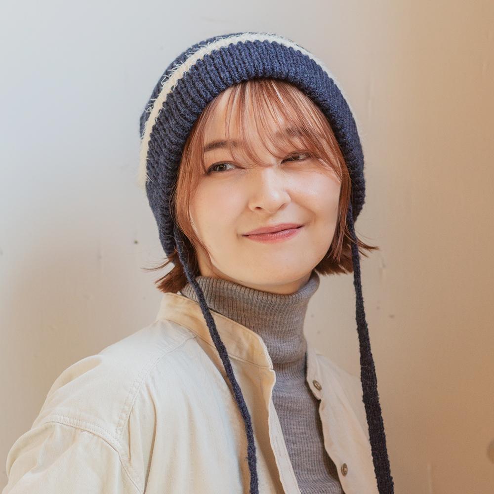 縁のシャギーラインと紐がアクセントのニットワッチです。トレンドの紐付きニット帽は被るだけで顔周りが華やかになり、おしゃれな雰囲気になります。紐は外せる仕様なので通常のニットワッチとしても被っていただけます。