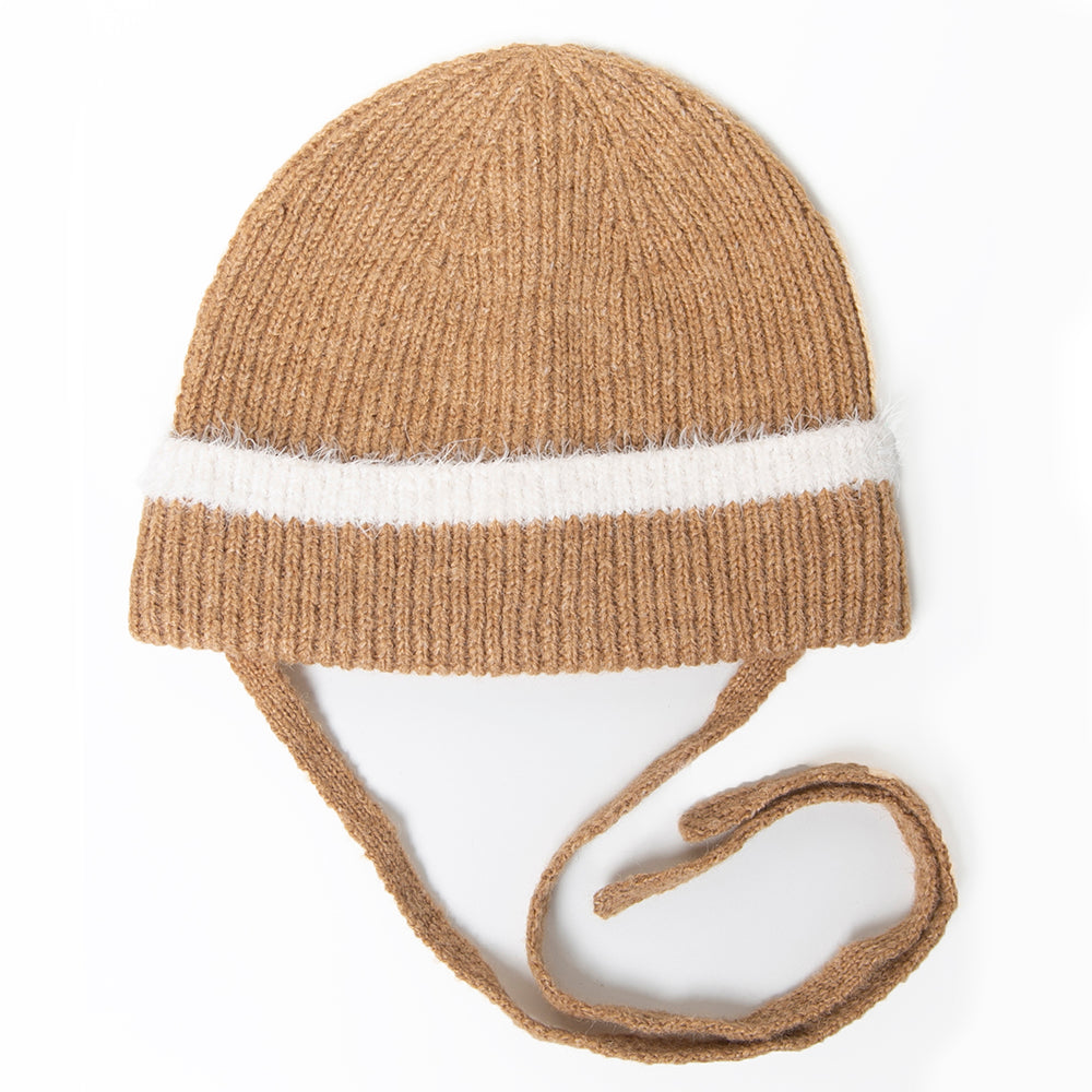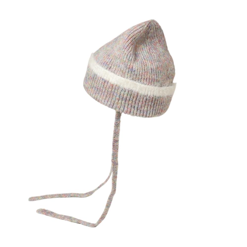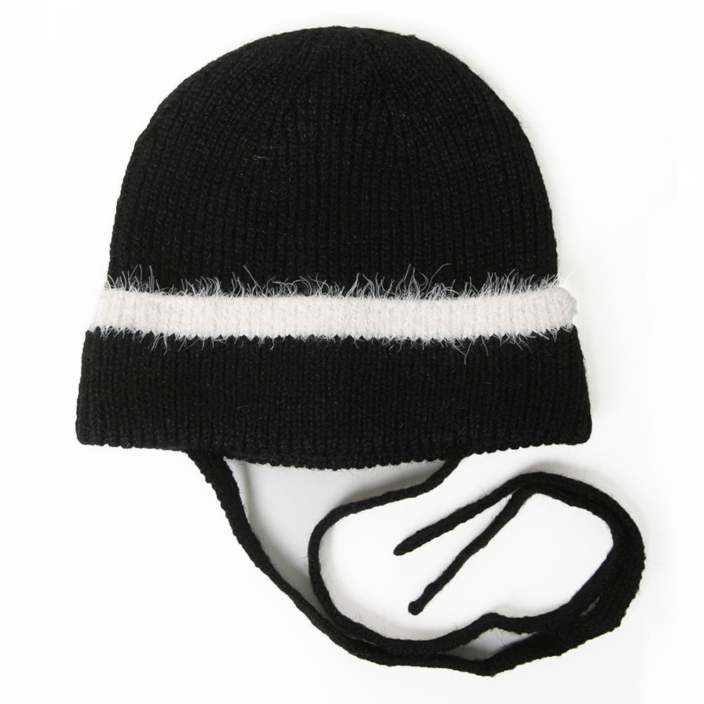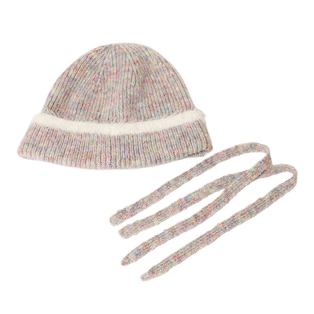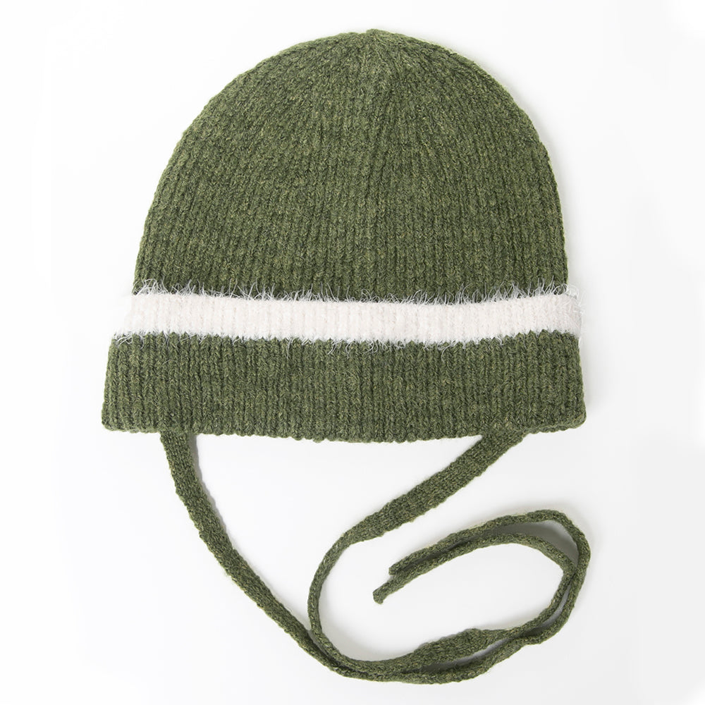 縁のシャギーラインと紐がアクセントのニットワッチです。トレンドの紐付きニット帽は被るだけで顔周りが華やかになり、おしゃれな雰囲気になります。紐は外せる仕様なので通常のニットワッチとしても被っていただけます。