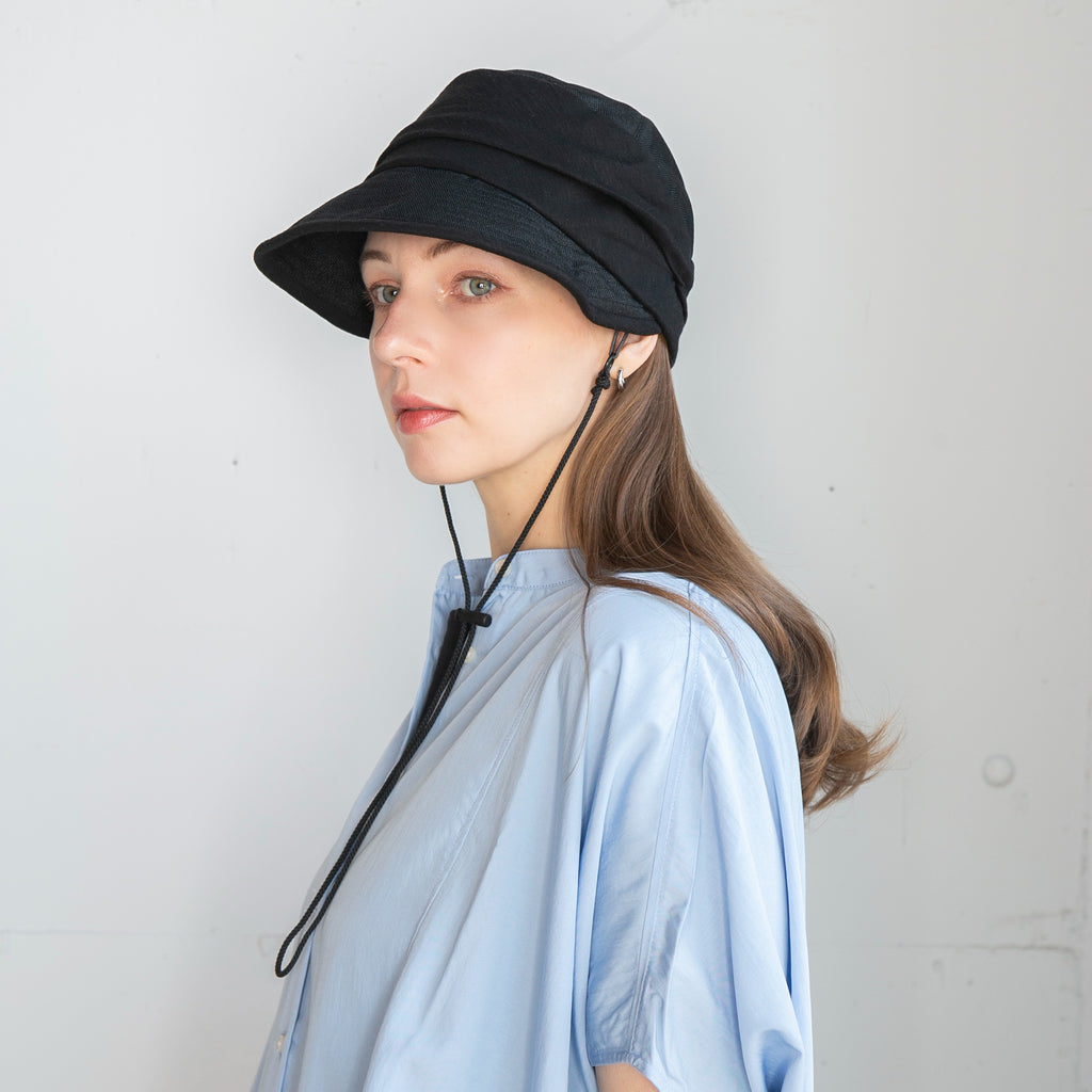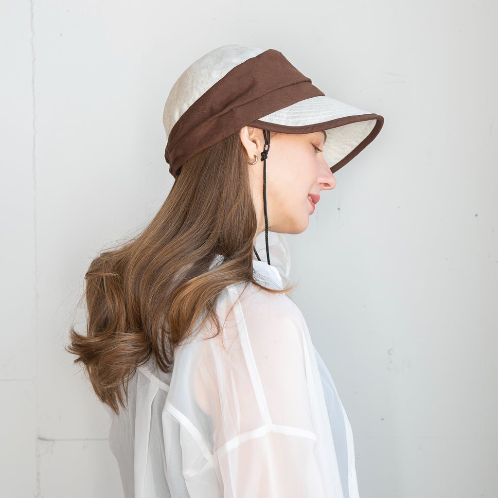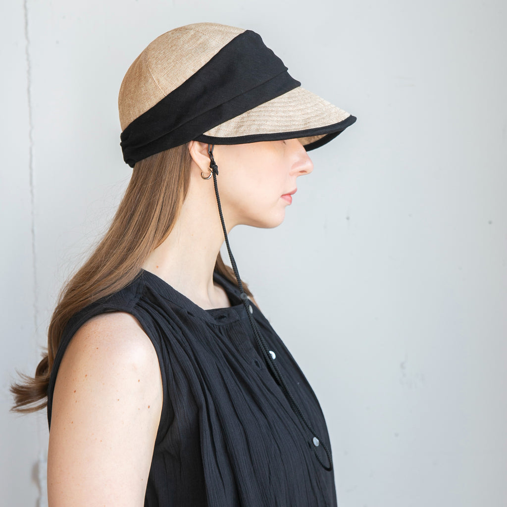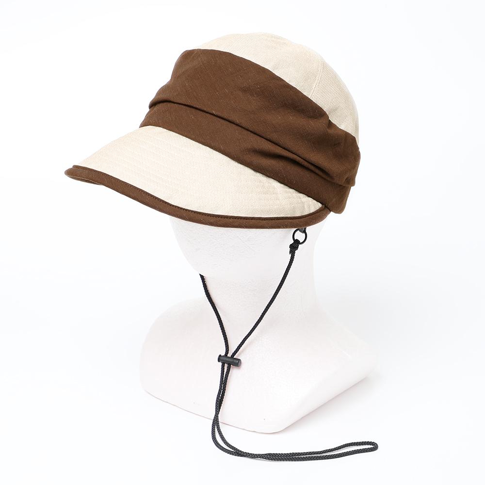 ポリジュートの素材とすっきりしたデザインが涼し気なジョッキーキャップです。ジョッキーキャップの特徴の下を向いた長めのつばで顔にしっかり日陰を作ってくれます。◎あご紐、日除け垂れ用ループ付き(日除け垂れはついていません。)◎内側にあるすべりの裏側には、サイズを調節して頂けるテープが付いていますので ご自分のサイズ感で被って頂けます。◎手洗いも可能なので、いつでも清潔に保って頂けます。