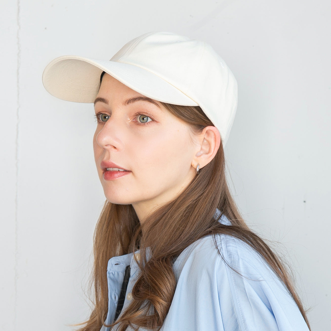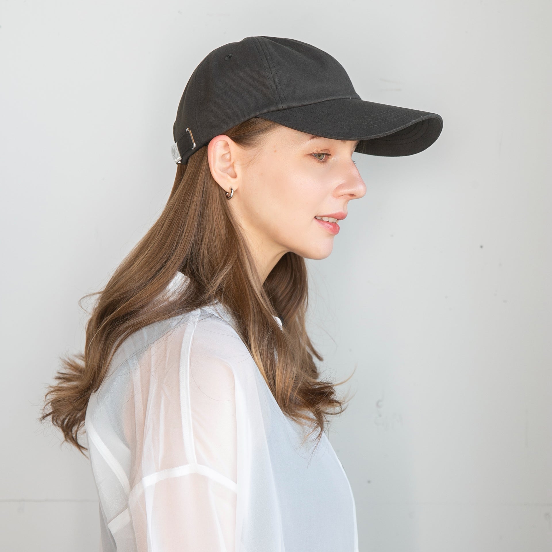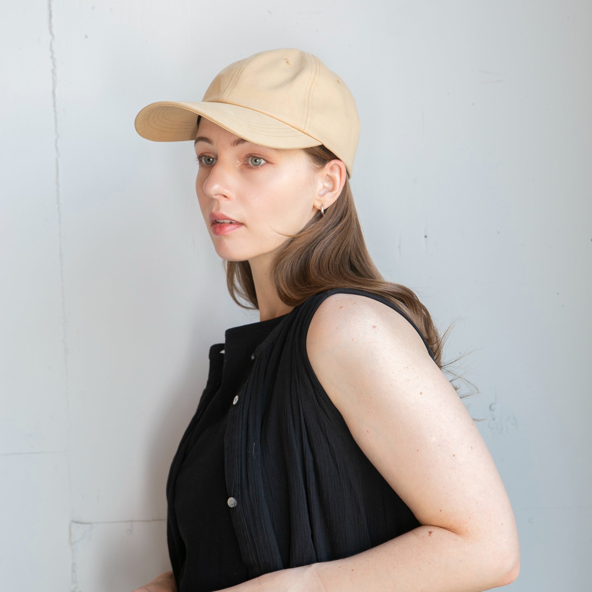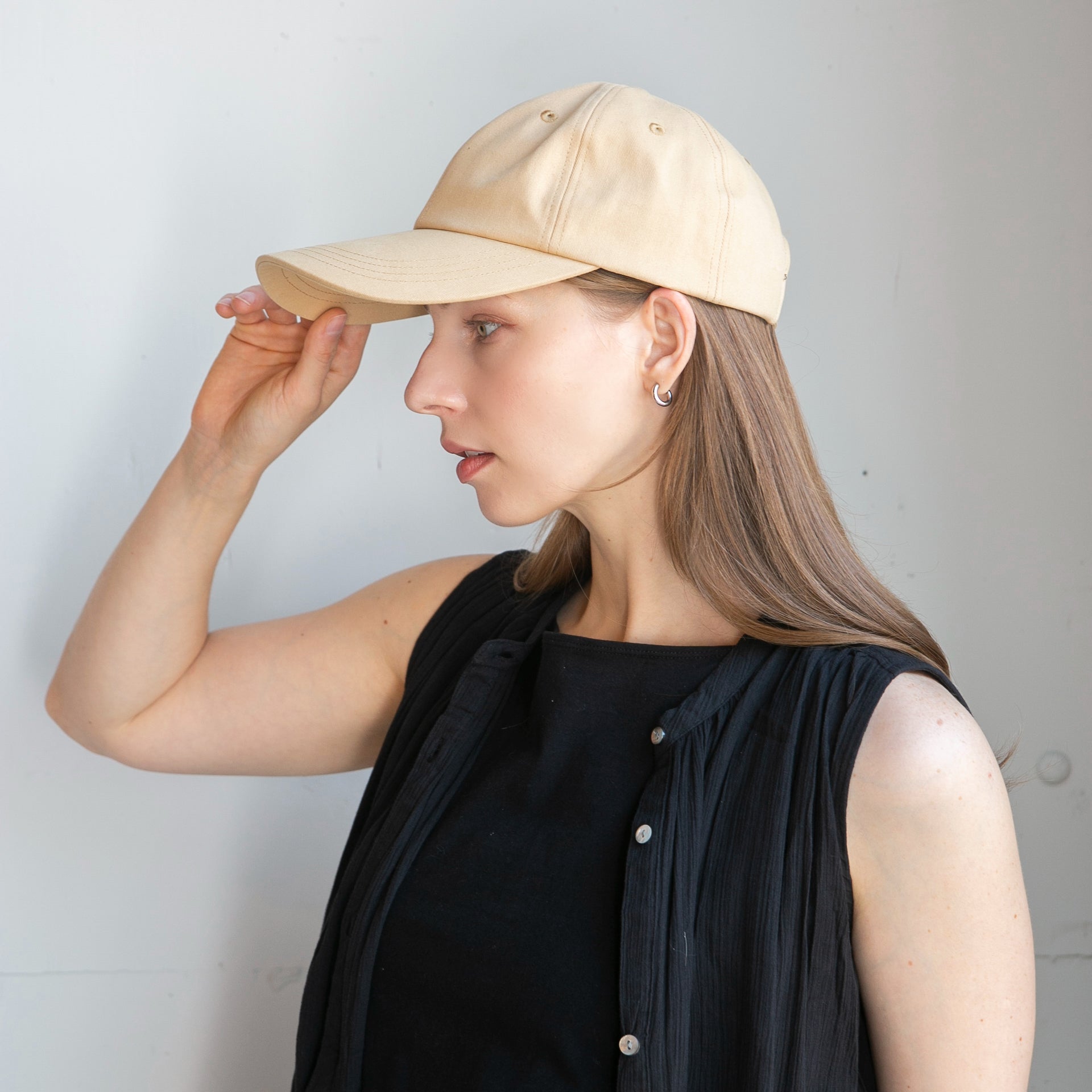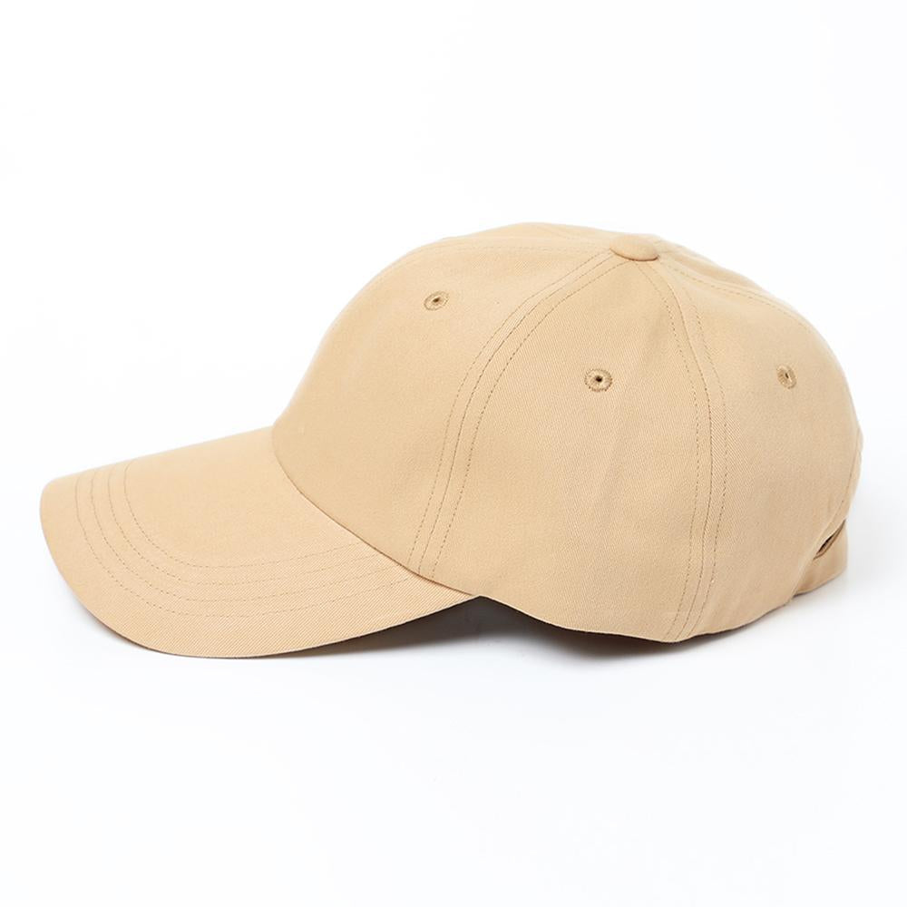 つば長めのシンプルコットンキャップです。キャップでカジュアルにUVケアしたい方にロングバイザーは最適なデザインです。
