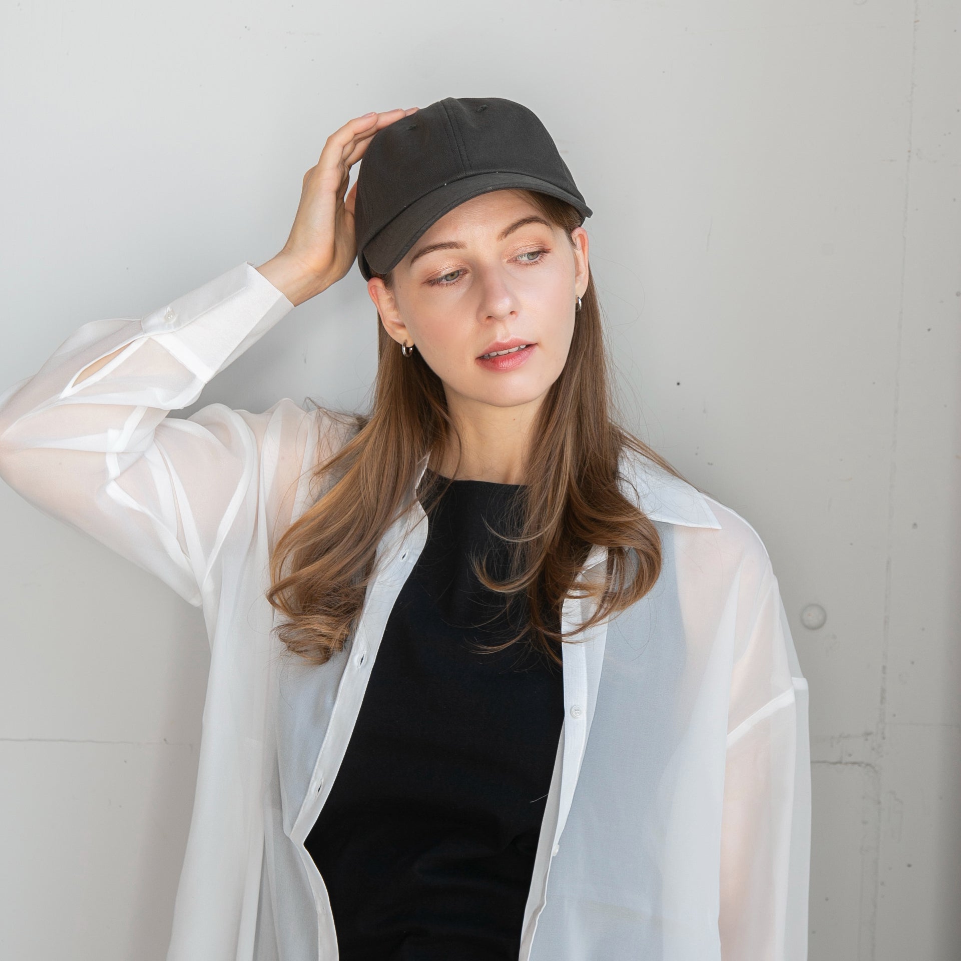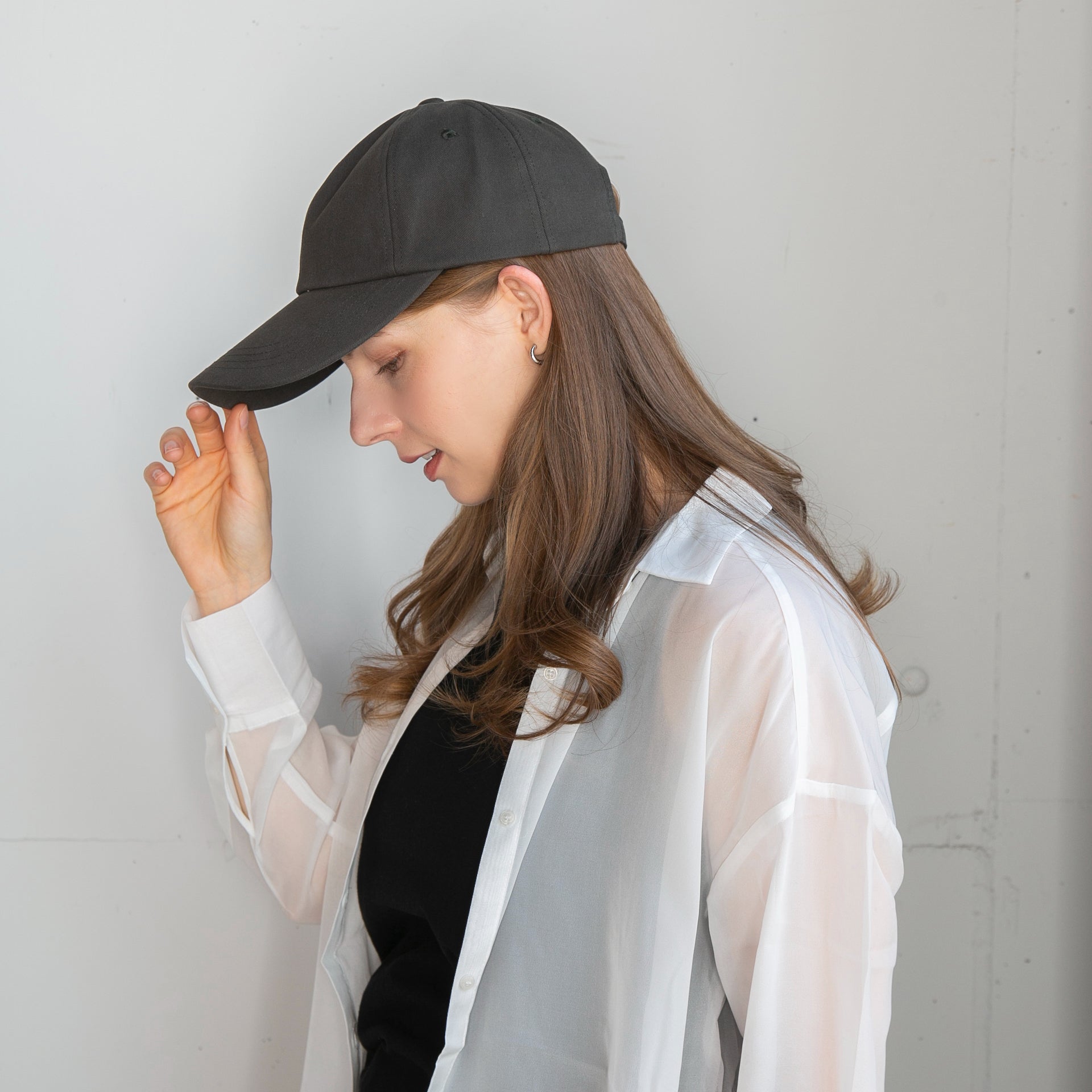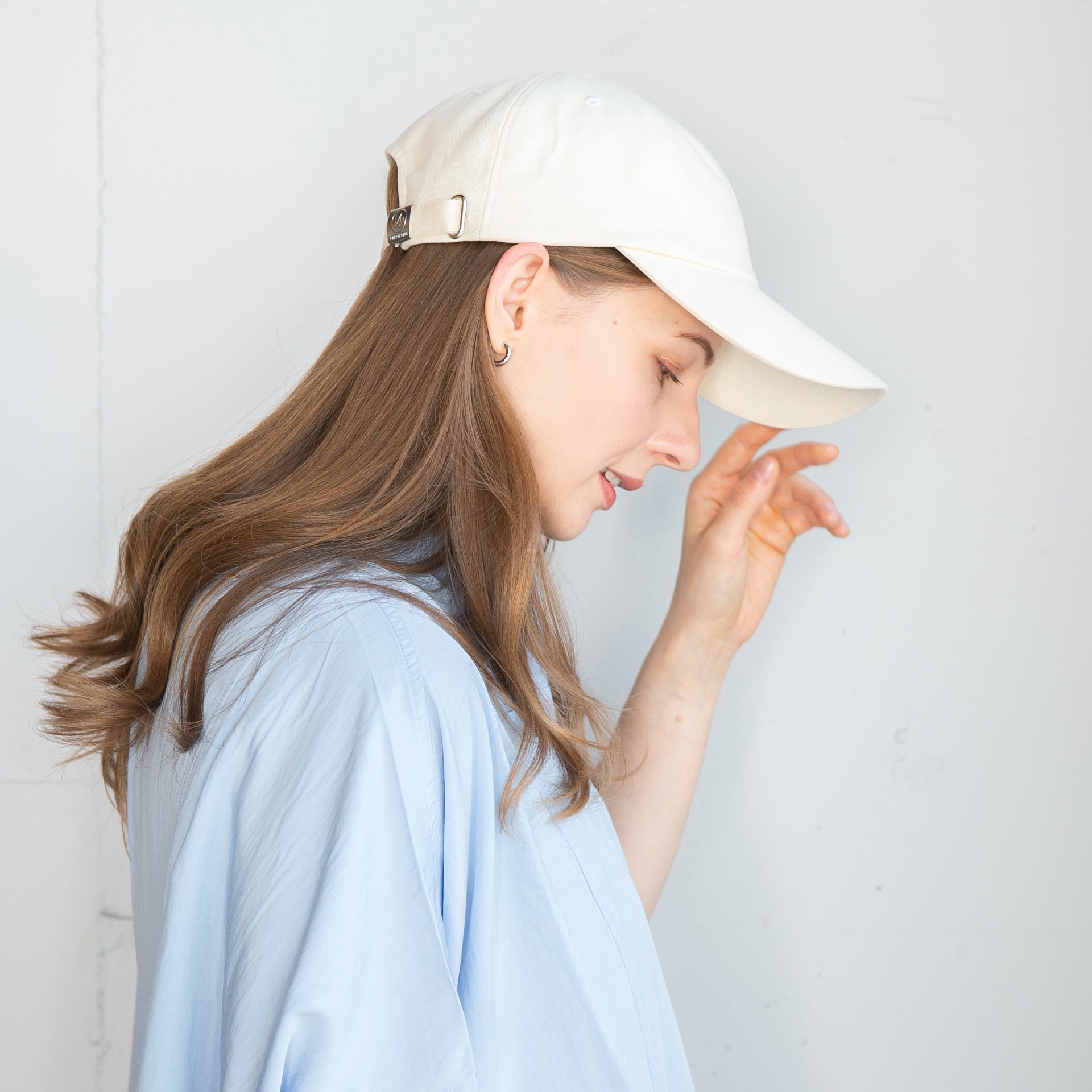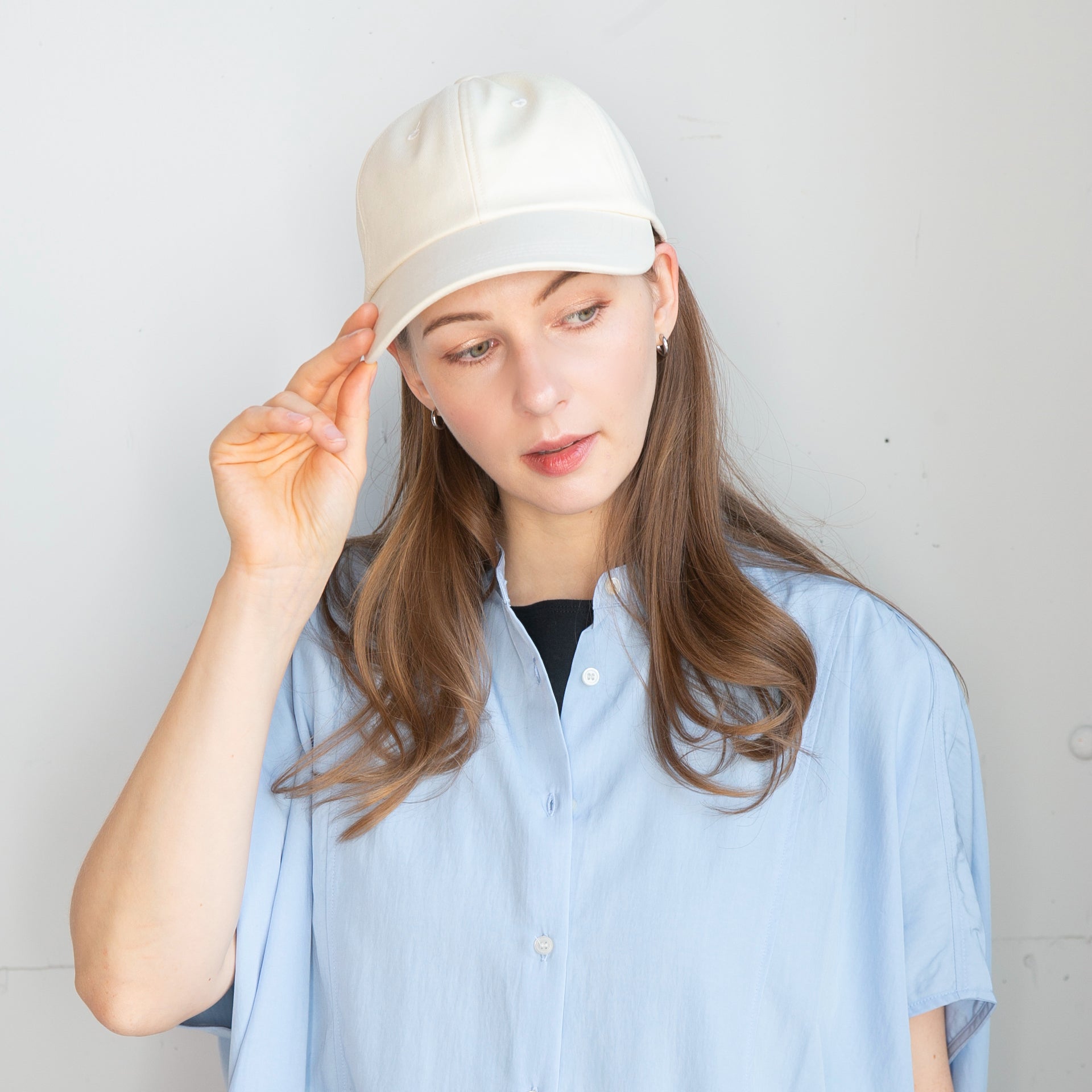 つば長めのシンプルコットンキャップです。キャップでカジュアルにUVケアしたい方にロングバイザーは最適なデザインです。