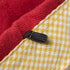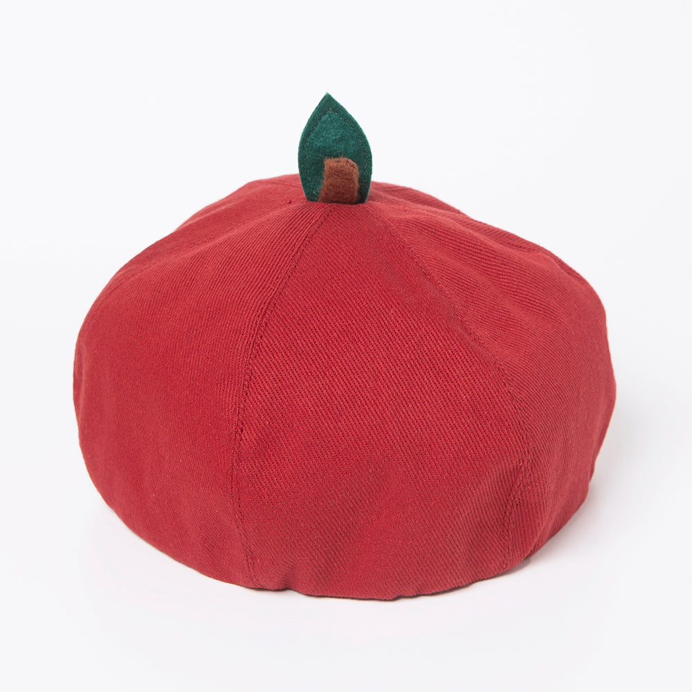キッズの可愛さ倍増!コットン素材のりんごベレー帽です。布帛を縫い合わせた丸みのある形で、ポンと頭にのせるだけでスタイリング完成。素材はコットン100%のキャンバス布のようなしっかりした生地で、オールシーズンOKです。キュートなチェック柄の裏地で被り心地も抜群。内側にあるすべりの裏側のテープでサイズを調節も可能です。ネームタグ付き。